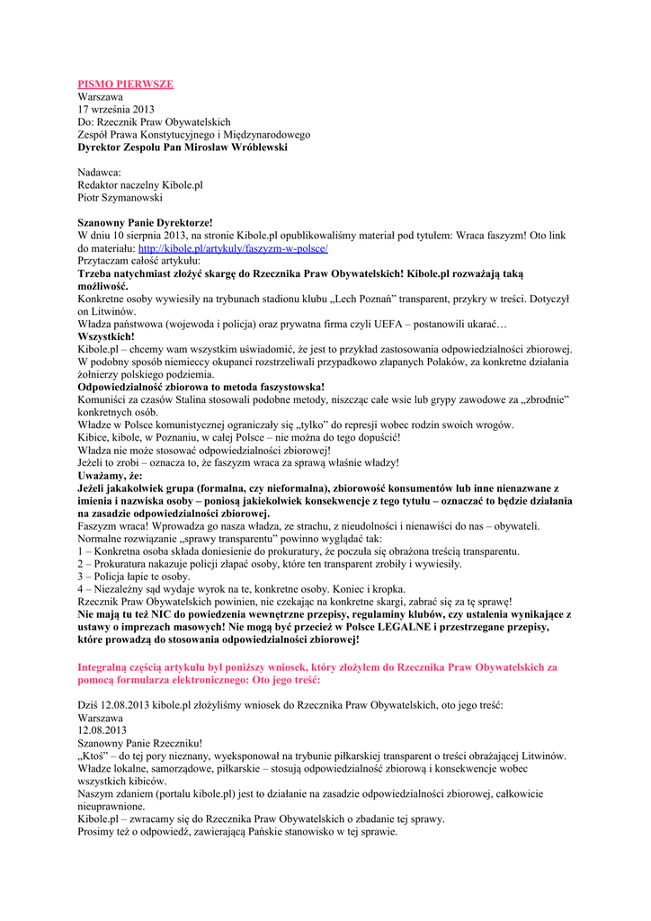 PISMO PIERWSZE Warszawa 17 września 2013 Do: Rzecznik Praw Obywatelskich Zespół Prawa Konstytucyjnego i Międzynarodowego Dyrektor Zespołu Pan Mirosław Wróblewski Nadawca: Redaktor naczelny Kibole.pl Piotr Szymanowski Szanowny Panie Dyrektorze! W dniu 10 sierpnia 2013, na stronie Kibole.pl opublikowaliśmy materiał pod tytułem: Wraca faszyzm! Oto link do materiału: http://kibole.pl/artykuly/faszyzm-w-polsce/ Przytaczam całość artykułu: Trzeba natychmiast złożyć skargę do Rzecznika Praw Obywatelskich! Kibole.pl rozważają taką możliwość. Konkretne osoby wywiesiły na trybunach stadionu klubu „Lech Poznań” transparent, przykry w treści. Dotyczył on Litwinów. Władza państwowa (wojewoda i policja) oraz prywatna firma czyli UEFA – postanowili ukarać… Wszystkich! Kibole.pl – chcemy wam wszystkim uświadomić, że jest to przykład zastosowania odpowiedzialności zbiorowej. W podobny sposób niemieccy okupanci rozstrzeliwali przypadkowo złapanych Polaków, za konkretne działania żołnierzy polskiego podziemia. Odpowiedzialność zbiorowa to metoda faszystowska! Komuniści za czasów Stalina stosowali podobne metody, niszcząc całe wsie lub grypy zawodowe za „zbrodnie” konkretnych osób. Władze w Polsce komunistycznej ograniczały się „tylko” do represji wobec rodzin swoich wrogów. Kibice, kibole, w Poznaniu, w całej Polsce – nie można do tego dopuścić! Władza nie może stosować odpowiedzialności zbiorowej! Jeżeli to zrobi – oznacza to, że faszyzm wraca za sprawą właśnie władzy! Uważamy, że: Jeżeli jakakolwiek grupa (formalna, czy nieformalna), zbiorowość konsumentów lub inne nienazwane z imienia i nazwiska osoby – poniosą jakiekolwiek konsekwencje z tego tytułu – oznaczać to będzie działania na zasadzie odpowiedzialności zbiorowej. Faszyzm wraca! Wprowadza go nasza władza, ze strachu, z nieudolności i nienawiści do nas – obywateli. Normalne rozwiązanie „sprawy transparentu” powinno wyglądać tak: 1 – Konkretna osoba składa doniesienie do prokuratury, że poczuła się obrażona treścią transparentu. 2 – Prokuratura nakazuje policji złapać osoby, które ten transparent zrobiły i wywiesiły. 3 – Policja łapie te osoby. 4 – Niezależny sąd wydaje wyrok na te, konkretne osoby. Koniec i kropka. Rzecznik Praw Obywatelskich powinien, nie czekając na konkretne skargi, zabrać się za tę sprawę! Nie mają tu też NIC do powiedzenia wewnętrzne przepisy, regulaminy klubów, czy ustalenia wynikające z ustawy o imprezach masowych! Nie mogą być przecież w Polsce LEGALNE i przestrzegane przepisy, które prowadzą do stosowania odpowiedzialności zbiorowej! Integralną częścią artykułu był poniższy wniosek, który złożyłem do Rzecznika Praw Obywatelskich za pomocą formularza elektronicznego: Oto jego treść: Dziś 12.08.2013 kibole.pl złożyliśmy wniosek do Rzecznika Praw Obywatelskich, oto jego treść: Warszawa 12.08.2013 Szanowny Panie Rzeczniku! „Ktoś” – do tej pory nieznany, wyeksponował na trybunie piłkarskiej transparent o treści obrażającej Litwinów. Władze lokalne, samorządowe, piłkarskie – stosują odpowiedzialność zbiorową i konsekwencje wobec wszystkich kibiców. Naszym zdaniem (portalu kibole.pl) jest to działanie na zasadzie odpowiedzialności zbiorowej, całkowicie nieuprawnione. Kibole.pl – zwracamy się do Rzecznika Praw Obywatelskich o zbadanie tej sprawy. Prosimy też o odpowiedź, zawierającą Pańskie stanowisko w tej sprawie. Pismo do Pana udostępniamy we wszystkich mediach, jakie zechcą je opublikować. Pańską odpowiedź także. Informację o braku Pańskiej odpowiedzi – również. Dlatego uprzejmie prosimy o potwierdzenie odebrania wiadomości. Podajmy link do naszej strony i artykułu na wspomniany temat: http://www.kibole.pl/artykuly/faszyzm-w-polsce/ Z wyrazami szacunku Kibole.pl PISMO DRUGIE W dniu 30 sierpnia 2013 otrzymałem odpowiedź. Jest nią Pańskie (Biura RPO) pismo skierowane do Wielkopolskiego Komendanta Policji oraz do wiadomości mojej. Oto ono: Warszawa, dnia 30 SIE. 2013 Biuro rzecznika praw obywatelskich RPO-746461-1/13/RG Zespół Prawa Konstytucyjnego i Międzynarodowego Pan insp. Rafał Batkowski Wielkopolski Komendant Wojewódzki Policji Komenda Wojewódzka Policji w Poznaniu ul. Kochanowskiego 2a 60-844 Poznań Uprzejmie informuję Pana Komendanta, iż na skutek skargi portalu internetowego Kibole.pl, Rzecznik Praw Obywatelskich na podstawie art. 9 pkt 1 ustawy z dnia 15 lipca 1987 roku o Rzeczniku Praw Obywatelskich (Dz. U. Z 2001 r. Nr 14, poz. 147 ze zm.), podjął czynności w sprawie grupy kibiców, którzy w dniu 8 sierpnia 2013 roku podczas meczu pomiędzy Lechem Poznań a Żalgiris Wilno, wywiesili transparent o treści poniżającej naród litewski. Powyższe zdarzenie, w ocenie Rzecznika, mogło m. in. Wyczerpywać znamiona czynu zabronionego stypizowanego w art. 257 kodeksu karnego. Dlatego też, Rzecznik Praw Obywatelskich, także jako organ wykonujący zadania dotyczące realizacji zasady równego traktowania, postanowił zwrócić się w tej sprawie do Pana Komendanta. Na mocy ustawy z dnia 3 grudnia 2010 roku o wdrożeniu niektórych przepisów Unii Europejskiej w zakresie równego traktowania (t. j.: Dz. U. Nr 254, poz. 1700), Rzecznikowi Praw Obywatelskich powierzono wykonywanie zadań dotyczących realizacji zasady równego traktowania. W zakresie podstawowych zadań Rzecznika pozostaje rozpatrywanie kierowanych do niego wniosków, w tym skarg dotyczących naruszenia zasady równego traktowania, i podejmowanie odpowiednich czynności, zgodnie z ustawą z dnia 15 lipca 1987 roku o Rzeczniku Praw Obywatelskich. Wobec powyższego, z upoważnienia Rzecznika Praw Obywatelskich, na podstawie art. 13 ust. 1 pkt 3 ustawy z dnia 15 lipca 1987 roku o Rzeczniku Praw Obywatelskich, zwracam się z uprzejmą prośbą o przedłożenie Rzecznikowi informacji na jakim etapie znajduje się przedmiot