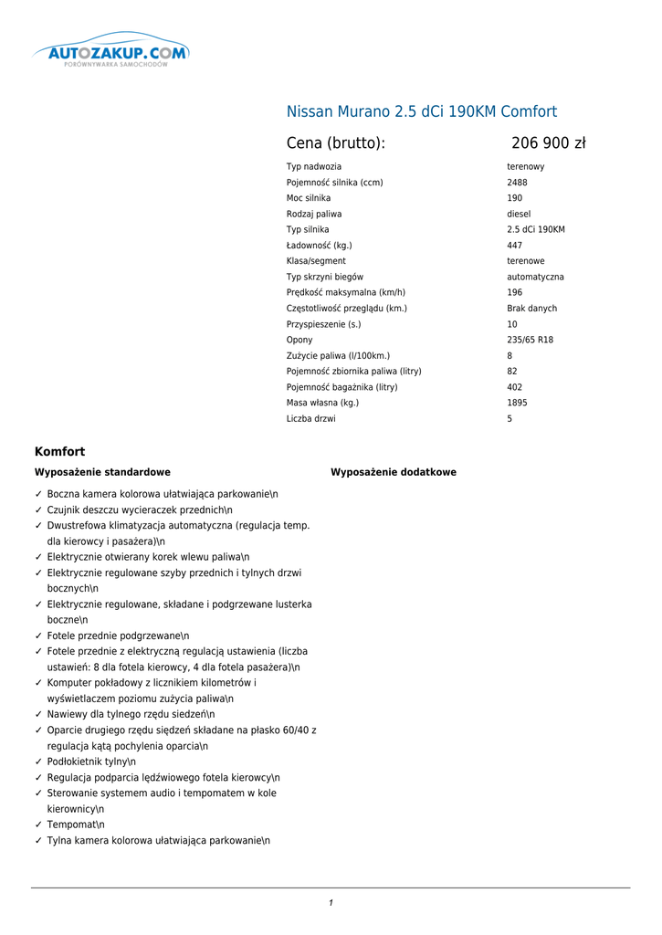 Nissan Murano 2.5 dCi 190KM Comfort Cena (brutto): 206 900 zł Typ nadwozia terenowy Pojemność silnika (ccm) 2488 Moc silnika 190 Rodzaj paliwa diesel Typ silnika 2.5 dCi 190KM Ładowność (kg.) 447 Klasa/segment terenowe Typ skrzyni biegów automatyczna Prędkość maksymalna (km/h) 196 Częstotliwość przeglądu (km.) Brak danych Przyspieszenie (s.) 10 Opony 235/65 R18 Zużycie paliwa (l/100km.) 8 Pojemność zbiornika paliwa (litry) 82 Pojemność bagażnika (litry) 402 Masa własna (kg.) 1895 Liczba drzwi 5 Komfort Wyposażenie standardowe Wyposażenie dodatkowe ✓ Boczna kamera kolorowa ułatwiająca parkowanie\n ✓ Czujnik deszczu wycieraczek przednich\n ✓ Dwustrefowa klimatyzacja automatyczna (regulacja temp. dla kierowcy i pasażera)\n ✓ Elektrycznie otwierany korek wlewu paliwa\n ✓ Elektrycznie regulowane szyby przednich i tylnych drzwi bocznych\n ✓ Elektrycznie regulowane, składane i podgrzewane lusterka boczne\n ✓ Fotele przednie podgrzewane\n ✓ Fotele przednie z elektryczną regulacją ustawienia (liczba ustawień: 8 dla fotela kierowcy, 4 dla fotela pasażera)\n ✓ Komputer pokładowy z licznikiem kilometrów i wyświetlaczem poziomu zużycia paliwa\n ✓ Nawiewy dla tylnego rzędu siedzeń\n ✓ Oparcie drugiego rzędu siędzeń składane na płasko 60/40 z regulacja kątą pochylenia oparcia\n ✓ Podłokietnik tylny\n ✓ Regulacja podparcia lędźwiowego fotela kierowcy\n ✓ Sterowanie systemem audio i tempomatem w kole kierownicy\n ✓ Tempomat\n ✓ Tylna kamera kolorowa ułatwiająca parkowanie\n 1 ✓ Wspomaganie układu kierowniczego, koło kierownicy regulowane w dwóch płaszczyznach\n Bezpieczeństwo Wyposażenie standardowe Wyposażenie dodatkowe ✓ 2 boczne poduszki powietrzne w zewnętrznych bokach oparć przednich foteli\n ✓ 2 czołowe poduszki powietrzne (kierowcy i pasażera)\n ✓ 2 poduszki powietrzne kurtynowe (dla wszystkich rzędów siedzeń)\n ✓ Aktywny Mechanizm Różnicowy LSD (Active Break Limited Slip Differential)\n ✓ Elektronicznie Sterowany System Stabilizacji Toru Jazdy (ESP)\n ✓ Ksenonowe lampy przednie z systemem automatycznego poziomowania\n ✓ Przednie lampy przeciwmgłowe\n ✓ Przednie pasy bezpieczeństwa z napinaczami oraz ogranicznikami siły napięcia\n ✓ System mocowania fotelików ISOFIX (skrajne fotele drugiego rzędu)\n ✓ System przeciwdziałający blokowaniu kół podczas hamowania (ABS) z system rozdziału siły hamowania (EBD)\n ✓ Trzypunktowe pasy bezpieczeństwa dla wszystkich miejsc\n ✓ Układ napędu ALL-MODE 4x4-i\n Dodatki Wyposażenie standardowe Wyposażenie dodatkowe ✓ 12V gniazdko w schowku przed kierowca oraz w przestrzeni ✕ Lakier metalizowany 4200 PLN bagażowej ✓ 18" chromowane felgi ze stopów metali lekkich, opony ✕ NISSAN 5 Rozszerzona Gwarancja do 4 lat lub 100 000 km 235/65 R18 ✓ 2 końcówki układu wydechowego, chromowane 2110 PLN ✕ NISSAN 5 Rozszerzona Gwarancja do 5 lat lub 150 000 km 5440 PLN ✓ Aktywne zagłówki foteli przednich ✕ Tylny zestaw DVD z monitorami w zagłówkach 8397 PLN ✓ Automatycznie ściemniające się lusterko wsteczne\n ✓ Centralny zamek\n ✓ Chromowane elementy stylizujące dolnej części drzwi\n ✓ Delikatne oświetlenie wnętrza\n ✓ Gniazdo VTR Jack - AUX\n ✓ Immobilizer\n ✓ Klamki wewnętrzne w kolorze srebrnym\n ✓ Klamki zewnętrzne chromowane\n ✓ Koło kierownicy, gałka dźwigni zmiany biegów pokryte skórą\n ✓ 2 Lampki do czytania z przodu\n 3 ✓ Oświetlenie przestrzeni bagażowej\n ✓ Ozdobne nakładki progów\n ✓ Podłokietnik przedni z dwupoziomowym schowkiem oraz regulacja zasięgu\n ✓ Reflektory do jazdy dziennej\n ✓ Relingi dachowe czarne\n ✓ Siatka do mocowania bagażu z przestrzeni bagażowej\n ✓ Skórzane siedzenia (połączenie skóry z innymi materiałami tam gdzie wymagają tego względy techniczne)\n ✓ System audio: Radioodtwarzacz CD z zestawem muzycznym o pojemności 2GB\n ✓ System Bluetooth\n ✓ System Inteligentnego Kluczyka\n ✓ System Kontroli Trakcji (TCS)\n ✓ System nawigacji satelitarnej HDD Birdview wyposażony w obsługę kanału informacji drogowych TMC(Traffic Message Channel), 7" kolorowy ekran, MP3, USB i zestaw muzyczny o pojemności 9.3GB\n ✓ System rozpoznawania głosu\n ✓ Szyby tylne, boczne oraz szyba tylna przyciemniane\n ✓ Tylne lampy w technologii LED\n ✓ Tylny spoiler dachowy\n ✓ Zasłona przestrzeni bagażowej (roleta)\n Doprecyzowanie oferty Kontakt: Nazwa użytkownika: admin Nazwa firmy: qqq Adres: qqq 12, 41-706 qqq1, NIP: 954 REGON: 1 Telefon: 123, 1 Fax: 1 Email: 1 www: 4