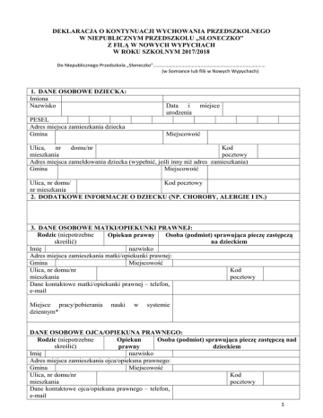 DEKLARACJA O KONTYNUACJI WYCHOWANIA PRZEDSZKOLNEGO W NIEPUBLICZNYM PRZEDSZKOLU „SŁONECZKO” Z FILĄ W NOWYCH WYPYCHACH W ROKU SZKOLNYM 2017/2018 Do Niepublicznego Przedszkola „Słoneczko”……………………………………………………………………………… (w Somiance lub filii w Nowych Wypychach) 1. DANE OSOBOWE DZIECKA: Imiona Nazwisko Data i urodzenia PESEL Adres miejsca zamieszkania dziecka Gmina miejsce Miejscowość Ulica, nr domu/nr Kod mieszkania pocztowy Adres miejsca zameldowania dziecka (wypełnić, jeśli inny niż adres zamieszkania) Gmina Miejscowość Ulica, nr domu/ Kod pocztowy nr mieszkania 2. DODATKOWE INFORMACJE O DZIECKU (NP. CHOROBY, ALERGIE I IN.) 3. DANE OSOBOWE MATKI/OPIEKUNKI PRAWNEJ: Rodzic (niepotrzebne Opiekun prawny Osoba (podmiot) sprawująca pieczę zastępczą skreślić) na dzieckiem Imię nazwisko Adres miejsca zamieszkania matki/opiekunki prawnej: Gmina Miejscowość Ulica, nr domu/nr Kod mieszkania pocztowy Dane kontaktowe matki/opiekunki prawnej – telefon, e-mail Miejsce pracy/pobierania dziennym* nauki w systemie DANE OSOBOWE OJCA/OPIEKUNA PRAWNEGO: Rodzic (niepotrzebne Opiekun Osoba (podmiot) sprawująca pieczę zastępczą nad skreślić) prawny dzieckiem Imię nazwisko Adres miejsca zamieszkania ojca/opiekuna prawnego: Gmina Miejscowość Ulica, nr domu/nr Kod mieszkania pocztowy Dane kontaktowe ojca/opiekuna prawnego – telefon, e-mail 1 Miejsce pracy/pobierania dziennym*  4. nauki w systemie Niepotrzebne skreślić OŚWIADCZENIE WNIOSKODAWCY: 1. Świadoma/y odpowiedzialności karnej, w przypadku podania nieprawidłowych danych oświadczam, że przedłożone przeze mnie w niniejszym wniosku informacje są zgodne ze stanem faktycznym. 2. Na prośbę dyrektora przedszkola przedstawię stosowne dokumenty potwierdzające sytuację zdrowotną lub rodzinną dziecka. 3. Zobowiązuję się do regularnego uiszczania opłat z tytułu korzystania dziecka z przedszkola, zgodnie z podpisaną Umową cywilno-prawną. 4. Wyrażam/y zgodę na gromadzenie, przetwarzanie i udostępnianie danych osobowych mojego dziecka zawartych w dokumentacji Niepublicznego Przedszkola „Słoneczko” w Somiance z Filią w Nowych Wypychach oraz organów uprawnionych do nadzoru. Przetwarzanie danych odbywać się będzie zgodnie z Ustawą o ochronie danych osobowych (tekst jednolity Dz. U. z 2002 r., nr 101, poz. 926 z późniejszymi zmianami). 5. O prawie wglądu do tych danych oraz możliwości ich zmiany zostałam/em pouczona/y. Somianka, dnia …………………….…… …………………..……..………………… czytelny podpis obojga rodziców/opiekunów prawnych 2