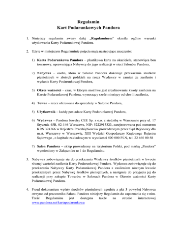 Regulamin Kart Podarunkowych Pandora 1. Niniejszy regulamin zwany dalej „Regulaminem” określa ogólne warunki użytkowania Karty Podarunkowej Pandora. 2. Użyte w niniejszym Regulaminie pojęcia mają następujące znaczenie: 1) Karta Podarunkowa Pandora – plastikowa karta na okaziciela, stanowiąca bon towarowy, uprawniająca Nabywcę do jego realizacji w sieci Salonów Pandora, 2) Nabywca – osoba, która w Salonie Pandora dokonuje przekazania środków pieniężnych w złotych polskich na rzecz Wydawcy w zamian za zasilenie i wydanie Karty Podarunkowej Pandora, 3) Okres ważności – czas, w którym możliwe jest zrealizowanie kwoty zasilenia na Karcie Podarunkowej Pandora, wynoszący sześć miesięcy od chwili zasilenia, 4) Towar – rzecz oferowana do sprzedaży w Salonie Pandora, 5) Użytkownik – każdy posiadacz Karty Podarunkowej Pandora, 6) Wydawca – Pandora Jewelry CEE Sp. z o.o. z siedzibą w Warszawie przy ul. 17 Stycznia 45B, 02-146 Warszawa, NIP: 5222915323, zarejestrowana pod numerem KRS 324366 w Rejestrze Przedsiębiorców prowadzonym przez Sąd Rejonowy dla m.st. Warszawy w Warszawie, XIII Wydział Gospodarczy Krajowego Rejestru Sądowego , o kapitale zakładowym w wysokości 500 000 PLN, tel. 22 460 00 58 7) Salon Pandora – sklep prowadzony na terytorium Polski, pod marką „Pandora” wymieniony w Załączniku nr 1 do Regulaminu. 3. Nabywca zobowiązuje się do przekazania Wydawcy środków pieniężnych w kwocie równej wartości zasilenia Karty Podarunkowej Pandora. Wydawca zobowiązuje się do przekazania Nabywcy Karty Podarunkowej Pandora z zasileniem równym kwocie przekazanych przez Nabywcę środków pieniężnych, a następnie do przyjęcia jej do realizacji przy zakupie Towarów w Salonach Pandora w Okresie ważności Karty Podarunkowej Pandora. 4. Przed dokonaniem wpłaty środków pieniężnych zgodnie z pkt 3 powyżej Nabywca otrzyma od pracownika Salonu Pandora niniejszy Regulamin do zapoznania się z nim. Treść Regulaminu jest dostępna także na stronie internetowej www.pandora.net/kartapodarunkowa 5. Minimalna kwota zasilenia wynosi 100 zł. Karta Podarunkowa Pandora może być zasilona następnie na dowolną kwotę wzwyż, bez limitu górnego. 6. Karta Podarunkowa Pandora jest jednorazowa i po wykorzystaniu całej kwoty znajdującej się na Karcie Podarunkowej Pandora nie jest możliwe jej ponowne zasilenie. 7. Nabycie Karty Podarunkowej Pandora jest możliwe wyłącznie w Salonie Pandora. 8. Karta Podarunkowa Pandora jest kartą na okaziciela. 9. Karta Podarunkowa Pandora jest aktywna przez Okres ważności. Podczas Okresu ważności Karta Podarunkowa Pandora może być przez Użytkownika wielokrotnie wykorzystywana do dokonywania zakupów w Salonach Pandora. Niewykorzystane środki na Karcie Podarunkowej pozostają na niej do ostatniego dnia Okresu ważności. 10. Użytkownikowi przy dokonaniu zakupów z wykorzystaniem Karty Podarunkowej Pandora nie przysługuje prawo otrzymania reszty kwoty w gotówce, w przypadku, jeżeli wartość zakupionych Towarów jest niższa od kwoty zasilenia znajdującej się na Karcie Podarunkowej Pandora. Pozostałą część środków pieniężnych na Karcie Podarunkowej Pandora Użytkownik może wykorzystać w Okresie ważności. 11. Jeżeli wartość zakupionych Towarów jest wyższa od kwoty zasilenia znajdującej się na Karcie Podarunkowej Pandora, wówczas przy dokonaniu zakupów z wykorzystaniem Karty Podarunkowej Pandora Użytkownik zobowiązany jest do dopłaty należnej różnicy gotówką lub kartą płatniczą. 12. Użytkownik ma prawo sprawdzenia aktualnej wartości nominalnej i Okresu ważności Karty Podarunkowej Pandora. Sprawdzenie wartości może być dokonane bezpośrednio w Sklepie Pandora. 13. Wydawca po wydaniu Nabywcy Karty Podarunkowej Pandora nie ponosi odpowiedzialności za utratę, w tym w szczególności za zgubienie lub kradzież Karty Podarunkowej Pandora, z przyczyn nieleżących po stronie Wydawcy. 14. Wydanie Karty Podarunkowej Pandora Nabywcy nie stanowi sprzedaży opodatkowanej podatkiem od towarów i usług w rozumieniu odpowiednich przepisów podatkowych. Nabywca na dowód dokonania wpłaty na rzecz Wydawcy środków pieniężnych, otrzyma od Wydawcy potwierdzenie w postaci paragonu niefiskalnego. 15. Reklamacje dotyczące korzystania z Karty Podarunkowej Pandora mogą być składane bezpośrednio w Salonach Pandora, w godzinach ich otwarcia lub listownie na adres siedziby Wydawcy podany w pkt 2 ppkt 6 niniejszego Regulaminu. Wszelkie reklamacje związane z korzystaniem z Karty Podarunkowej Pandora będą rozpatrywane przez Wydawcę w ciągu 14 (czternastu) dni od daty złożenia pisemnej reklamacji przez Użytkownika. 16. Nabywca poprzez przyjęcie Karty Podarunkowej Pandora oświadcza, że zapoznał się z treścią niniejszego Regulaminu, akceptuje jego treść w całości i zobowiązuje się do przestrzegania jego postanowień. Nabywca jest zobowiązany do poinformowania Użytkownika, któremu przekazuje Kartę Podarunkową Pandora, o treści niniejszego Regulaminu, a w szczególności o tym, że: Karta Podarunkowa Pandora może być zrealizowana wyłącznie w Salonach Pandora, Karta Podarunkowa Pandora nie podlega zwrotowi ani wymianie na środki pieniężne, a także o możliwości zapoznania się z Regulaminem pod adresem www.pandora.net/kartapodarunkowa oraz w Salonach Pandora. 17. Wobec Nabywcy będącego konsumentem w rozumieniu art. 221 Kodeksu Cywilnego (ustawa z dnia 23 kwietnia 1964 r. Kodeks Cywilny, Dz. U. 1964 Nr 16, poz. 93 ze zm.) Wydawca ponosi odpowiedzialność za wady świadczenia na zasadach przewidzianych w przepisach Kodeksu cywilnego. Załącznik nr 1 do Regulaminu Lista salonów należących do spółki Pandora Jewelry CEE Sp.zo.o: 1. C.H Galeria Bałtycka AL.Grunwaldzka 141 80-624 Gdańsk 2. P.H. Matarnia Ul.Złota Karczma 26 80-286 Gdańsk 3. C.H Klif Gdynia Al. Zwyciestwa 256 81-525 Gdynia 4. C.H Manufaktura Ul. Karskiego 5 91-071 Ł