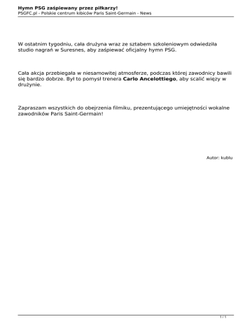 Hymn PSG zaśpiewany przez piłkarzy! PSGFC.pl - Polskie centrum kibiców Paris Saint-Germain - News W ostatnim tygodniu, cała drużyna wraz ze sztabem szkoleniowym odwiedziła studio nagrań w Suresnes, aby zaśpiewać oficjalny hymn PSG. Cała akcja przebiegała w niesamowitej atmosferze, podczas której zawodnicy bawili się bardzo dobrze. Był to pomysł trenera Carlo Ancelottiego, aby scalić więzy w drużynie. Zapraszam wszystkich do obejrzenia filmiku, prezentującego umiejętności wokalne zawodników Paris Saint-Germain! Autor: kublu 1/1 Powered by TCPDF (www.tcpdf.org)