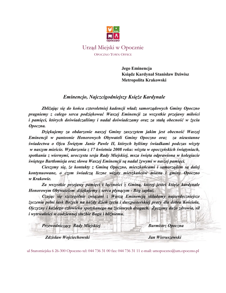 Urząd Miejski w Opocznie OPOCZNO TOWN OFFICE Jego Eminencja Ksiądz Kardynał Stanisław Dziwisz Metropolita Krakowski Eminencjo, Najczcigodniejszy Księże Kardynale Zbliżając się do końca czteroletniej kadencji władz samorządowych Gminy Opoczno pragniemy z całego serca podziękować Waszej Eminencji za wszystkie przejawy miłości i pamięci, których doświadczaliśmy i nadal doświadczamy oraz za stałą obecność w życiu Opoczna. Dziękujemy za obdarzenie naszej Gminy zaszczytem jakim jest obecność Waszej Eminencji w panteonie Honorowych Obywateli Gminy Opoczno oraz za nieustanne świadectwa o Ojcu Świętym Janie Pawle II, których byliśmy świadkami podczas wizyty w naszym mieście. Wydarzenia z 17 kwietnia 2008 roku: wizyta w opoczyńskich świątyniach, spotkania z wiernymi, uroczysta sesja Rady Miejskiej, msza święta odprawiona w kolegiacie świętego Bartłomieja oraz słowa Waszej Eminencji są nadal żywymi w naszej pamięci. Cieszymy się, że kontakty z Gminą Opoczno, mieszkańcami i samorządem są dalej kontynuowane, o czym świadczą liczne wizyty mieszkańców miasta i gminy Opoczno w Krakowie. Za wszystkie przejawy pamięci i łączności z Gminą, której jesteś księże kardynale Honorowym Obywatelem dziękujemy z serca płynącym - Bóg zapłać. Czując się szczególnie związani z Waszą Eminencją składamy najserdeczniejsze życzenia pełni łask Bożych na każdy dzień życia i duszpasterskiej pracy dla dobra Kościoła, Ojczyzny i każdego człowieka spotykanego na życiowych drogach. Życzymy dużo zdrowia, sił i wytrwałości w codziennej służbie Bogu i bliźniemu. Przewodniczący Rady Miejskiej Zdzisław Wojciechowski Burmistrz Opoczna Jan Wieruszewski ul Staromiejska 6 26-300 Opoczno tel: 044 736 31 00 fax: 044 736 31 11 e-mail: [email protected]