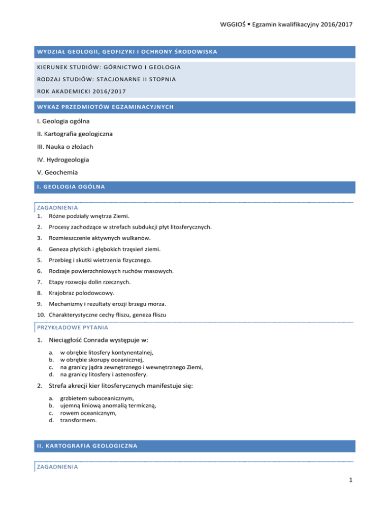 WGGIOŚ Egzamin kwalifikacyjny 2016/2017 WYDZIAŁ GEOLOGII, GEOFIZYKI I OCHRONY ŚRODOWISKA KIERUNEK STUDIÓW: GÓRNICTWO I GEOLOGIA RODZAJ STUDIÓW: STACJONARNE II STOPNIA ROK AKADEMICKI 2016/2017 WYKAZ PRZEDMIOTÓW EGZAMINACYJNYCH I. Geologia ogólna II. Kartografia geologiczna III. Nauka o złożach IV. Hydrogeologia V. Geochemia I. GEOLOGIA OGÓLNA ZAGADNIENIA 1. Różne podziały wnętrza Ziemi. 2. Procesy zachodzące w strefach subdukcji płyt litosferycznych. 3. Rozmieszczenie aktywnych wulkanów. 4. Geneza płytkich i głębokich trzęsień ziemi. 5. Przebieg i skutki wietrzenia fizycznego. 6. Rodzaje powierzchniowych ruchów masowych. 7. Etapy rozwoju dolin rzecznych. 8. Krajobraz polodowcowy. 9. Mechanizmy i rezultaty erozji brzegu morza. 10. Charakterystyczne cechy fliszu, geneza fliszu PRZYKŁADOWE PYTANIA 1. Nieciągłość Conrada występuje w: a. b. c. d. w obrębie litosfery kontynentalnej, w obrębie skorupy oceanicznej, na granicy jądra zewnętrznego i wewnętrznego Ziemi, na granicy litosfery i astenosfery. 2. Strefa akrecji kier litosferycznych manifestuje się: a. b. c. d. grzbietem suboceanicznym, ujemną liniową anomalią termiczną, rowem oceanicznym, transformem. II. KARTOGRAFIA GEOLOGICZNA ZAGADNIENIA 1 WGGIOŚ Egzamin kwalifikacyjny 2016/2017 1. Style budowy geologicznej. 2. Piętra strukturalne i tektoniczne. 3. Typy niezgodności. 4. Fałdy – klasyfikacje, mechanizmy i przyczyny fałdowania. 5. Uskoki – powstanie i klasyfikacje. 6. Płaszczowiny i nasunięcia – mechanizmy powstawania, budowa wewnętrzna płaszczowin. 7. Spękania i ich powstanie oraz klasyfikacja, systemy ciosowe. 8. Mapy topograficzne, odwzorowania kartograficzne, podział map. 9. Mapy geologiczne i pokrewne stosowane w Polsce. 10. Global Positioning System, zasady działania, systemy nawigacji satelitarnej. PRZYKŁADOWE PYTANIA 1. W skład kompletnej mapy geologicznej wchodzą: e. f. g. h. mapa, profil geologiczny, przekrój litostratygraficzny, legenda mapa, profil morfologiczny, przekrój geologiczny, tekst objaśniający mapa, przekrój geologiczny, profil litostratygraficzny, tekst objaśniający mapa, przekrój geologiczny, profil litostratygraficzny, tekst objaśniający 2. Synklina to: a. b. c. d. forma fałdu zawierająca w jądrze utwory młodsze każda forma wypukła ku dołowi forma fałdu zawierająca w jądrze utwory starsze każda forma wypukła ku górze III. NAUKA O ZŁOŻACH ZAGADNIENIA 1. Parametry definiujące kontur złoża. 2. Procesy złożotwórcze - podział, charakterystyka. 3. Złoża miedzi - typy genetyczne, charakterystyka geologiczna. 4. Złoża Zn-Pb - typy genetyczne, charakterystyka geologiczna. 5. Złoża Cr - typy genetyczne, charakterystyka geologiczna. 6. Złoża surowców energetycznych - podział, typy genetyczne, charakterystyka geologiczna. 7. Geologia złóż uranu. 8. Forma i budowa złoża. 9. Techniczno-ekonomiczne elementy i parametry złóż. 10. Surowce skalne i chemiczne Dolnego Śląska. PRZYKŁADOWE PYTANIA 1. Złoża hydrotermalne są związane z procesami: a. b. c. d. ewaporacji wietrzenia i erozji wulkanicznymi z żadnym z powyższych 2 WGGIOŚ Egzamin kwalifikacyjny 2016/2017 2. Typy genetyczne złóż Zn-Pb to: e. f. g. h. VHMS, SHMS metasomatyczne ewaporatowe okruchowe IV. HYDROGEOLOGIA ZAGADNIENIA 1. Obieg wody w cyklu hydrologicznym. 2. Właściwości hydrogeologiczne skał (porowatość, przepuszczalność, odsączalność). 3. Piętra i poziomy wodonośne. Rodzaje warstw wodonośnych. 4. Filtracja wód podziemnych. Prawo Darcy. 5. Skład chemiczny wód podziemnych. Wody zwykłe, mineralne, termalne i lecznicze. 6. Metody terenowych badań hydrogeologicznych. 7. Wielkość dopływu wód do studni i innych urządzeń drenażowych. 8. Zanieczyszczenia wód podziemnych. Ogniska zanieczyszczeń. 9. Migracja zanieczyszczeń w wodach podziemnych. Adwekcja, dyspersja i sorpcja. 10. Monitoring środowiska wodnego. PRZYKŁADOWE PYTANIA 1. Próbne pompowania w warunkach nieustalonych prowadzi się w celu: i. j. k. l. 2. Określenia właściwości hydrogeologicznych warstwy wodonośnej w pobliżu studni, Określenia składu chemicznego wody Określenia wielkości zasobów Określenia twardości wody Współczynnik filtracji jest parametrem: a. b. c. d. określającym zdolność skały do przewodzenia wody, najistotniejszym z punktu widzenia zagadnień hydrogeologicznych, obie odpowiedzi są prawidłowe. żadna odpowiedź nie jest prawidłowa V. GEOCHEMIA ZAGADNIENIA 1. Geochemia pierwiastków z elementami kosmochemii. 2. Krystalochemia. 3. Termodynamika geochemiczna. 4. Geochemia wnętrza Ziemi – procesy magmowe i metamorficzne. 5. Geochemia wód i roztworów wodnych. 6. Geochemia strefy hipergenicznej, gleb i skał osadowych. 7. Podstawy geochemii atmosfery i środowiska. 3 WGGIOŚ Egzamin kwalifikacyjny 2016/2017 8. Podstawy geochemii izotopów radioaktywnych i trwałych, geochronologia. 9. Podstawy geochemii prospekcyjnej. 10. Elementy metodyki analiz i interpretacji geochemicznej. PRZYKŁADOWE PYTANIA 1. Elektroujemność pierwiastków budujących minerał wpływa na jego właściwości ponieważ: a) pierwiastki o dużej elektroujemności tworzą wiązania jonowe przez co minerał łatwo rozpuszcza się w wodzie; b) wiązania chemiczne pierwiastków o małej różnicy elektroujemności są silniejsze i kierunkowe powodując zwiększenie twardości i obniżenie rozpuszczalności w wodzie; c) wiązania chemiczne pierwiastków o dużej elektroujemności są silniejsze i kierunkowe powodując zwiększenie twardości i obniżenie rozpuszczalności w wodzie; d) minerały zbudowane z pierwiastków o dużej elektroujemności są twarde i nierozpuszczalne w wodzie. 2. Proces wietrzenia skaleni potasowych prowadzący do powstania kaolinitu: a) to reakcja hydratacji połączona z procesem rozpuszczania kongruentnego; b) to reakcja hydratacji połączona z procesem krystalizacji homogenicznej; c) to reakcja hydrolizy połączona z procesem 