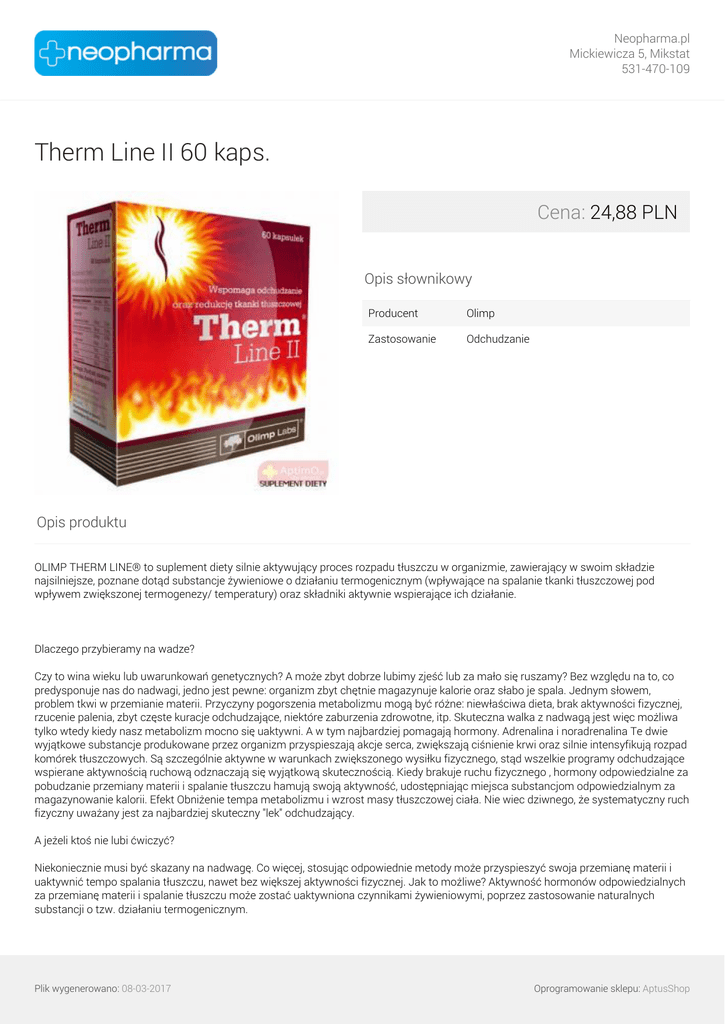 Neopharma.pl Mickiewicza 5, Mikstat 531-470-109 Therm Line II 60 kaps. Cena: 24,88 PLN Opis słownikowy Producent Olimp Zastosowanie Odchudzanie Opis produktu OLIMP THERM LINE® to suplement diety silnie aktywujący proces rozpadu tłuszczu w organizmie, zawierający w swoim składzie najsilniejsze, poznane dotąd substancje żywieniowe o działaniu termogenicznym (wpływające na spalanie tkanki tłuszczowej pod wpływem zwiększonej termogenezy/ temperatury) oraz składniki aktywnie wspierające ich działanie. Dlaczego przybieramy na wadze? Czy to wina wieku lub uwarunkowań genetycznych? A może zbyt dobrze lubimy zjeść lub za mało się ruszamy? Bez względu na to, co predysponuje nas do nadwagi, jedno jest pewne: organizm zbyt chętnie magazynuje kalorie oraz słabo je spala. Jednym słowem, problem tkwi w przemianie materii. Przyczyny pogorszenia metabolizmu mogą być różne: niewłaściwa dieta, brak aktywności fizycznej, rzucenie palenia, zbyt częste kuracje odchudzające, niektóre zaburzenia zdrowotne, itp. Skuteczna walka z nadwagą jest więc możliwa tylko wtedy kiedy nasz metabolizm mocno się uaktywni. A w tym najbardziej pomagają hormony. Adrenalina i noradrenalina Te dwie wyjątkowe substancje produkowane przez organizm przyspieszają akcje serca, zwiększają ciśnienie krwi oraz silnie intensyfikują rozpad komórek tłuszczowych. Są szczególnie aktywne w warunkach zwiększonego wysiłku fizycznego, stąd wszelkie programy odchudzające wspierane aktywnością ruchową odznaczają się wyjątkową skutecznością. Kiedy brakuje ruchu fizycznego , hormony odpowiedzialne za pobudzanie przemiany materii i spalanie tłuszczu hamują swoją aktywność, udostępniając miejsca substancjom odpowiedzialnym za magazynowanie kalorii. Efekt Obniżenie tempa metabolizmu i wzrost masy tłuszczowej ciała. Nie wiec dziwnego, że systematyczny ruch fizyczny uważany jest za najbardziej skuteczny "lek" odchudzający. A jeżeli ktoś nie lubi ćwiczyć? Niekoniecznie musi być skazany na nadwagę. Co więcej, stosując odpowiednie metody może przyspieszyć swoja przemianę materii i uaktywnić tempo spalania tłuszczu, nawet bez większej aktywności fizycznej. Jak to możliwe? Aktywność hormonów odpowiedzialnych za przemianę materii i spalanie tłuszczu może zostać uaktywniona czynnikami żywieniowymi, poprzez zastosowanie naturalnych substancji o tzw. działaniu termogenicznym. Plik wygenerowano: 08-03-2017 Oprogramowanie sklepu: AptusShop Neopharma.pl Mickiewicza 5, Mikstat 531-470-109 Termogeniki - co to takiego ? Pod tajemniczym hasłem kryją się specjalne składniki odpowiedzialne za produkcję ciepła przez organizm, czyli wzmożone spalanie kalorii. Związki termogeniczne występują w różnych produktach żywnościowych, jednak ze względu na niewielkie ich stężenie w pokarmie nie wywołują spektakularnych efektów. Wyjątkowe możliwości stwarza jednak zastosowanie termogeników w formie suplementacji żywieniowej (OLIMP THERM LINE®) . Specjalnie wyselekcjonowane związki termogeniczne z pokarmów roślinnych silnie pobudzają aktywność metaboliczną organizmu, stymulują rozpad tkanki tłuszczowej oraz wzmagają spalanie jej zasobów z dużym rozproszeniem energii. W efekcie dochodzi do przyspieszenia przemiany materii, wzrostu temperatury ciała i silnego uszczuplenia rezerw tłuszczowych. Pod wpływem suplementacji , w organizmie zachodzą przemiany metaboliczne podobne jak pod wpływem aktywnych ćwiczeń fizycznych. Recepta na szczupłą sylwetkę: OLIMP THERM LINE® to suplement diety zawierający w swoim składzie najsilniejsze, poznane dotąd substancje żywieniowe o działaniu termogenicznym( wpływające na spalanie tkanki tłuszczowej pod wpływem zwiększonej termogenezy/ temperatury) oraz składniki aktywnie wspierające ich działanie: Katechiny z zielonej herbaty - zwiększają wydatek energetyczny w wyniku nasilania termogenezy. Jednocześnie wzmagają aktywność enzymów odpowiedzialnych za proces rozpadu komórek tłuszczowych oraz hamują działanie związków, które tłuszcz odkładają. Ekstrakt z gorzkiej pomarańczy - silnie przyspiesza przemianę materii, zmniejsza apetyt oraz zwiększa wykorzystanie kwasów tłuszczowych w przemianach energetycznych. Guarana, kofeina - przyspiesza tempo metabolizmu, pobudza uwalnianie kwasów tłuszczowych do krwiobiegu, wpływa oszczędzająco na zasoby cukrów i białek w mięśniach. L-karnityna - przyspiesza końcowy etap spalania kwasów tłuszczowych, finalizuje proces redukcji tłuszczu, poprawia wydolność. L-tyrozyna - wpływa na poprawę samopoczucia, wytrzymałości fizycznej, przeciwdziała atakom głodu i zmienności nastrojów towarzyszącym kuracjom odchudzającym. Jak działa OLIMP THERM LINE®? Dla kogo jest OLIMP THERM LINE® ? OLIMP THERM LINE® polecany jest szczególnie osobom: o słabej przemianie materii, z dużą skłonnością do szybkiego przebierania na wadze nie ćwiczącym, wykonującym na co dzień pracę siedzącą rzucającym palenie tytoniu stosującym niskoenergetyczne diety odchudzające w celu uniknięcia efektu jo-jo. OLIMP THERM LINE® - także dla aktywnych! Ze względu na swój złożony skład, suplement OLIMP THERM LINE® usprawnia wiele procesów fizjologicznych w organizmie warunkujących poprawę zdolności wysiłkowych w różnych formach aktywności ruchowej. Składniki aktywne suplementu pobudzają ośrodkowy układ nerwowy, usprawniają pracę układu sercowo-naczyniowego, nasilają spalanie kwasów tłuszczowych oraz działa oszczędzająco na zasoby cukrów i białek w mięśniach. Z powodzeniem, suplement może więc znaleźć zastosowanie także wśród osób aktywnie usprawniających sport, których priorytetem jest wzrost wydolności, redukcja tkanki tłuszczowej oraz wzmocnienie tkanki mięśniowej. Substancje aktywne Informacja żywieniowa 2 kapsułki 4 kapsułki 100 g Ekstrakt zielonej herbaty EGCG (55%) 300 mg 600 mg 20,35 g w ty