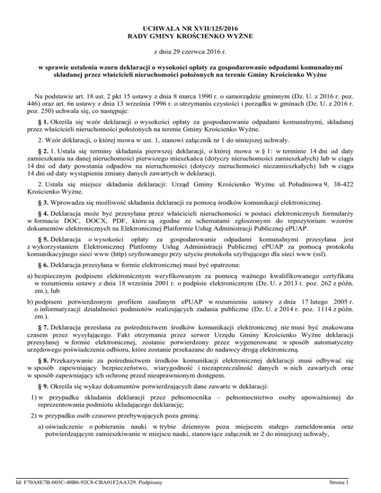 UCHWAŁA NR XVII/125/2016 RADY GMINY KROŚCIENKO WYŻNE z dnia 29 czerwca 2016 r. w sprawie ustalenia wzoru deklaracji o wysokości opłaty za gospodarowanie odpadami komunalnymi składanej przez właścicieli nieruchomości położonych na terenie Gminy Krościenko Wyżne Na podstawie art. 18 ust. 2 pkt 15 ustawy z dnia 8 marca 1990 r. o samorządzie gminnym (Dz. U. z 2016 r. poz. 446) oraz art. 6n ustawy z dnia 13 września 1996 r. o utrzymaniu czystości i porządku w gminach (Dz. U. z 2016 r. poz. 250) uchwala się, co następuje: § 1. Określa się wzór deklaracji o wysokości opłaty za gospodarowanie odpadami komunalnymi, składanej przez właścicieli nieruchomości położonych na terenie Gminy Krościenko Wyżne. 2. Wzór deklaracji, o której mowa w ust. 1, stanowi załącznik nr 1 do niniejszej uchwały. § 2. 1. Ustala się terminy składania pierwszej deklaracji, o której mowa w § 1: w terminie 14 dni od daty zamieszkania na danej nieruchomości pierwszego mieszkańca (dotyczy nieruchomości zamieszkałych) lub w ciągu 14 dni od daty powstania odpadów na nieruchomości (dotyczy nieruchomości niezamieszkałych) lub w ciągu 14 dni od daty wystąpienia zmiany danych zawartych w deklaracji. 2. Ustala się miejsce składania deklaracji: Urząd Gminy Krościenko Wyżne ul. Południowa 9, 38-422 Krościenko Wyżne. § 3. Wprowadza się możliwość składania deklaracji za pomocą środków komunikacji elektronicznej. § 4. Deklaracja może być przesyłana przez właścicieli nieruchomości w postaci elektronicznych formularzy w formacie DOC, DOCX, PDF, które są zgodne ze schematami zgłoszonymi do repozytorium wzorów dokumentów elektronicznych na Elektronicznej Platformie Usług Administracji Publicznej ePUAP. § 5. Deklaracja o wysokości opłaty za gospodarowanie odpadami komunalnymi przesyłana jest z wykorzystaniem Elektronicznej Platformy Usług Administracji Publicznej ePUAP za pomocą protokołu komunikacyjnego sieci www (http) szyfrowanego przy użyciu protokołu szyfrującego dla sieci www (ssl). § 6. Deklaracja przesyłana w formie elektronicznej musi być opatrzona: a) bezpiecznym podpisem elektronicznym weryfikowanym za pomocą ważnego kwalifikowanego certyfikatu w rozumieniu ustawy z dnia 18 września 2001 r. o podpisie elektronicznym (Dz. U. z 2013 r. poz. 262 z późn. zm.), lub b) podpisem potwierdzonym profilem zaufanym ePUAP w rozumieniu ustawy z dnia 17 lutego 2005 r. o informatyzacji działalności podmiotów realizujących zadania publiczne (Dz. U. z 2014 r. poz. 1114 z późn. zm.). § 7. Deklaracja przesłana za pośrednictwem środków komunikacji elektronicznej nie musi być znakowana czasem przez wysyłającego. Fakt otrzymania przez serwer Urzędu Gminy Krościenko Wyżne deklaracji przesyłanej w formie elektronicznej, zostanie potwierdzony przez wygenerowane w sposób automatyczny urzędowego poświadczenia odbioru, które zostanie przekazane do nadawcy drogą elektroniczną. § 8. Przekazywanie za pośrednictwem środków komunikacji elektronicznej deklaracji musi odbywać się w sposób zapewniający bezpieczeństwo, wiarygodność i niezaprzeczalność danych w nich zawartych oraz w sposób zapewniający ich ochronę przed nieuprawnionym dostępem. § 9. Określa się wykaz dokumentów potwierdzających dane zawarte w deklaracji: 1) w przypadku składania deklaracji przez pełnomocnika – pełnomocnictwo osoby upoważnionej do reprezentowania podmiotu składającego deklarację; 2) w przypadku osób czasowo przebywających poza gminą: a) oświadczenie o pobieraniu nauki w trybie dziennym poza miejscem stałego zameldowania oraz potwierdzającym zamieszkiwanie w miejscu nauki, stanowiące załącznik nr 2 do niniejszej uchwały, Id: F70A8E7B-005C-40B6-92C8-CBA01F2AA329. Podpisany Strona 1 b) oświadczenie o przebywaniu członka rodziny poza granicami kraju, stanowiące załącznik nr 3 do niniejszej uchwały, c) oświadczenie o pracy poza miejscem stałego zameldowania oraz potwierdzające zamieszkiwanie w miejscu pracy, stanowiące załącznik nr 4 do niniejszej uchwały. § 10. Wykonanie uchwały powierza się Wójtowi Gminy Krościenko Wyżne. § 11. Traci moc UCHWAŁA NR XXII/183/2012 Rady Gminy Krościenko Wyżne z dnia 28 grudnia 2012 r. w sprawie ustalenia wzoru deklaracji o wysokości opłaty za gospodarowanie odpadami komunalnymi składanej przez właścicieli nieruchomości położonych na terenie Gminy Krościenko Wyżne. § 12. Uchwała wchodzi w życie po upływie 14 dni od dnia ogłoszenia w Dzienniku Urzędowym Województwa Podkarpackiego. Przewodniczący Rady Gminy Krościenko Wyżne mgr Antoni Dębiec Id: F70A8E7B-005C-40B6-92C8-CBA01F2AA329. Podpisany Strona 2 Załącznik nr 1 do uchwały Nr XVII /125/ 2016 Rady Gminy Krościenko Wyżne z dnia 29 czerwca 2016 r. WYPEŁNIAĆ NALEŻY JASNE POLA DUŻYMI DRUKOWANYMI LITERAMI, KOLOREM CZARNYM LUB NIEBIESKIM DEKLARACJA O WYSOKOŚCI OPŁATY ZA GOSPODAROWANIE ODPADAMI KOMUNALNYMI Podstawa prawna: Ustawa z dnia 13 września 1996 r. o utrzymaniu czystości i porządku w gminach (Dz.U. z 2016 r. poz. 250) Zobowiązany do złożenia deklaracji: Deklarację zobowiązany jest złożyć właściciel nieruchomości zamieszkałej oraz właściciel nieruchomości niezamieszkałej położonej na terenie Gminy Krościenko Wyżne (deklarację może złożyć także współwłaściciel , użytkownik wieczysty, zarządca nieruchomości najemca, dzierżawca, lub inna osoba faktycznie nią władająca) Miejsce składania deklaracji: Urząd Gminy Krościenko Wyżne, ul Południowa 9, 38-422 Krościenko Wyżne lub Elektroniczna Skrzynka Podawcza Urzędu Gminy Krościenko Wyżne na portalu „ePUAP” (Elektroniczna Platforma Usług Administracji Publicznej) Organ właściwy do przyjęcia deklaracji: Wójt Gminy Krościenko Wyżne A. OBOWIĄZEK ZŁOŻENIA DEKLARACJI Obowiązek złożenia deklaracji wynika z art. 6m ustawy Okoliczności powodujące obowiązek złożenia deklaracji (należy zaz