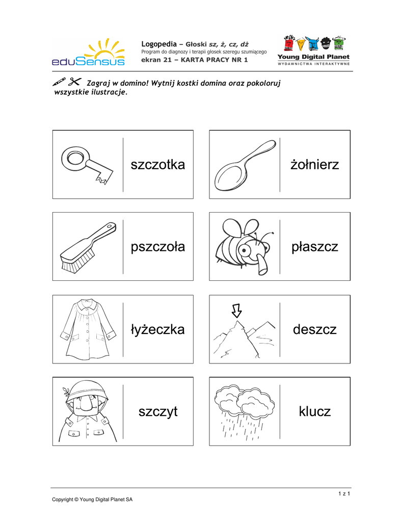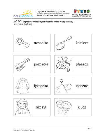 Logopedia – Głoski sz, ż, cz, dż Program do diagnozy i terapii głosek szeregu szumiącego ekran 21 – KARTA PRACY NR 1 Zagraj w domino! Wytnij kostki domina oraz pokoloruj wszystkie ilustracje. 1z1 Copyright © Young Digital Planet SA
