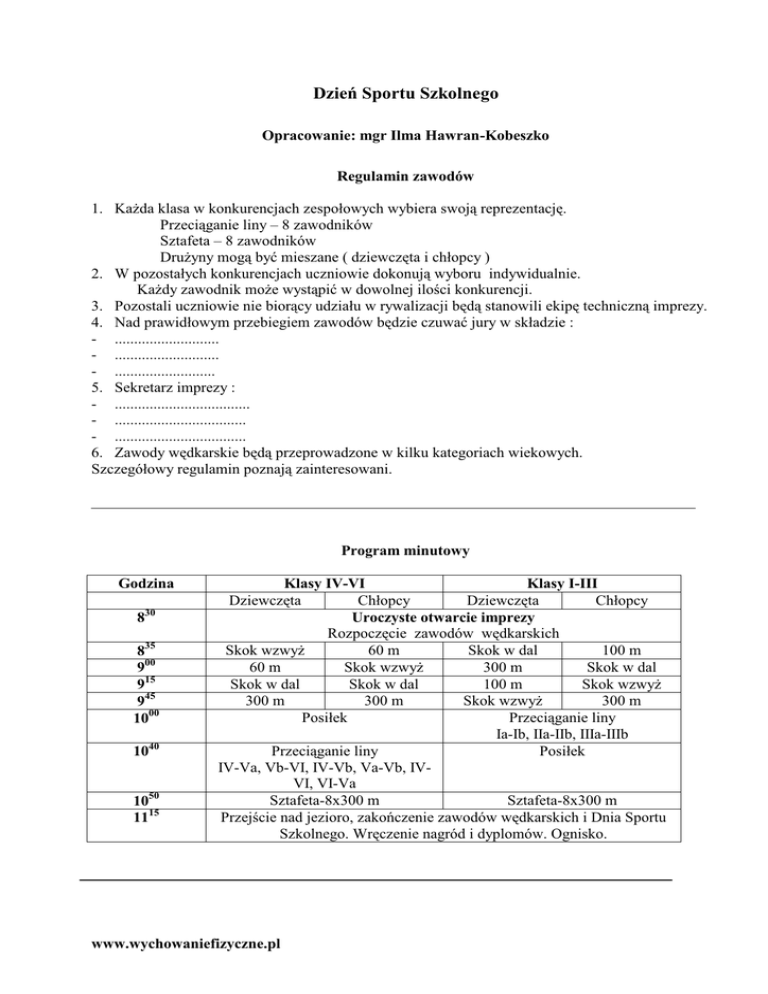 ']LH 6SRUWX6]NROQHJR 2SUDFRZDQLHPJU,OPD+DZUDQ.REHV]NR 5HJXODPLQ]DZRGyZ .D*GDNODVDZNRQNXUHQFMDFK]HVSRáRZ\FKZ\ELHUDVZRM UHSUH]HQWDFM 3U]HFLJDQLHOLQ\± ]DZRGQLNyZ 6]WDIHWD± ]DZRGQLNyZ 'UX*\Q\PRJ E\üPLHV]DQHG]LHZF] WDLFKáRSF\ :SR]RVWDá\FKNRQNXUHQFMDFKXF]QLRZLHGRNRQXM Z\ERUXLQG\ZLGXDOQLH .D*G\]DZRGQLNPR*HZ\VWSLüZGRZROQHMLORFLNRQNXUHQFML 3R]RVWDOLXF]QLRZLHQLHELRUF\XG]LDáXZU\ZDOL]DFMLE G VWDQRZLOLHNLS WHFKQLF]Q LPSUH]\ 1DGSUDZLGáRZ\PSU]HELHJLHP]DZRGyZE G]LHF]XZDüMXU\ZVNáDG]LH 6HNUHWDU]LPSUH]\ =DZRG\Z GNDUVNLHE G SU]HSURZDG]RQHZNLONXNDWHJRULDFKZLHNRZ\FK 6]F]HJyáRZ\UHJXODPLQSR]QDM ]DLQWHUHVRZDQL *RG]LQD 3URJUDPPLQXWRZ\ .ODV\,99, .ODV\,,,, ']LHZF] WD &KáRSF\ ']LHZF] WD &KáRSF\ 8URF]\VWHRWZDUFLHLPSUH]\ 5R]SRF] FLH]DZRGyZZ GNDUVNLFK 6NRNZ]Z\* P 6NRNZGDO P P 6NRNZ]Z\* P 6NRNZGDO 6NRNZGDO 6NRNZGDO P 6NRNZ]Z\* P P 6NRNZ]Z\* P 3RVLáHN 3U]HFLJDQLHOLQ\ ,D,E,,D,,E,,,D,,,E 3U]HFLJDQLHOLQ\ 3RVLáHN ,99D9E9,,99E9D9E,9 9,9,9D 6]WDIHWD[P 6]WDIHWD[P 3U]HMFLHQDGMH]LRUR]DNRF]HQLH]DZRGyZZ GNDUVNLFKL'QLD6SRUWX 6]NROQHJR:U F]HQLHQDJUyGLG\SORPyZ2JQLVNR ZZZZ\FKRZDQLHIL]\F]QHSO .ODVD 3URWRNyá]DZRGyZ± VNRNZGDOVNRNZ]Z\* ,PL LQD]ZLVNR 6HULD,, 6HULD,,, :\QLN NRFRZ\ 0LHMVFH 3URWRNyá]DZRGyZSU]HFLJDQLHOLQ\ .ODVD .ODVD 6HULD, :\QLN 3URWRNyá]DZRGyZ NRQNXUHQFMHELHJRZH ,PL LQD]ZLVNR ZZZZ\FKRZDQLHIL]\F]QHSO &]DV HOLPLQDFMH &]DV HOLPLQDFMH &]DV ILQDá 0LHMVFH