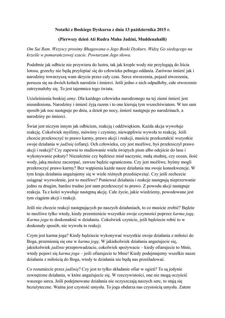 Notatki z Boskiego Dyskursu z dnia 13 października 2015 r. (Pierwszy dzień Ati Rudra Maha Jadźni, Muddenahalli) Om Sai Ram. Wszyscy prosimy Bhagawana o Jego Boski Dyskurs. Widzę Go siedzącego na krześle w pomarańczowej szacie. Powtarzam Jego słowa. Podobnie jak odbicie nie przywiera do lustra, tak jak krople wody nie przylegają do liścia lotosu, grzechy nie będą przylepiać się do człowieka pełnego oddania. Zarówno śmierć jak i narodziny towarzyszą wam skrycie przez cały czas. Serce stworzenia, pojazd stworzenia, porusza się na dwóch kołach narodzin i śmierci. Jeśli jedno z nich odpadłoby, całe stworzenie zatrzymałoby się. To jest tajemnica tego świata. Ucieleśnienia boskiej atmy. Dla każdego człowieka narodzonego na tej ziemi śmierć jest nieunikniona. Narodziny i śmierć żyją razem i to one kierują tym wszechświatem. W ten sam sposób jak noc następuje po dniu, a dzień po nocy, śmierć następuje po narodzinach, a narodziny po śmierci. Świat jest niczym innym jak odbiciem, reakcją i oddźwiękiem. Każda akcja wywołuje reakcję. Cokolwiek myślimy, mówimy i czynimy, niewątpliwie wywoła to reakcję. Jeśli chcecie przekroczyć to prawo karmy, prawo akcji i reakcji, musicie przekształcić wszystkie swoje działania w jadźnię (ofiarę). Och człowieku, czy jest możliwe, byś przekroczył prawo akcji i reakcji? Czy zapewni to studiowanie wielu świętych pism albo odejście do lasu i wykonywanie pokuty? Niezależnie czy będziesz miał naczynie, małą studnię, czy ocean, ilość wody, jaką możesz zaczerpać, zawsze będzie ograniczona. Czy jest możliwe, byśmy mogli przekroczyć prawo karmy? Bez wątpienia każde nasze działania ma swoje konsekwencje. W tym kraju działania angażujemy się w wiele różnych przedsięwzięć. Czy jeśli zechcecie osiągnąć wyzwolenie, jest to możliwe? Ponieważ działania i reakcje następują nieprzerwanie jedno za drugim, bardzo trudno jest nam przekroczyć to prawo. Z powodu akcji następuje reakcja. Ta z kolei wywołuje następną akcję. Całe życie, jakie wiedziemy, powodowane jest tym ciągiem akcji i reakcji. Jeśli nie chcecie reakcji następujących po naszych działaniach, to co musicie zrobić? Będzie to możliwe tylko wtedy, kiedy przemienicie wszystkie swoje czynności poprzez karma jogę. Karma joga to doskonałość w działaniu. Cokolwiek czynicie, jeśli będziecie robić to w doskonały sposób, nie wywoła to reakcji. Czym jest karma joga? Kiedy będziecie wykonywać wszystkie swoje działania z miłości do Boga, przemienią się one w karma jogę. W jakiekolwiek działania angażujecie się, jakiekolwiek jadźnie przeprowadzacie, cokolwiek spożywacie – kiedy ofiarujecie to Mnie, wtedy pojawi się karma joga – jeśli ofiarujecie to Mnie! Kiedy podejmujemy wszelkie nasze działania z miłością do Boga, wtedy te działania nie będą nas prześladować. Co rozumiecie przez jadźnię? Czy jest to tylko składanie ofiar w ogień? To są jedynie zewnętrzne działania, w które angażujecie się. W rzeczywistości, one nie mogą oczyścić waszego serca. Jeśli podejmowane działania nie oczyszczają naszych serc, to stają się bezużyteczne. Ważna jest czystość umysłu. To joga obdarza nas czystością umysłu. Zatem jeśli ofiarujemy z miłością Bogu wszystko, co myślimy, mówimy i czynimy, stanie się to karma jogą. Duchowość nie jest zawiła ani skomplikowana, ona jest bardzo, bardzo prosta. Cokolwiek robicie, ofiarujcie to z miłością Bogu i porzućcie pragnienie cieszenia się rezultatem działania. Wtedy stanie się to karma jogą. Z jednej strony z miłością składacie w ofierze wszystkie czynności Bogu, a z drugiej strony poświęcacie pragnienie rezultatu działania. Kiedy będziecie robić to szczerze, wasze działania nie zakończą się reakcją. Cokolwiek chcemy ofiarować Bogu, naturalnie pragniemy, aby nasze działania były perfekcyjne. Nie zamierzamy ofiarować Bogu kiepskich rzeczy. Składamy Bogu w ofierze tylko rzeczy bardzo czyste. Listonosz dostarczy twój list adresatowi jedynie wtedy, gdy na kopercie napiszesz adres. Podobnie kiedy wszystkie swoje działania zaadresujesz do Boga, Kriszny, one dotrą do Kriszny. Jednak wielu ludzi o ciasnych umysłach próbuje uniknąć rekcji, kiedy postępują źle. Kiedy robią dobre rzeczy, przypisują je sobie, mówiąc: „ja to zrobiłem”, ale kiedy postępują źle, oddają to Bogu. Pewnego razu doszło do sprzeczki między mężem i żoną. Ich syn osiągający znakomite wyniki w sporcie, wygrał mecz i przyniósł do domu zwycięskie trofeum. Ojciec po pracy w biurze wrócił do domu. Syn poszedł do niego, by podzielić się z nim wspaniałą wiadomością. Za synem podążała matka. Syn z wielką dumą opowiedział ojcu, jak to zdobył główną nagrodę. Ojciec, bardzo dumny z syna, zwrócił się do matki: „Zobacz, mój syn zdobył główną nagrodę. On był w stanie zwyciężyć i zebrać wszystkie te trofea, ponieważ jest moim synem!”. Żona odpowiedziała: „Mówisz, że chłopak zdobywa nagrody w sporcie, bo jest twoim synem. Czy widziałeś raport z jego postępów w nauce? Ze wszystkich przedmiotów zebrał same zera!”. Wtedy mąż odparł: „Jest tak dlatego, że on jest twoim synem. Ty nie masz mózgu i twój syn również go nie ma!”. Zwróćcie uwagę, jak z powodu egoizmu ludzie zmieniają swoje zdanie. Jeśli robią coś dobrego i otrzymują dobre rezultaty, wtedy mówią, że oni to zrobili. Ale kiedy robią coś złego, mówią, iż jest to wolą Boga, więc tak musiało się zdarzyć. Jest to rodzaj zdrady. Tylko szczera osoba może osiągnąć mądrość. Kiedy będziecie robić coś nieszczerze, Bóg nie przyjmie waszej ofiary. Kiedy sprawicie, że wszystkie wasze działania staną się uświęcone i ofiarujecie je z miłością Bogu, wtedy karma (działanie) stanie się karma jogą. Te jadźnie mają fundamentalne znaczenie. Stanowią część naszej ku