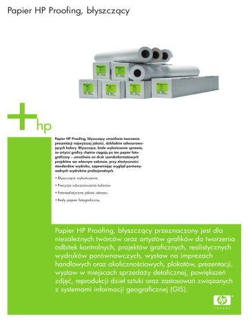 Papier HP Proofing, błyszczcy Papier HP Proofing, błyszczcy umoliwia tworzenie prezentacji najwyszej jakoci, dokładnie odwzorowujcych kolory. Błyszczce, białe wyko#czenie sprawia, e artyci graficy ch$tnie si$gaj po ten papier fotograficzny – umoliwia on druk szerokoformatowych projektów we własnym zakresie, przy elastycznoci standardów wydruku, zapewniajc wygld porównywalnych wydruków profesjonalnych. • Błyszczce wyko"czenie. • Precyzja odwzorowania kolorów. • Fotorealistyczna jako ć obrazu. • Biały papier fotograficzny. Papier HP Proofing, błyszczcy przeznaczony jest dla niezalenych twórców oraz artystów grafików do tworzenia odbitek kontrolnych, projektów graficznych, realistycznych wydruków porównawczych, wystaw na imprezach handlowych oraz okoliczno ciowych, plakatów, prezentacji, wystaw w miejscach sprzeday detalicznej, powi!ksze" zdj!ć, reprodukcji dzieł sztuki oraz zastosowa" zwizanych z systemami informacji geograficznej (GIS). Papier HP Proofing, błyszczcy Pełna zgodnoć Drukarki HP Designjet HP Colorpro GA/CAD HP Designjet 10/20/50PS HP Designjet seria 120 HP Designjet seria 500 HP Designjet seria 800 HP Designjet seria 5500 Systemy atramentowe HP Systemy atramentowe HP nr 10 Systemy atramentowe HP nr 11, 82 i 84 Systemy atramentowe HP nr 11, 82 i 84 Systemy atramentowe HP nr 10, 11 i 82 Systemy atramentowe HP nr 10, 11 i 82 Barwnikowy system atramentowy HP nr 81 oraz pigmentowy system atramentowy (UV) HP nr 83 Zapraszamy do odwiedzenia strony www.hp.com/go/designjet/supplies/support w celu pobrania najnowszych profili ICC/Media (naley kliknć profile ICC i wybrać odpowiedni drukark!). W przypadku drukarek nieobsługujcych PostScriptu prosimy skontaktować si! ze swoim lokalnym sprzedawc procesorów obrazu (RIP). Gramatura 173 g/m2 Gruboć 6,3 milów/162 mikrony Nieprzejrzystoć > 90% zgodnie z metod testow ISO 2471 Jaskrawoć > 90% zgodnie z metod testow ISO 2470 Biel CIE 94,9/-1, 1/-3,1 Laminowanie Na zimno Temperatura eksploatacji Od 15 do 35°C Eksploatacyjna wilgotnoć wzgl$dna Od 20 do 80% Odpornoć na działanie wiatła Od 3 do 6 miesi!cy (maks. Delta E < 10) Odpornoć na działanie wody Delta OD < 0,10 Zgodnoć atramentów Barwnikowy system atramentowy Czas wysychania 4 minuty 4ywotnoć rynkowa 2 lata Tryb druku Fotograficzny o wysokim połysku w przypadku HP Designjet serii 500 oraz 800 Kraj pochodzenia Niemcy Numery katalogowe HP Numer produktu Q1970A Q1963A Q1964A Q1965A Q5524A Gwarancja HP gwarantuje, e wielkoformatowe materiały drukarskie HP s wolne od defektów i wad produkcyjnych, i s tak zaprojektowane, by przy wła ciwym uytkowaniu nie powodować zaci!ć drukarki. Je li z jakiegokolwiek powodu uytkownik jest niezadowolony z wielkoformatowego materiału drukarskiego HP, powinien skontaktować si! ze swoim sprzedawc. Arkuszy 50 arkuszy 50 arkuszy 50 arkuszy – 20 arkuszy Wymiary nonika w roli 330 mm x 483 mm 457 mm x 610 mm 610 mm x 914 mm 610 mm x 30 m 610 mm x 914 mm ©2003 Hewlett-Packard Development Company, L.P. Specyfikacje zawarte w tym dokumencie mog bez uprzedzenia ulec zmianie. Wszystkie gwarancje udzielane w odniesieniu do Produktów i Usług HP okre lone zostały w o wiadczeniach gwarancyjnych załczanych do kadego produktu i usługi. Baden zapis niniejszego dokumentu nie moe być uwaany za dodatkow gwarancj!. HP nie ponosi odpowiedzialno ci za bł!dy techniczne lub drukarskie w niniejszym dokumencie. Wi!cej informacji na temat wielkoformatowych materiałów drukarskich HP znale<ć mona na stronach internetowych www.hp.com/go/designjet/supplies. 5982-3716PLE, 02/2004 Kody upc 8 08736 33380 1 8 08736 33374 0 8 08736 33375 7 8 08736 33776 4 8 29160 14192 3 NOWO8Ć!