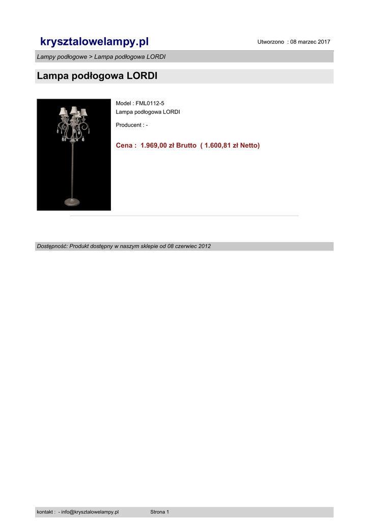 krysztalowelampy.pl Utworzono : 08 marzec 2017 Lampy podłogowe > Lampa podłogowa LORDI Lampa podłogowa LORDI Model : FML0112-5 Lampa podłogowa LORDI Producent : - Cena : 1.969,00 zł Brutto ( 1.600,81 zł Netto) Dostępność: Produkt dostępny w naszym sklepie od 08 czerwiec 2012 kontakt : - [email protected] Strona 1