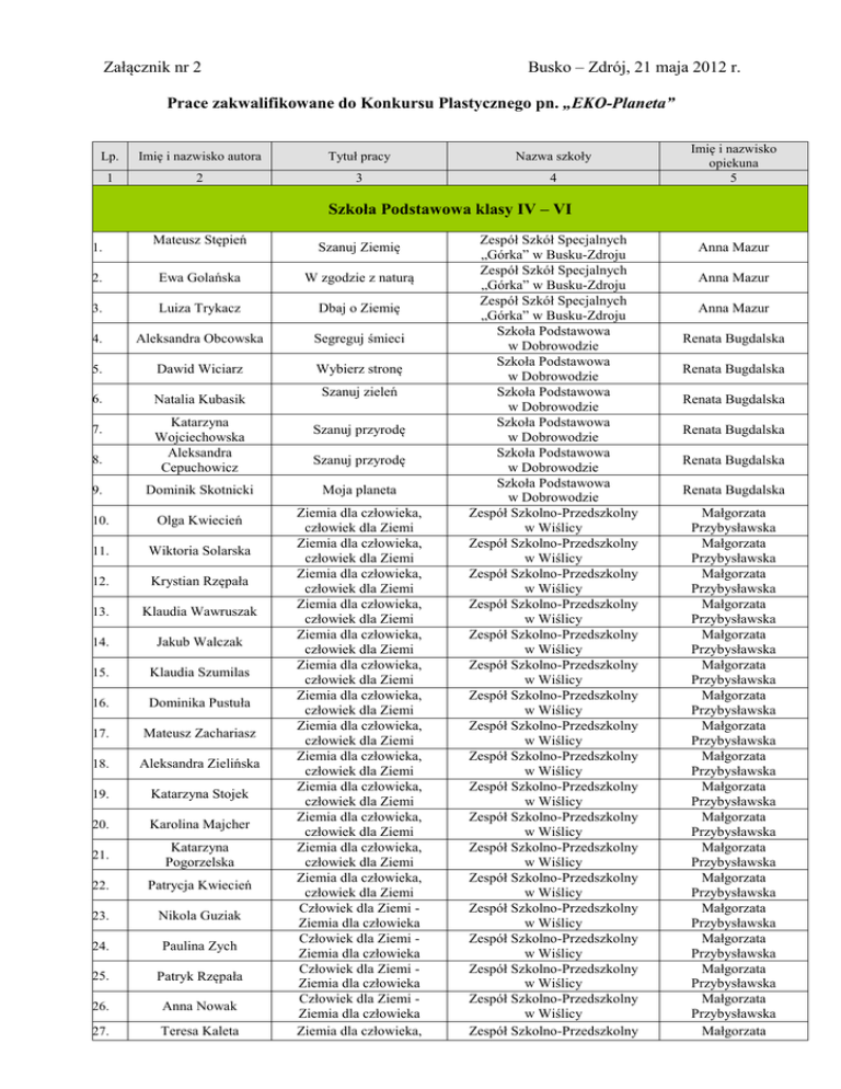 Załącznik nr 2 Busko – Zdrój, 21 maja 2012 r. Prace zakwalifikowane do Konkursu Plastycznego pn. „EKO-Planeta” Lp. Imię i nazwisko autora Tytuł pracy Nazwa szkoły 1 2 3 4 Imię i nazwisko opiekuna 5 Szkoła Podstawowa klasy IV – VI 1. Mateusz Stępień Szanuj Ziemię 2. Ewa Golańska W zgodzie z naturą 3. Luiza Trykacz Dbaj o Ziemię 4. Aleksandra Obcowska Segreguj śmieci 5. Dawid Wiciarz Wybierz stronę 6. Natalia Kubasik 7. 8. Katarzyna Wojciechowska Aleksandra Cepuchowicz 9. Dominik Skotnicki 10. Olga Kwiecień 11. Wiktoria Solarska 12. Krystian Rzępała 13. Klaudia Wawruszak 14. Jakub Walczak 15. Klaudia Szumilas 16. Dominika Pustuła 17. Mateusz Zachariasz 18. Aleksandra Zielińska 19. Katarzyna Stojek 20. Karolina Majcher 21. Katarzyna Pogorzelska 22. Patrycja Kwiecień 23. Nikola Guziak 24. Paulina Zych 25. Patryk Rzępała 26. Anna Nowak 27. Teresa Kaleta Szanuj zieleń Szanuj przyrodę Szanuj przyrodę Moja planeta Ziemia dla człowieka, człowiek dla Ziemi Ziemia dla człowieka, człowiek dla Ziemi Ziemia dla człowieka, człowiek dla Ziemi Ziemia dla człowieka, człowiek dla Ziemi Ziemia dla człowieka, człowiek dla Ziemi Ziemia dla człowieka, człowiek dla Ziemi Ziemia dla człowieka, człowiek dla Ziemi Ziemia dla człowieka, człowiek dla Ziemi Ziemia dla człowieka, człowiek dla Ziemi Ziemia dla człowieka, człowiek dla Ziemi Ziemia dla człowieka, człowiek dla Ziemi Ziemia dla człowieka, człowiek dla Ziemi Ziemia dla człowieka, człowiek dla Ziemi Człowiek dla Ziemi Ziemia dla człowieka Człowiek dla Ziemi Ziemia dla człowieka Człowiek dla Ziemi Ziemia dla człowieka Człowiek dla Ziemi Ziemia dla człowieka Ziemia dla człowieka, Zespół Szkół Specjalnych „Górka” w Busku-Zdroju Zespół Szkół Specjalnych „Górka” w Busku-Zdroju Zespół Szkół Specjalnych „Górka” w Busku-Zdroju Szkoła Podstawowa w Dobrowodzie Szkoła Podstawowa w Dobrowodzie Szkoła Podstawowa w Dobrowodzie Szkoła Podstawowa w Dobrowodzie Szkoła Podstawowa w Dobrowodzie Szkoła Podstawowa w Dobrowodzie Zespół Szkolno-Przedszkolny w Wiślicy Zespół Szkolno-Przedszkolny w Wiślicy Zespół Szkolno-Przedszkolny w Wiślicy Zespół Szkolno-Przedszkolny w Wiślicy Zespół Szkolno-Przedszkolny w Wiślicy Zespół Szkolno-Przedszkolny w Wiślicy Zespół Szkolno-Przedszkolny w Wiślicy Zespół Szkolno-Przedszkolny w Wiślicy Zespół Szkolno-Przedszkolny w Wiślicy Zespół Szkolno-Przedszkolny w Wiślicy Zespół Szkolno-Przedszkolny w Wiślicy Zespół Szkolno-Przedszkolny w Wiślicy Zespół Szkolno-Przedszkolny w Wiślicy Zespół Szkolno-Przedszkolny w Wiślicy Zespół Szkolno-Przedszkolny w Wiślicy Zespół Szkolno-Przedszkolny w Wiślicy Zespół Szkolno-Przedszkolny w Wiślicy Zespół Szkolno-Przedszkolny Anna Mazur Anna Mazur Anna Mazur Renata Bugdalska Renata Bugdalska Renata Bugdalska Renata Bugdalska Renata Bugdalska Renata Bugdalska Małgorzata Przybysławska Małgorzata Przybysławska Małgorzata Przybysławska Małgorzata Przybysławska Małgorzata Przybysławska Małgorzata Przybysławska Małgorzata Przybysławska Małgorzata Przybysławska Małgorzata Przybysławska Małgorzata Przybysławska Małgorzata Przybysławska Małgorzata Przybysławska Małgorzata Przybysławska Małgorzata Przybysławska Małgorzata Przybysławska Małgorzata Przybysławska Małgorzata Przybysławska Małgorzata człowiek dla Ziemi Ziemia dla człowieka, człowiek dla Ziemi Ziemia dla człowieka, człowiek dla Ziemi Ziemia dla człowieka, człowiek dla Ziemi Ziemia dla człowieka, człowiek dla Ziemi 28. Wiktoria Skowron 29. Hubert Filosek 30. Paweł Minior 31. Sylwia Załęcka 32. Wojciech Kabat Eko-Planeta 33. Kamil Łuczyński Eko-Planeta 34. Maria Piwowarczyk Eko-Planeta 35. Katarzyna Płatek Ziemia dla człowieka, człowiek dla Ziemi 36. Luiza Madej Eko-Planeta 37. Joanna Kuzon Ekologiczna planeta i śmieci 38. Magdalena Bławat Ziemia to nie śmietnik 39. Paulina Wojtaś Eko-Planeta 40. Natalia Bugdalska Szanuj naszą planetę 41. Natalia Żółtak Eko-świat 42. Małgorzata Czekaj Eko-świat 43. Katarzyna Sobczak Eko-Planeta 44. Kamil Jaros Eko-Planeta 45. Sandra Głuszek Eko-Planeta 46. Monika Segda Chrońmy naszą Ziemię by było jej jak w niebie 47. Milena Majka Wszyscy ratujmy ziemię 48. Izabela Wcisło Ziemia wspólne dobro 49. Marta Badzińska Zwierzęta wołają SOS! 50. Natalia Mrowińska Zmieńmy świat na lepsze 51. Kamila Żak Świat sam sobie nie da rady, segregujmy więc odpady 52. Nikola Gruszka Eko-Planeta 53. Julia Kowalska Czysta Ziemia 54. Katarzyna Odo Eko-Planeta 55. Aleksandra Fomalska Co wybierasz to czy to 56. Patrycja Strózik Ziemia dla człowieka – człowiek dla Ziemi w Wiślicy Zespół Szkolno-Przedszkolny w Wiślicy Zespół Szkolno-Przedszkolny w Wiślicy Zespół Szkolno-Przedszkolny w Wiślicy Zespół Szkolno-Przedszkolny w Wiślicy Zespół Szkolno-Przedszkolny w Wiślicy Zespół Szkolno-Przedszkolny w Wiślicy Zespół Szkolno-Przedszkolny w Wiślicy Zespół Szkolno-Przedszkolny w Wiślicy Zespół Szkolno-Przedszkolny w Wiślicy Zespół Publicznych Placówek Oświatowych w Solcu-Zdroju Zespół Publicznych Placówek Oświatowych w Solcu-Zdroju Zespół Publicznych Placówek Oświatowych w Solcu-Zdroju Zespół Publicznych Placówek Oświatowych w Solcu-Zdroju Zespół Publicznych Placówek Oświatowych w Solcu-Zdroju Zespół Publicznych Placówek Oświatowych w Solcu-Zdroju Zespół Publicznych Placówek Oświatowych w Solcu-Zdroju Szkoła Podstawowa w Nizinach Szkoła Podstawowa w Gnojnie Filia w Balicach Szkoła Podstawowa w Gnojnie Filia w Balicach Szkoła Podstawowa w Gnojnie Filia w Balicach Szkoła Podstawowa w Gnojnie Filia w Balicach Szkoła Podstawowa w Kargowie Szkoła Podstawowa w Kargowie Szkoła Podstawowa w Kargowie Szkoła Podstawowa nr 3 w Busku - Zdroju Zespół Placówek Oświatowych Nr 1 w Busku-Zdroju Zespół Placówek Oświatowych Nr 1 w Busku-Zdroju Zespół Placówek Oświatowych N