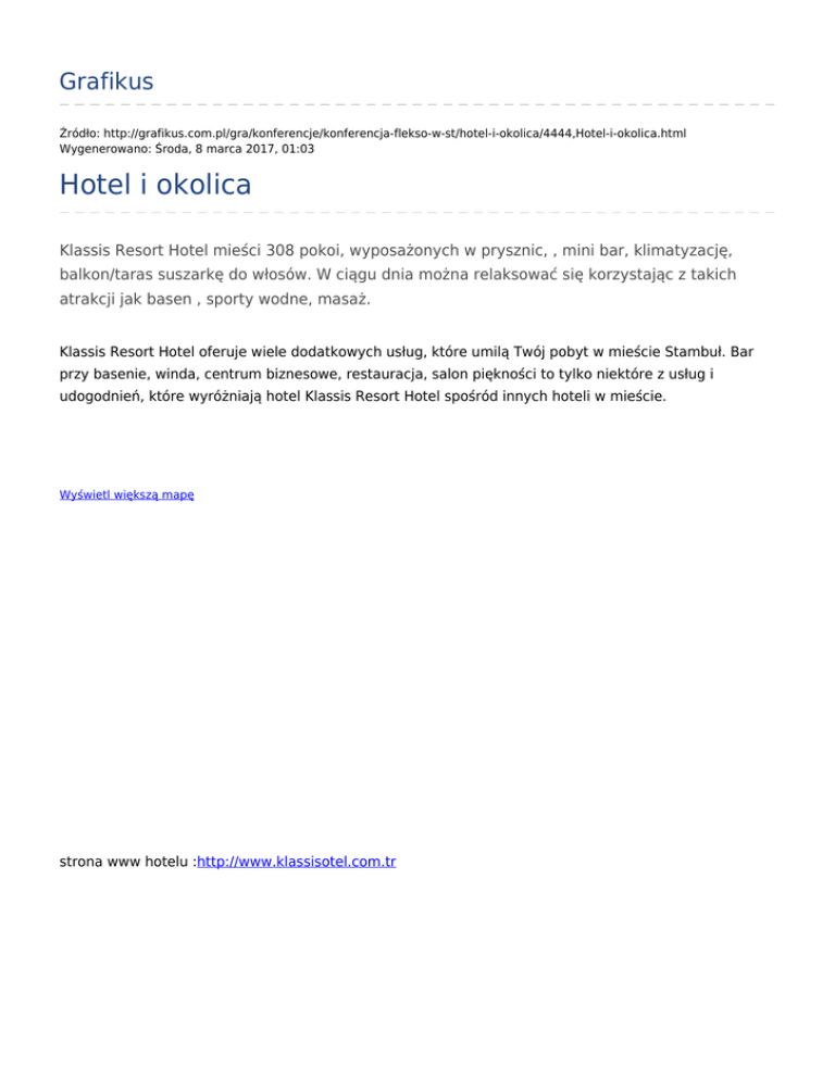 Grafikus Źródło: http://grafikus.com.pl/gra/konferencje/konferencja-flekso-w-st/hotel-i-okolica/4444,Hotel-i-okolica.html Wygenerowano: Środa, 8 marca 2017, 01:03 Hotel i okolica Klassis Resort Hotel mieści 308 pokoi, wyposażonych w prysznic, , mini bar, klimatyzację, balkon/taras suszarkę do włosów. W ciągu dnia można relaksować się korzystając z takich atrakcji jak basen , sporty wodne, masaż. Klassis Resort Hotel oferuje wiele dodatkowych usług, które umilą Twój pobyt w mieście Stambuł. Bar przy basenie, winda, centrum biznesowe, restauracja, salon piękności to tylko niektóre z usług i udogodnień, które wyróżniają hotel Klassis Resort Hotel spośród innych hoteli w mieście. Wyświetl większą mapę strona www hotelu :http://www.klassisotel.com.tr