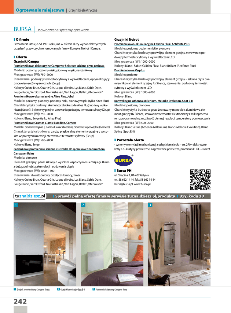Ogrzewanie miejscowe | Grzejniki elektryczne BURSA | nowoczesne systemy grzewcze ❚ O firmie Grzejniki Noirot Firma Bursa istnieje od 1991 roku, ma w ofercie duży wybór elektrycznych urządzeń grzewczych renomowanych firm w Europie: Noirot i Campa. Promiennikowo-akumulacyjne Calidou Plus i Actifonte Plus Modele: poziome, poziome niskie, pionowe Charakterystyka budowy: podwójny element grzejny, sterowanie: podwójny termostat cyfrowy z wyświetlaczem LCD Moc grzewcza [W]: 1000–2000 Kolory: Blanc i Sable (Calidou Plus), Blanc Brillant (Actifonte Plus) Promiennikowe Verplus Modele: poziome Charakterystyka budowy: podwójny element grzejny – szklana płyta promiennikowa i element grzejny Rx Silence, sterowanie: podwójny termostat cyfrowy z wyświetlaczem LCD Moc grzewcza [W]: 1000–2000 Kolory: Blanc Konwekcyjne Athenea Millenium, Melodie Evolution, Spot E-II Modele: poziome, pionowe Charakterystyka budowy: gęsto żebrowany monoblok aluminiowy, element grzejny Rx Silence, sterowanie: termostat elektroniczny z mikroprocesorem, programowalny, możliwość płynnej regulacji temperatury pomieszczenia Moc grzewcza [W]: 500–2000 Kolory: Blanc Satine (Athenea Millenium), Blanc (Melodie Evolution), Blanc Satine (Spot E-II) ❚ Oferta Grzejniki Campa Promiennikowe, dekoracyjne Campaver Select ze szklaną płytą czołową Modele: poziomy, poziomy niski, pionowy wąski, narożnikowy Moc grzewcza [W]: 750–2000 Sterowanie: podwójny termostat cyfrowy z wyświetlaczem, optymalizujący pracę elementów grzewczych (Ceup) Kolory: Cuivre Brun, Quartz Gris, Laque d’Ivoire, Lys Blanc, Sable Dore, Rouge Rubis, Vert Oxford, Noir Astrakan, Vert Lagon, Reflet „effet miroir” Promiennikowo-akumulacyjne Altea Plus, Jobel Modele: poziomy, pionowy, poziomy niski, pionowy wąski (tylko Altea Plus) Charakterystyka budowy: akumulator z bloku szkła (Altea Plus) lub lawy wulkanicznej (Jobel) i 2 elementy grzejne, sterowanie: podwójny termostat cyfrowy (Ceup) Moc grzewcza [W]: 750–2000 Kolory: Blanc, Beige (tylko Altea Plus) Promiennikowe Cosmos Classic i Median, Comete Modele: pionowe wąskie (Cosmos Classic i Median), pionowe superwąskie (Comete) Charakterystyka budowy: bardzo płaskie, dwa elementy grzejne o wysokim współczynniku emisji, sterowanie: termostat cyfrowy (Ceup) Moc grzewcza [W]: 500–2000 Kolory: Blanc, Beige Łazienkowe promienniki ścienne i suszarka do ręczników z nadmuchem Campaver Bains Modele: pionowe Element grzejny: panel szklany o wysokim współczynniku emisji i gr. 8 mm z dużą zdolnością akumulacji i oddawania ciepła Moc grzewcza [W]: 1000–1600 Sterowanie: dwustopniowy przełącznik mocy, timer Kolory: Cuivre Brun, Quartz Gris, Laque d’Ivoire, Lys Blanc, Sable Dore, Rouge Rubis, Vert Oxford, Noir Astrakan, Vert Lagon, Reflet „effet miroir” ❚ Pozostała oferta • systemy wentylacji mechanicznej z odzyskiem ciepła – str. 270 • elektryczne kotły c.o., kurtyny powietrzne, nagrzewnice powietrza, promienniki IRC – Noirot ❚ Bursa PH ul. Chopina 3, 81-407 Gdynia tel. 58 662 14 44, faks 58 662 14 44 [email protected], www.bursa.pl ❱ Sprawdź pełną ofertę firmy w serwisie Tuznajdziesz.pl/produkty ❱ Użyj kodu 2D 1 1 Grzejnik promiennikowy Campaver Select 242 2 2 Grzejnik konwekcyjny Spot E-II 3 3 Promiennik łazienkowy Campaver Bains