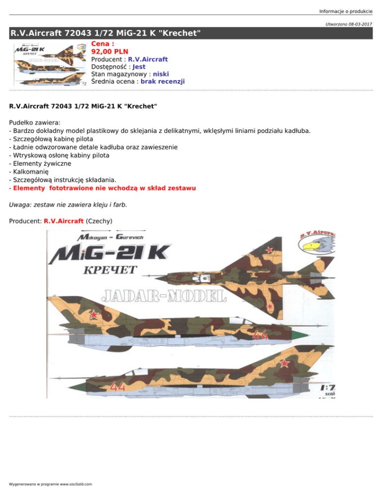 Informacje o produkcie Utworzono 08-03-2017 R.V.Aircraft 72043 1/72 MiG-21 K "Krechet" Cena : 92,00 PLN Producent : R.V.Aircraft Dostępność : Jest Stan magazynowy : niski Średnia ocena : brak recenzji R.V.Aircraft 72043 1/72 MiG-21 K "Krechet" Pudełko zawiera: - Bardzo dokładny model plastikowy do sklejania z delikatnymi, wklęsłymi liniami podziału kadłuba. - Szczegółową kabinę pilota - Ładnie odwzorowane detale kadłuba oraz zawieszenie - Wtryskową osłonę kabiny pilota - Elementy żywiczne - Kalkomanię - Szczegółową instrukcję składania. - Elementy fototrawione nie wchodzą w skład zestawu Uwaga: zestaw nie zawiera kleju i farb. Producent: R.V.Aircraft (Czechy) Wygenerowano w programie www.oscGold.com