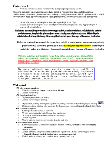 Ćwiczenia 1 1. Wybierz czcionkę Arial o rozmiarze 12 pkt i przepisz poniższy akapit: Reforma edukacji wprowadziła nowe typy szkół, a mianowicie: sześcioletnią szkołę podstawową, trzyletnie gimnazjum oraz szkoły ponadgimnazjalne. Wśród tych ostatnich szkół wyróżniamy: licea ogólnokształcące, licea profilowane, technika oraz szkoły zawodowe. 2. Ustaw odległość przed akapitem na 6 pkt, a po akapicie na 20 pkt 3. Skopiuj powyższy akapit 4 razy, a następnie sformatuj akapity tak, aby wyglądały jak w poniższych przykładach. Reforma edukacji wprowadziła nowe typy szkół, a mianowicie: sześcioletnią szkołę podstawową, trzyletnie gimnazjum oraz szkoły ponadgimnazjalne. Wśród tych ostatnich szkół wyróżniamy: licea ogólnokształcące, licea profilowane, technika Reforma edukacji wprowadziła nowe typy szkół, a mianowicie: sześcioletnią szkołę podstawową, trzyletnie gimnazjum oraz szkoły ponadgimnazjalne. Wśród tych ostatnich szkół wyróżniamy: licea ogólnokształcące, licea profilowane, technika Reforma edukacji wprowadziła nowe typy szkół, a mianowicie: sześcioletnią szkołę podstawową, trzyletnie gimnazjum oraz szkoły ponadgimnazjalne. Wśród tych ostatnich szkół wyróżniamy: licea ogólnokształcące, licea profilowane, technika Reforma edukacji wprowadziła nowe typy szkół, a mianowicie: sześcioletnią szkołę podstawową, trzyletnie gimnazjum oraz szkoły ponadgimnazjalne. Wśród tych ostatnich szkół wyróżniamy: licea ogólnokształcące, licea profilowane, technika Wskazówki: •W pierwszym akapicie: o Zmień czcionkę na Impact o rozmiarze 14 pkt, o Akapit wyśrodkuj. •W drugim akapicie: o Wybierz pogrubioną czcionkę, o Akapit wyrównaj do prawej o Wyrażenie „szkoły ponadgimnazjalne” wyróżnij kolorem żółtym korzystając z ikony o Zwiększ ostępy między wierszami na 1,5 korzystając z menu: format, akapit, interlinia •W trzecim akapicie: o Litery podkreśl i napisz je kursywą o W pierwszym zdaniu zmień kolor liter na zielony. o W drugim zdaniu zmień kolor liter na czerwony o Akapit wyjustuj o Ustaw wcięcie pierwszego wiersza akapitu na 2 cm • W czwartym akapicie: o Litery rozstrzel na 2 punkty korzystając z menu format, czcionka, odstępy między znakami, o Akapit wyjustuj o Akapit obramuj linią w kolorze niebieskim o grubości 1,5 pkt, korzystając z menu: format, obramowanie i cieniowanie, obramowanie, cień o Zmień wcięcie z lewej na 1 cm i wcięcie z prawej na 2 cm