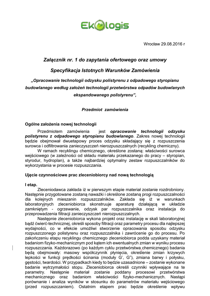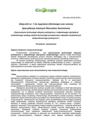 Wrocław 29.08.2016 r Załącznik nr. 1 do zapytania ofertowego oraz umowy Specyfikacja Istotnych Warunków Zamówienia „Opracowanie technologii odzysku polistyrenu z odpadowego styropianu budowlanego według założeń technologii przetwórstwa odpadów budowlanych ekspandowanego polistyrenu”, Przedmiot zamówienia Ogólne założenia nowej technologii Przedmiotem zamówienia jest opracowanie technologii odzysku polistyrenu z odpadowego styropianu budowlanego. Zakres nowej technologii będzie obejmował dwuetapowy proces odzysku składający się z rozpuszczenia surowca i odfiltrowania zanieczyszczeń nierozpuszczalnych (recykling chemiczny). W ramach recyklingu chemicznego, określone zostaną: właściwości surowca wejściowego (w zależności od składu materiału przekazanego do pracy – styropian, styrodur, hydroplan), a także najbardziej optymalny zestaw rozpuszczalników do wykorzystania w procesie rozpuszczania. Ujęcie czynnościowe prac zleceniobiorcy nad nową technologią I etap. Zleceniodawca zakłada iż w pierwszym etapie materiał zostanie rozdrobniony. Następnie przygotowane zostaną naważki i określone zostaną progi rozpuszczalności dla kolejnych mieszanin rozpuszczalników. Zakłada się iż w warunkach laboratoryjnych zleceniobiorca skonstruuje aparaturę działającą w układzie zamkniętym - ogrzewanie, odzysk par rozpuszczalnika oraz instalacja do przeprowadzenia filtracji zanieczyszczeń nierozpuszczalnych. Następnie zleceniobiorca wykona projekt oraz instalację w skali laboratoryjnej bądź ćwierć-technicznej, określi sposoby filtracji oraz parametry procesu dla najlepszej wydajności, co w efekcie umożliwi stworzenie opracowania sposobu odzysku rozpuszczonego polistyrenu oraz rozpuszczalnika i zawrócenie go do procesu. Po zakończeniu etapu recyklingu chemicznego zleceniobiorca podda uzyskany materiał badaniom fizyko-mechanicznym pod kątem ich ewentualnych zmian w wyniku procesu rozpuszczania. Każdorazowo (po każdym cyklu przetwórstwa chemicznego) badania będą obejmowały: masowy współczynnik płynięcia, określenie zmian krzywych lepkości w funkcji prędkości ścinania (moduły G’, G”), zmiana barwy i połysku, gęstości, twardości. W przypadkach kiedy to będzie uzasadnione – zostanie wykonane badanie wytrzymałości stopu. Zleceniobiorca określi czynniki wpływające na te parametry. Następnie materiał zostanie poddany procesowi przetwórstwa mechanicznego oraz badaniom właściwości fizyko-mechanicznych. Nastąpi porównanie i analiza wyników w stosunku do parametrów materiału wejściowego (przed rozpuszczaniem). Ostatnim etapem prac będzie określenie wpływu promieniowania ultrafioletowego w teście przyspieszonego starzenia i uzyskanie gotowej technologii w postaci produktu końcowego (zostaną określone parametry istotne czyli m.in. charakterystyka DSC, reologiczna, przepuszczalność par i gazów, odporność na starzenie, przewodnictwo cieplne, wytrzymałość mechaniczna: udarność metodą Darttester, wytrzymałość ) II etap W wyniku realizacji niniejszego zlecenia i uzyskaniu opracowania badawczego wnioskodawca planuje wdrożyć technologię chemicznego przetwarzania EPS, aby zamiast skompresowanego styropianu otrzymać granulat, będący gotowym półproduktem dla wszystkich firm zajmujących się produkcją metodami wtryskowymi czy wytłaczaniem z tworzyw sztucznych. Dla zleceniodawcy jest zatem bardzo istotne stworzenie i przystosowanie w skali laboratoryjnej instalacji do filtrowania zanieczyszczeń stałych po procesie rozpuszczania odpadowego EPS. Działanie instalacji powinno zostać zweryfikowane poprzez szereg testów i prac badawczych poprzedzających właściwą pracę z aparaturą. Na elementy instalacji powinny składać się: pompy próżniowe, odczynniki chemiczne do ustalenia składu i przeprowadzenia procesu rozpuszczania, gaz do aparatu DSC i badań przepuszczalności tlenu i pary wodnej, czujniki do pomiarów reologicznych, materiał eksploatacyjny (lampy oraz filtry) do wykonania testów przyspieszonego starzenia oraz pozostałe części instalacji konieczne do wykonania etc. W celu wdrożenia innowacyjnej technologii do działalności przedsiębiorstwa na terenie firmy zostanie zbudowana instalacja pilotażowa, nad powstaniem której będzie czuwał zleceniobiorca. Ujęcie przedmiotowe Zleceniobiorca zapewni wszelkie zasoby w tym ludzkie aby zrealizować przedmiot zamówienia w tym miedzy innymi: 1. Zleceniobiorca zapewni kadrę badawczą o minimalnym stopniu naukowym doktora, którzy miesięcznie świadczyć będą łącznie pracę przez minimum 70 godzin projektowych 2. Zleceniobiorca we własnym zakresie zakupi niezbędne elementy do wytworzenia prototypu linii produkcyjnej 3. Zleceniobiorca we własnym zakresie zakupi niezbędne materiały do wykonania testów badawczych 4. Zleceniobiorca we własnym zakresie pokryje koszty zarządzania projektem i pozostałe koszty nie ujęte wyżej a niezbędne do realizacji projektu Szczegółową specyfikacje wyżej wymienionych kosztów wraz z ich wyceną zleceniodawca uwzględni w ramach swojej oferty w stosownie do tego przewidzianych punktach.