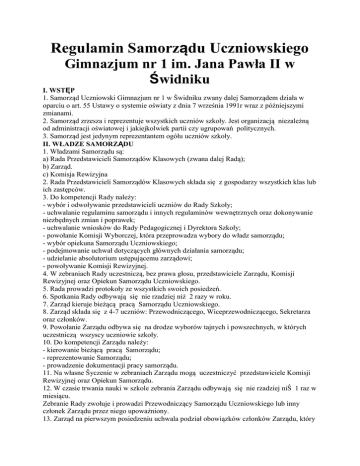 Regulamin Samorządu Uczniowskiego Gimnazjum nr 1 im. Jana Pawła II w Świdniku I. WSTĘP 1. Samorząd Uczniowski Gimnazjum nr 1 w Świdniku zwany dalej Samorządem działa w oparciu o art. 55 Ustawy o systemie oświaty z dnia 7 września 1991r wraz z późniejszymi zmianami. 2. Samorząd zrzesza i reprezentuje wszystkich uczniów szkoły. Jest organizacją niezależną od administracji oświatowej i jakiejkolwiek partii czy ugrupowań politycznych. 3. Samorząd jest jedynym reprezentantem ogółu uczniów szkoły. II. WŁADZE SAMORZĄDU 1. Władzami Samorządu są: a) Rada Przedstawicieli Samorządów Klasowych (zwana dalej Radą); b) Zarząd. c) Komisja Rewizyjna 2. Rada Przedstawicieli Samorządów Klasowych składa się z gospodarzy wszystkich klas lub ich zastępców. 3. Do kompetencji Rady należy: - wybór i odwoływanie przedstawicieli uczniów do Rady Szkoły; - uchwalanie regulaminu samorządu i innych regulaminów wewnętrznych oraz dokonywanie niezbędnych zmian i poprawek; - uchwalanie wniosków do Rady Pedagogicznej i Dyrektora Szkoły; - powołanie Komisji Wyborczej, która przeprowadza wybory do władz samorządu; - wybór opiekuna Samorządu Uczniowskiego; - podejmowanie uchwał dotyczących głównych działania samorządu; - udzielanie absolutorium ustępującemu zarządowi; - powoływanie Komisji Rewizyjnej. 4. W zebraniach Rady uczestniczą, bez prawa głosu, przedstawiciele Zarządu, Komisji Rewizyjnej oraz Opiekun Samorządu Uczniowskiego. 5. Rada prowadzi protokoły ze wszystkich swoich posiedzeń. 6. Spotkania Rady odbywają się nie rzadziej niż 2 razy w roku. 7. Zarząd kieruje bieżącą pracą Samorządu Uczniowskiego. 8. Zarząd składa się z 4-7 uczniów: Przewodniczącego, Wiceprzewodniczącego, Sekretarza oraz członków. 9. Powołanie Zarządu odbywa się na drodze wyborów tajnych i powszechnych, w których uczestniczą wszyscy uczniowie szkoły. 10. Do kompetencji Zarządu należy: - kierowanie bieżącą pracą Samorządu; - reprezentowanie Samorządu; - prowadzenie dokumentacji pracy samorządu. 11. Na własne Ŝyczenie w zebraniach Zarządu mogą uczestniczyć przedstawiciele Komisji Rewizyjnej oraz Opiekun Samorządu. 12. W czasie trwania nauki w szkole zebrania Zarządu odbywają się nie rzadziej niŜ 1 raz w miesiącu. Zebranie Rady zwołuje i prowadzi Przewodniczący Samorządu Uczniowskiego lub inny członek Zarządu przez niego upoważniony. 13. Zarząd na pierwszym posiedzeniu uchwala podział obowiązków członków Zarządu, który przedstawia do wiadomości Radzie. 14. Zarząd prowadzi protokoły ze wszystkich swoich posiedzeń oraz dokumentację przedstawiającą pracę Samorządu Uczniowskiego. 15. Komisja Rewizyjna jest podstawowym organem kontroli wewnętrznej. 16. W skład Komisji wchodzi trzech członków wybieranych przez Radę. 17. Komisja Rewizyjna kontroluje pracę Zarządu i minimum raz na semestr przedstawia sprawozdanie Radzie. 18. Komisja Rewizyjna prowadzi protokoły ze wszystkich swoich posiedzeń. 19. Członkowie Rady, Zarządu oraz Komisji Rewizyjnej mają obowiązek aktywnego udziału w pracach Samorządu. III. KADENCJA WŁADZ, WYBORY 1. Kadencja wszystkich władz samorządu trwa jeden rok kalendarzowy. 2. Członkami władz samorządu mogą być wyłącznie uczniowie szkoły, którzy w ostatnim semestrze uzyskali co najmniej dobrą ocenę ze sprawowania oraz nie uzyskali ani jednej semestralnej oceny niedostatecznej. W chwili odejścia ucznia ze szkoły (ukończenie nauki, zmiana szkoły, itp.) automatycznie przestaje on być członkiem Samorządu i jego władz. 3. Wybory do władz Samorządu oraz wybory Opiekuna Samorządu odbywają się tajnie, przy nieograniczonej liczbie kandydatów. 4. Wybory są organizowane i nadzorowane przez Komisję Wyborczą. 5. Wybory Zarządu Samorządu Uczniowskiego odbywają się w marcu. 6. Na miesiąc przed terminem wyborów Komisja Wyborcza informuje uczniów o zasadach przeprowadzenia wyborów. 7. W ciągu 2 tygodni od w/w terminu uczniowie szkoły mogą zgłaszać swoich kandydatów do Zarządu. Zgłoszenie musi zawierać nazwiska kandydata oraz jego pisemną zgodę. 8. Wybory odbywają się w ostatnim tygodniu marca. Wybory są tajne, uczestniczą w nich wszyscy uczniowie szkoły. W czasie wyborów uczniowie wybierają spośród przedstawionych kandydatur członków Zarządu. Do Zarządu wchodzą osoby, które uzyskały największą liczbę głosów. 9. Wybrany Zarząd na swoim pierwszym posiedzeniu (nie później niż 7 dni od wyborów) wybiera spośród siebie: Przewodniczącego, Wiceprzewodniczącego i Sekretarza. IV. OPIEKUN SAMORZĄDU UCZNIOWSKIEGO 1. Zgodnie z art. 55 p. 5.1 Samorząd Uczniowski, reprezentujący ogół uczniów szkoły wybiera nauczyciela pełniącego rolę Opiekuna Samorządu Uczniowskiego. 2. Opiekun Samorządu jest doradcą służącym swoją pomocą i doświadczeniem w pracy Samorządu. 3. Opiekun ma prawo uczestniczenia we wszystkich formach pracy Samorządu. 4. Wyboru Opiekuna dokonuje Rada Przedstawicieli Samorządów Klasowych w maju lub na początku czerwca. 5. Wybory przeprowadza Komisja Wyborcza. Wybory są tajne i odbywają się przy nieograniczonej liczbie kandydatów. 6. Kandydatów na funkcję Opiekuna Samorządu zgłaszają uczniowie szkoły. Zgłoszenie musi zawierać nazwisko kandydata oraz jego pisemną zgodę. V. KOMISJE I SEKCJE 1. Dla realizacji swoich zadań, Rada Przedstawicieli Samorządów Klasowych moŜe powoływać komisje, a Zarząd - sekcje. 2. Powoływane Komisje/Sekcje mogą mieć charakter stały (pracują przez cały rok) lub nadzwyczajny (doraźny). 3. Członkiem Komisji/Sekcji może zostać każdy uczeń szkoły. 4. Informacja o powołaniu Komisji/Sekcji, jej zakresie działania, czasie istnienia oraz składzie (lub otwartym charakterze) jest wywieszona na tablicy Samorządu w terminie tygodnia od daty powołania. 5. Rada Przedstawicieli Samorządów Klasowych powołuje (nie później niŜ w styczniu) Komisję Wyborczą, 