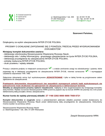 ul. Siedmiogrodzka 1 lok. 300 01-204 Warszawa www.swrn.org.pl tel. 22 401 72 36 tel. / fax. 22 401 72 36 [email protected] Szanowni Państwo, Dziękujemy za wybór ubezpieczenia INTER ŻYCIE POLSKA. PROSIMY O DOKŁADNE ZAPOZNANIE SIĘ Z PONIŻSZĄ TREŚCIĄ PRZED WYDRUKOWANIEM DOKUMENTÓW Niniejszy komplet dokumentów zawiera: - deklarację członkowską Stowarzyszenia Wspierania Rozwoju Nauki, - deklarację celu / ulotkę informacyjną - grupowego ubezpieczenie na życie INTER ŻYCIE POLSKA, - deklarację przystąpienia do ubezpieczenia INTER ŻYCIE POLSKA, - ankietę medyczną INTER ŻYCIE POLSKA, - druki przelewu / wpłaty składek. Proszę o złożenie podpisu w miejscach oznaczonych " ", a także zwrócenie uwagi na oświadczenia / pytania, które pojawiają się w deklaracji przystąpienia do ubezpieczenia INTER ŻYCIE, również oznaczone " udzielenia odpowiedzi TAK / NIE. " i wymagające Załączone dokumenty winny być wydrukowywane JEDNOSTRONNIE i tylko w takiej formie są przyjmowane celem zgłoszenia do ubezpieczenia. Przekazanie dokumentów nieuzupełnionych (we wszystkich wymaganych polach) bądź wydrukowanych nie jednostronnie może skutkować nie zgłoszeniem do ubezpieczenia w deklarowanym terminie. Składkę za ubezpieczenie prosimy wpłacić niezwłocznie, najlepiej w dniu wygenerowania się niniejszego kompletu dokumentów. Wpłata na koncie Stowarzyszenia WRN powinna pojawić się na koncie SWRN nie później niż 2 dni przed deklarowaną datą początku okresu ubezpieczenia. Numer konta do wpłaty pierwszej składki: 27 1160 2202 0000 0000 7958 8721 Komplet dokumentów w oryginale (wraz z potwierdzeniem płatności składki) powinien zostać dostarczony do Stowarzyszenia Wspierania Rozwoju Nauki przed deklarowaną datą przystąpienia do ubezpieczenia. Dokumenty można wysłać na poniższy adres: Stowarzyszenie Wspierania Rozwoju Nauki ul. Siedmiogrodzka 1 lok. 300, 01-204 Warszawa Zespół Stowarzyszenia WRN DEKLARACJA CELU GRUPOWE UBEZPIECZENIE NA ŻYCIE INTER - ŻYCIE POLSKA - wariant VIP Kto może przystąpić do ubezpieczenia: Do ubezpieczenia mogą przystąpić osoby, które ukończyły 18 lat, a nie ukończyły 67 r.ż. i będą zrzeszone w Stowarzyszeniu WRN. (odpowiedzialność trwa do 67 roku ubezpieczonego). Dlaczego warto przystąpić do ubezpieczenia... Oferta skonstruowana w formie ubezpieczenia grupowego zapewnia bardzo wysokie sumy ubezpieczenia przy stosunkowo niskiej składce. Świadczenie z tytułu wystąpienia poważnego zachorowania obejmuje 21 jednostek chorobowych: udar mózgu, zawał serca, nowotwór złośliwy, chirurgiczne zabiegi na naczyniach wieńcowych (by-pass), przeszczep zastawki serca, operacja aorty, choroba Parkinsona, paraliż, niewydolność nerek, łagodny guz mózgu, oponiak, poparzenia, przeszczep narządu, stwardnienie rozsiane, śpiączka, utrata mowy, utrata słuchu, utrata wzroku, anemia aplastyczna, zakażenie wirusem HIV w wyniku transfuzji krwi, choroba Creutzfeldta-Jakoba Oferta zawiera dodatkowo USŁUGĘ TELEFONCZNEJ ASYSTY PRAWNEJ DLA RODZINY (TAP) Karencje : - śmierć ubezpieczonego - 6 miesięcy; - śmierć ubezpieczonego w wyniku zawału serca /udaru mózgu - 6 miesięcy; - trwały uszczerbek na zdrowiu ubezpieczonego w wyniku zawału serca lub udaru mózgu - 3 miesiące; - poważne zachorowania ubezpieczonego - 90 dni. Karencje nie mają zastosowania do ryzyk ubezpieczeniowych zaistniałych wskutek NW. W przypadku przejścia do Inter Polski z innego ubezpieczenia na życie (minimalny staż 3 m-ce) w okresie karencyjnym obowiązuje wypłata z niższego świadczenia. Zakres ubezpieczenia zgodny z OWU na życie "INTER GRUPA" nr 16/2011 z dnia 16.06.2011 r. wraz z OWU umów dodatkowych Skumulowane wysokości świadczeń Śmierć ubezpieczonego w wyniku wypadku komunikacyjnego 1 500 000 zł Śmierć ubezpieczonego w wyniku nieszczęśliwego wypadku (NW) 1 000 000 zł Śmierć ubezpieczonego w wyniku zawału serca / udaru mózgu 1 000 000 zł Śmierć ubezpieczonego 500 000 zł Poważne Zachorowanie ubezpieczonego 35 000 zł Telefoniczna Asysta Prawna (TAP) TAK Miesięczna składka łączna (w tym składka członkowska w wysokości 12 zł i TAP 6 zł): Imię i nazwisko: 238 zł PESEL: Adres: Przystępując do proponowanego ubezpieczenia: jestem/byłem zatrudniony w: - Oświadczam, że przed wyrażeniem zgody na przystąpienie do ubezpieczenia zostały mi dostarczone przez Stowarzyszenie WRN właściwe warunki ubezpieczenia na trwałym nośniku, za jaki uważa się plik pdf, płytę CD lub format drukowany. ....................................... ................................................................. data własnoręczny czytelny podpis Oświadczam, że jestem zainteresowany/a przystąpieniem od dnia ......./dzień............/miesiąc............./rok do ubezpieczenia proponowanego przez TU INTER-ŻYCIE Polska S.A. Niniejszym zobowiązuję się wpłacać składkę łączną z góry (do 15 dnia każdego miesiąca) na konto bankowe Stowarzyszenia Wspierania Rozwoju Nauki, ul. Giełdowa 4A lok. 82, 01-211 Warszawa - 27 1160 2202 0000 0000 7958 8721. Jestem świadoma/y, że brak wpłaty w wymaganym terminie powoduje wygaśnięcie ochrony. Jednocześnie upoważniam Stowarzyszenie WRN do przekazywania składki do TU INTER-ŻYCIE Polska S.A. oraz przez Nestor Serwis do APRIL Sp. z o.o. (składka za TAP - 6 zł). Przyjmuję również do wiadomości, że w rocznicę ubezpieczenia wysokości świadczeń oraz składki mogą ulec zmianie. O ewentualnej zmianie warunków dany ubezpieczony będzie odpowiednio wcześniej poinformowany przez Stowarzyszenie WRN. Wyrażam zgodę na przekazywanie przez Towarzystwo Ubezpieczeniowe do SWRN informacji na temat zgłoszonych i wypłaconych świadczeń z tytułu mojego ubezpieczenia. Tym samym, wyrażam zgodę na przetwarzanie moich danych osobowych, w rozumieniu ustawy z dnia 29.08.1997r. o ochronie danych osobowych (Dz..U. nr 101/2002, poz. 926 z późniejszymi zmianami) przez 