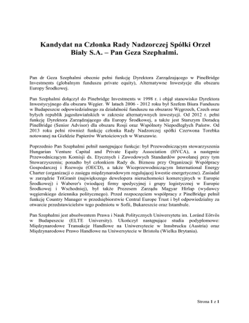 Kandydat na Członka Rady Nadzorczej Spółki Orzeł Biały S.A. – Pan Geza Szephalmi. Pan dr Geza Szephalmi obecnie pełni funkcję Dyrektora Zarządzającego w PineBridge Investments (globalnym funduszu private equity), Alternatywne Inwestycje dla obszaru Europy Środkowej. Pan Szephalmi dołączył do Pinebridge Investments w 1998 r. i objął stanowisko Dyrektora Inwestycyjnego dla obszaru Węgier. W latach 2006 - 2012 roku był Szefem Biura Funduszu w Budapeszcie odpowiedzialnego za działalność funduszu na obszarze Węgrzech, Czech oraz byłych republik jugosławiańskich w zakresie alternatywnych inwestycji. Od 2012 r. pełni funkcję Dyrektora Zarządzającego dla Europy Środkowej, a także jest Starszym Doradcą PineBridge (Senior Advisor) dla obszaru Rosji oraz Wspólnoty Niepodległych Państw. Od 2013 roku pełni również funkcję członka Rady Nadzorczej spółki Czerwona Torebka notowanej na Giełdzie Papierów Wartościowych w Warszawie. Poprzednio Pan Szephalmi pełnił następujące funkcje: był Przewodniczącym stowarzyszenia Hungarian Venture Capital and Private Equity Association (HVCA), a następnie Przewodniczącym Komisji ds. Etycznych i Zawodowych Standardów powołanej przy tym Stowarzyszeniu; ponadto był członkiem Rady ds. Biznesu przy Organizacji Współpracy Gospodarczej i Rozwoju (OECD), a także Wiceprzewodniczącym International Energy Charter (organizacji o zasięgu międzynarodowym regulującej kwestie energetyczne). Zasiadał w zarządzie TriGranit (największego dewelopera nieruchomości komercyjnych w Europie Środkowej) i Waberer's (wiodącej firmy spedycyjnej i grupy logistycznej w Europie Środkowej i Wschodniej), był także Prezesem Zarządu Magyar Hírlap (wydawcy węgierskiego dziennika politycznego). Przed rozpoczęciem współpracy z PineBridge pełnił funkcję Country Manager w przedsiębiorstwie Central Europe Trust i był odpowiedzialny za otwarcie przedstawicielstw tego podmiotu w Sofii, Bukareszcie oraz Istambule. Pan Szephalmi jest absolwentem Prawa i Nauk Politycznych Uniwersytetu im. Loránd Eötvös w Budapeszcie (ELTE University). Ukończył następujące studia podyplomowe: Międzynarodowe Transakcje Handlowe na Uniwersytecie w Innsbrucku (Austria) oraz Międzynarodowe Prawo Handlowe na Uniwersytecie w Bristolu (Wielka Brytania). Strona 1 z 1