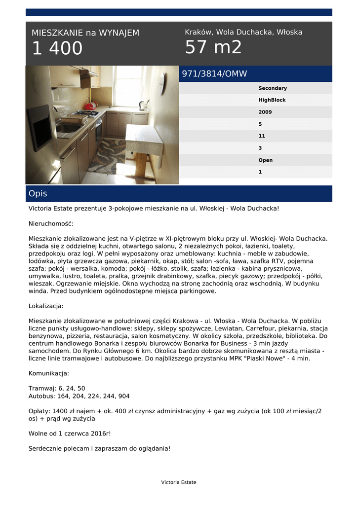 Kraków, Wola Duchacka, Włoska MIESZKANIE na WYNAJEM 57 m2 1 400 971/3814/OMW Secondary HighBlock 2009 5 11 3 Open 1 Opis Victoria Estate prezentuje 3-pokojowe mieszkanie na ul. Włoskiej - Wola Duchacka! Nieruchomość: Mieszkanie zlokalizowane jest na V-piętrze w XI-piętrowym bloku przy ul. Włoskiej- Wola Duchacka. Składa się z oddzielnej kuchni, otwartego salonu, 2 niezależnych pokoi, łazienki, toalety, przedpokoju oraz logi. W pełni wyposażony oraz umeblowany: kuchnia - meble w zabudowie, lodówka, płyta grzewcza gazowa, piekarnik, okap, stół; salon -sofa, ława, szafka RTV, pojemna szafa; pokój - wersalka, komoda; pokój - łóżko, stolik, szafa; łazienka - kabina prysznicowa, umywalka, lustro, toaleta, pralka, grzejnik drabinkowy, szafka, piecyk gazowy; przedpokój - półki, wieszak. Ogrzewanie miejskie. Okna wychodzą na stronę zachodnią oraz wschodnią. W budynku winda. Przed budynkiem ogólnodostępne miejsca parkingowe. Lokalizacja: Mieszkanie zlokalizowane w południowej części Krakowa - ul. Włoska - Wola Duchacka. W pobliżu liczne punkty usługowo-handlowe: sklepy, sklepy spożywcze, Lewiatan, Carrefour, piekarnia, stacja benzynowa, pizzeria, restauracja, salon kosmetyczny. W okolicy szkoła, przedszkole, biblioteka. Do centrum handlowego Bonarka i zespołu biurowców Bonarka for Business - 3 min jazdy samochodem. Do Rynku Głównego 6 km. Okolica bardzo dobrze skomunikowana z resztą miasta liczne linie tramwajowe i autobusowe. Do najbliższego przystanku MPK "Piaski Nowe" - 4 min. Komunikacja: Tramwaj: 6, 24, 50 Autobus: 164, 204, 224, 244, 904 Opłaty: 1400 zł najem + ok. 400 zł czynsz administracyjny + gaz wg zużycia (ok 100 zł miesiąc/2 os) + prąd wg zużycia Wolne od 1 czerwca 2016r! Serdecznie polecam i zapraszam do oglądania! Victoria Estate Paulina Zajdel tel. +48 789 453 049 email: [email protected] Victoria Estate Powered by TCPDF (www.tcpdf.org)
