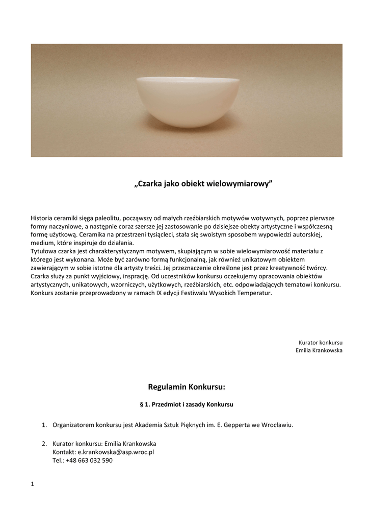 „Czarka jako obiekt wielowymiarowy” Historia ceramiki sięga paleolitu, począwszy od małych rzeźbiarskich motywów wotywnych, poprzez pierwsze formy naczyniowe, a następnie coraz szersze jej zastosowanie po dzisiejsze obekty artystyczne i współczesną formę użytkową. Ceramika na przestrzeni tysiącleci, stała się swoistym sposobem wypowiedzi autorskiej, medium, które inspiruje do działania. Tytułowa czarka jest charakterystycznym motywem, skupiającym w sobie wielowymiarowość materiału z którego jest wykonana. Może być zarówno formą funkcjonalną, jak również unikatowym obiektem zawierającym w sobie istotne dla artysty treści. Jej przeznaczenie określone jest przez kreatywność twórcy. Czarka służy za punkt wyjściowy, insprację. Od uczestników konkursu oczekujemy opracowania obiektów artystycznych, unikatowych, wzorniczych, użytkowych, rzeźbiarskich, etc. odpowiadających tematowi konkursu. Konkurs zostanie przeprowadzony w ramach IX edycji Festiwalu Wysokich Temperatur. Kurator konkursu Emilia Krankowska Regulamin Konkursu: § 1. Przedmiot i zasady Konkursu 1. Organizatorem konkursu jest Akademia Sztuk Pięknych im. E. Gepperta we Wrocławiu. 2. Kurator konkursu: Emilia Krankowska Kontakt: [email protected] Tel.: +48 663 032 590 1 3. Celem konkursu jest promocja ceramiki zarówno jako sztuki plastycznej jak i użytkowej, oraz zwiększenie świadomości wszechstronności tego tworzywa. 4. Przedmiotem konkursu jest opracowanie obiektów artystycznych, unikatowych, wzorniczych, użytkowych, rzeźbiarskich, etc., odpowiadających tematowi konkursu, który zostanie przeprowadzony w ramach IX edycji Festiwalu Wysokich Temperatur. 5. Do realizacji projektów wymagane jest użycie ceramiki 6. Autor, zgłaszając prace do konkursu, gwarantuje, że nie posiada ona wad prawnych oraz przyjmuje na siebie wszelkie ewentualne roszczenia osób trzecich związane z uchybieniami finansowo-prawnymi dotyczącymi zgłoszonej pracy. 7. Wszelkie pytania dotyczące Konkursu należy kierować drogą mailową na adres: [email protected] do dnia: § 2. Warunki uczestnictwa 1. Konkurs ma charakter otwarty, kierowany jest do wszystkich twórców posługujących się tworzywem ceramicznym. 2. Każdy uczestnik może zgłosić maksymalnie 2 obiekty. 3. Do Konkursu mogą przystąpić osoby, które: a. zapoznały się z niniejszym Regulaminem i zaakceptują jego postanowienia b. dostarczą Organizatorowi konkursu formularz zgłoszeniowy wraz z wymaganym obiektem konkursowycm do dnia: 10.06.2015. c. prace należy nadsyłać na adres: Konkurs „Czarka jako obiekt wielowymiarowy”. Z dopiskiem Emilia Krankowska Akademia Sztuk Pięknych im. E. Gepperta Ul. Traugutta 19/21 50-416 Wrocław lub złożyć osobiście na portierni ASP budynku Centrum Sztuki Użytkowej Centrum Innowacyjności, pod ww. adresem z wyraźnym opisem „Czarka jako obiekt wielowymiarowy” 4. Obiekt konkursowy musi zostać opatrzony 6-cyfrowym kodem. Nie może być oznakowany nazwą Uczestnika Konkursu składającego pracę, ani innymi informacjami umożliwiającymi zidentyfikowanie Autora obiektu przed rozstrzygnięciem Konkursu. 5. Do pracy należy dołączyć kopertę opatrzoną tym samym 6-cyfrowym kodem co obiekt. W kopercie należy umieścić wypełniony formularz zgłoszeniowy, oraz zdjęcie pracy w formie cyfrowej na płycie CD jeden autor składa jedną płytę CD i jeden formularz, niezależnie od ilości prac. Prace pozbawione formularza, zdjęcia, niezasygnowanie lub opatrzone nieczytelnie wypełnionym formularzem nie wezmą udziału w konkursie. 6. Zdjęcia załączone do prac należy zatytułować imieniem i nazwiskiem autora w układzie NAZWISKO_IMIĘ. Plik w formacie .jpg powinien mieć rozdzielczość 403x403 px. Zdjęcia powinny zostać wykonane zgodnie z ogólnie przyjętymi zasadami – na anonimowym tle podkreślającym walory pracy, z równomiernym oświetleniem, etc. Zdjęcia nie nadające się do publikacji ze względu na bardzo niską jakość zostaną wykluczone z głosowania Publiczności. Organizator zastrzega 2 sobie prawo do wykorzystania nadesłanych zdjęć w celu promocji konkursu oraz Festiwalu bez dodatkowych uzgodnień z autorami. 7. Nieprzekraczalny termin nadsyłania prac, to 31.05.2016. § 3. Warunki finansowe 1. Organizator przewiduje nagrody w dwóch kategoriach: a. Nagroda Jury: - I miejsce: 500pln, - II miejsce: 300pln, - III miejsce: 200pln, b. Nagroda Publiczności (przyznana podczas trawania Festiwalu): -I miejsce: 250pln, b. Nagroda Publiczności (przyznana podczas głosowania internetowego): -I miejsce: 250pln, 2. Nagrody Jury zostaną przyznane do 17.06.2016 3. Kwota zostanie przelana na indywidualne konto bankowe uczestnika 4. Jury wyłonione zostanie spośród środowiska akademickiego ASP we Wrocławiu i zaproszonych gości. Dokładny skład ogłoszony zostanie wkrótce na stronie internetowej i facebooku. 5. Głosowanie publiczności (b) odbędzie się na fanpage’u Festiwalu i trwać będzie od 10.06.2016 do 15.06.2016. O zwycięstwie zdecyduje ilość polubień zdjęcia pracy. W głosowaniu Publiczności wykorzystane zostaną zdjęcia nadesłane przez autorów. Organizator zastrzega sobie prawo do korekcji nadesłanych zdjęć, w celu zachowania spójnej formy prezentacji 6. Głosowanie publiczności (c) odbędzie się podczas Festiwalu Wysokich Temperatur i trwać będzie przez sobotę do momentu roztrzygnięcia konkursu. O zwycięstwie zdecyduje ilość głosów gości i uczestników Festiwalu. 7. Oficjalne rozstrzygnięcie konkursu oraz rozdanie nagród nastąpi na wernisażu wystawy pokonkursowej, która odbędzie się na terenie ASP im. E. Gepperta we Wrocławiu w czasie trwania Festiwalu 18.06.2015. 8. Na wystawie pokonkursowej zaprezentowane zostaną najlepsze spośród zgłoszonych prac. Decyzję o doborze prac podejmie Jury konkursu. § 5. Harmonogram 1. Ogłoszenie konkursu: 2. Składanie prac konkursowych do 10.06.2016 3 3. Głosowanie na na fan