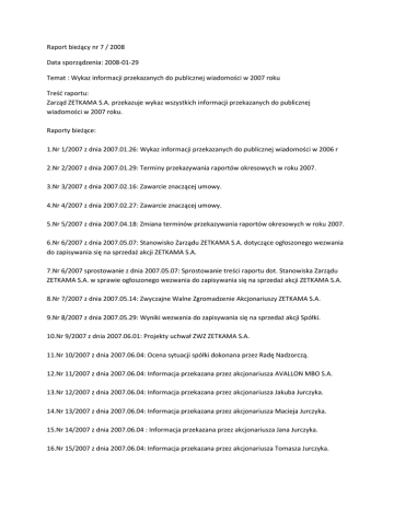 Raport bieżący nr 7 / 2008 Data sporządzenia: 2008-01-29 Temat : Wykaz informacji przekazanych do publicznej wiadomości w 2007 roku Treść raportu: Zarząd ZETKAMA S.A. przekazuje wykaz wszystkich informacji przekazanych do publicznej wiadomości w 2007 roku. Raporty bieżące: 1.Nr 1/2007 z dnia 2007.01.26: Wykaz informacji przekazanych do publicznej wiadomości w 2006 r 2.Nr 2/2007 z dnia 2007.01.29: Terminy przekazywania raportów okresowych w roku 2007. 3.Nr 3/2007 z dnia 2007.02.16: Zawarcie znaczącej umowy. 4.Nr 4/2007 z dnia 2007.02.27: Zawarcie znaczącej umowy. 5.Nr 5/2007 z dnia 2007.04.18: Zmiana terminów przekazywania raportów okresowych w roku 2007. 6.Nr 6/2007 z dnia 2007.05.07: Stanowisko Zarządu ZETKAMA S.A. dotyczące ogłoszonego wezwania do zapisywania się na sprzedaż akcji ZETKAMA S.A. 7.Nr 6/2007 sprostowanie z dnia 2007.05.07: Sprostowanie treści raportu dot. Stanowiska Zarządu ZETKAMA S.A. w sprawie ogłoszonego wezwania do zapisywania się na sprzedaż akcji ZETKAMA S.A. 8.Nr 7/2007 z dnia 2007.05.14: Zwyczajne Walne Zgromadzenie Akcjonariuszy ZETKAMA S.A. 9.Nr 8/2007 z dnia 2007.05.29: Wyniki wezwania do zapisywania się na sprzedaż akcji Spółki. 10.Nr 9/2007 z dnia 2007.06.01: Projekty uchwał ZWZ ZETKAMA S.A. 11.Nr 10/2007 z dnia 2007.06.04: Ocena sytuacji spółki dokonana przez Radę Nadzorczą. 12.Nr 11/2007 z dnia 2007.06.04: Informacja przekazana przez akcjonariusza AVALLON MBO S.A. 13.Nr 12/2007 z dnia 2007.06.04: Informacja przekazana przez akcjonariusza Jakuba Jurczyka. 14.Nr 13/2007 z dnia 2007.06.04: Informacja przekazana przez akcjonariusza Macieja Jurczyka. 15.Nr 14/2007 z dnia 2007.06.04 : Informacja przekazana przez akcjonariusza Jana Jurczyka. 16.Nr 15/2007 z dnia 2007.06.04: Informacja przekazana przez akcjonariusza Tomasza Jurczyka. 17.Nr 16/2007 z dnia 2007.06.05: Informacja o transakcji Członka Zarządu Spółki. 18.Nr 17/2007 z dnia 2007.06.05: Informacja o transakcji Członka Zarządu Spółki. 19.Nr 18/2007 z dnia 2007.06.05: Informacja o transakcji Członka Zarządu Spółki. 20.Nr 19/2007 z dnia 2007.06.05: Informacja o transakcji Członka Zarządu Spółki. 21.Nr 20/2007 z dnia 2007.06.06: Informacja przekazana przez akcjonariusza. 22.Nr 21/2007 z dnia 2007.06.13: Uchwały ZWZA ZETKAMA S.A. 23.Nr 22/2007 z dnia 2007.06.13: Odwołanie ze składu Rady Nadzorczej Spółki. 24.Nr 23/2007 z dnia 2007.06.13: Odwołanie ze składu Rady Nadzorczej Spółki. 25.Nr 24/2007 z dnia 2007.06.13: Odwołanie ze składu Rady Nadzorczej Spółki. 26.Nr 25/2007 z dnia 2007.06.13: Powołanie w skład Rady Nadzorczej Spółki. 27.Nr 26/2007 z dnia 2007.06.13: Powołanie w skład Rady Nadzorczej Spółki. 28.Nr 27/2007 z dnia 2007.06.13: Powołanie w skład Rady Nadzorczej Spółki. 29.Nr 28/2007 z dnia 2007.06.13: Powołanie w skład Rady Nadzorczej Spółki. 30.Nr 29/2007 z dnia 2007.06.13: Powołanie w skład Rady Nadzorczej Spółki. 31.Nr 30/2007 z dnia 2007.06.13: Powołanie w skład Rady Nadzorczej Spółki. 32.Nr 31/2007 z dnia 2007.06.18: Akcjonariusze posiadający, co najmniej 5% głosów na ZWZ "ZETKAMA S.A." w dniu 12 czerwca 2007 roku. 33.Nr 32/2007 z dnia 2007.06.18: Oświadczenie Zarządu ZETKAMA S.A. w sprawie przestrzegania zasad ładu korporacyjnego. 34.Nr 33/2007 z dnia 2007.06.21: Wybór Audytora. 35.Nr 34/2007 z dnia 2007.08.14: Informacja przekazana przez akcjonariusza. 36.Nr 35/2007 z dnia 2007.09.14: Informacja dot. zakończenia realizacji inwestycji. 37.Nr 36/2007 z dnia 2007.09.17: Zmiana daty przekazania raportu półrocznego. 38.Nr 37/2007 z dnia 2007.10.18: Podpisanie porozumienia w sprawie konsolidacji ze Śrubena Unia S.A. 39.Nr 38/2007 z dnia 2007.11.14: Nadzwyczajne Walne Zgromadzenie Akcjonariuszy ZETKAMA S.A. 40.Nr 39/2007 z dnia 2007.11.28: Projekty uchwał NWZA ZETKAMA S.A. 41.Nr 40/2007 z dnia 2007.12.04: Opinia Niezależnego Biegłego Rewidenta. 42.Nr 41/2007 z dnia 2007.12.07: Uchwały NWZA ZETKAMA S.A. 43.Nr 42/2007 z dnia 2007.12.11: Akcjonariusze posiadający, co najmniej 5% głosów na NZWA ZETKAMA S.A. w dniu 6 grudnia 2007 roku. Raporty okresowe: 1.Raport kwartalny za IV kwartał 2006 (Q 4/2006) z dnia 14.02.2007 r. 2.Raport kwartalny za I kwartał 2007 (Q 1/2007) z dnia 24.04.2007 r. 3.Raport kwartalny za II kwartał 2007 (Q 2/2007) z dnia 02.08.2007 r. 4.Raport kwartalny za III kwartał 2007 (Q 3/2007) z dnia 30.10.2007 r. 5.Raport półroczny P 2007 z dnia 20.09.2007 r. 6.Raport roczny za 2006 z dnia 24.04.2007 r. Wszystkie wymienione powyżej raporty są dostępne w siedzibie Spółki w Ścinawce Średniej przy ul. 3 Maja 12, oraz na stronie internetowej Spółki: www.zetkama.com.pl . Podstawa prawna Art. 65 ust. 1 Ustawy o ofercie - wykaz informacji przekazanych do publicznej wiadomości
