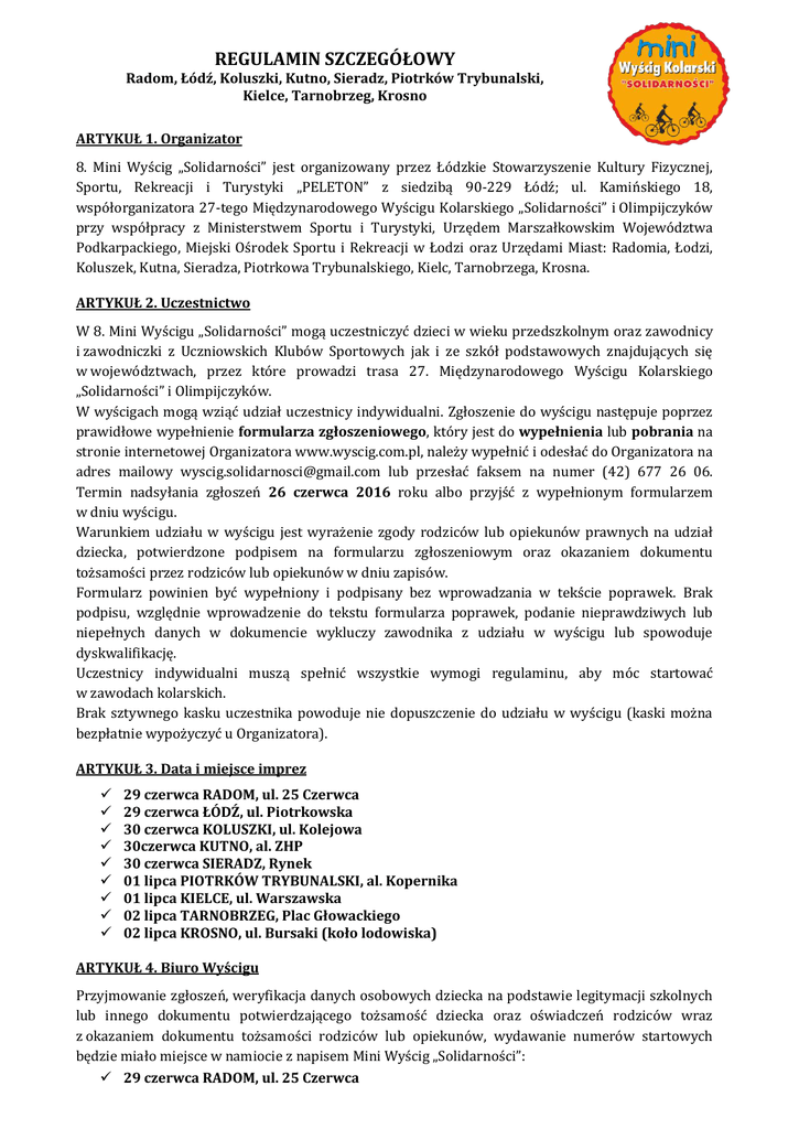 REGULAMIN SZCZEGÓŁOWY Radom, Łódź, Koluszki, Kutno, Sieradz, Piotrków Trybunalski, Kielce, Tarnobrzeg, Krosno ARTYKUŁ 1. Organizator 8. Mini Wyścig „Solidarności” jest organizowany przez Łódzkie Stowarzyszenie Kultury Fizycznej, Sportu, Rekreacji i Turystyki „PELETON” z siedzibą 90-229 Łódź; ul. Kamińskiego 18, współorganizatora 27-tego Międzynarodowego Wyścigu Kolarskiego „Solidarności” i Olimpijczyków przy współpracy z Ministerstwem Sportu i Turystyki, Urzędem Marszałkowskim Województwa Podkarpackiego, Miejski Ośrodek Sportu i Rekreacji w Łodzi oraz Urzędami Miast: Radomia, Łodzi, Koluszek, Kutna, Sieradza, Piotrkowa Trybunalskiego, Kielc, Tarnobrzega, Krosna. ARTYKUŁ 2. Uczestnictwo W 8. Mini Wyścigu „Solidarności” mogą uczestniczyć dzieci w wieku przedszkolnym oraz zawodnicy i zawodniczki z Uczniowskich Klubów Sportowych jak i ze szkół podstawowych znajdujących się w województwach, przez które prowadzi trasa 27. Międzynarodowego Wyścigu Kolarskiego „Solidarności” i Olimpijczyków. W wyścigach mogą wziąć udział uczestnicy indywidualni. Zgłoszenie do wyścigu następuje poprzez prawidłowe wypełnienie formularza zgłoszeniowego, który jest do wypełnienia lub pobrania na stronie internetowej Organizatora www.wyscig.com.pl, należy wypełnić i odesłać do Organizatora na adres mailowy [email protected] lub przesłać faksem na numer (42) 677 26 06. Termin nadsyłania zgłoszeń 26 czerwca 2016 roku albo przyjść z wypełnionym formularzem w dniu wyścigu. Warunkiem udziału w wyścigu jest wyrażenie zgody rodziców lub opiekunów prawnych na udział dziecka, potwierdzone podpisem na formularzu zgłoszeniowym oraz okazaniem dokumentu tożsamości przez rodziców lub opiekunów w dniu zapisów. Formularz powinien być wypełniony i podpisany bez wprowadzania w tekście poprawek. Brak podpisu, względnie wprowadzenie do tekstu formularza poprawek, podanie nieprawdziwych lub niepełnych danych w dokumencie wykluczy zawodnika z udziału w wyścigu lub spowoduje dyskwalifikację. Uczestnicy indywidualni muszą spełnić wszystkie wymogi regulaminu, aby móc startować w zawodach kolarskich. Brak sztywnego kasku uczestnika powoduje nie dopuszczenie do udziału w wyścigu (kaski można bezpłatnie wypożyczyć u Organizatora). ARTYKUŁ 3. Data i miejsce imprez 29 czerwca RADOM, ul. 25 Czerwca 29 czerwca ŁÓDŹ, ul. Piotrkowska 30 czerwca KOLUSZKI, ul. Kolejowa 30czerwca KUTNO, al. ZHP 30 czerwca SIERADZ, Rynek 01 lipca PIOTRKÓW TRYBUNALSKI, al. Kopernika 01 lipca KIELCE, ul. Warszawska 02 lipca TARNOBRZEG, Plac Głowackiego 02 lipca KROSNO, ul. Bursaki (koło lodowiska) ARTYKUŁ 4. Biuro Wyścigu Przyjmowanie zgłoszeń, weryfikacja danych osobowych dziecka na podstawie legitymacji szkolnych lub innego dokumentu potwierdzającego tożsamość dziecka oraz oświadczeń rodziców wraz z okazaniem dokumentu tożsamości rodziców lub opiekunów, wydawanie numerów startowych będzie miało miejsce w namiocie z napisem Mini Wyścig „Solidarności”: 29 czerwca RADOM, ul. 25 Czerwca 29 czerwca ŁÓDŹ, ul. Piotrkowska 30 czerwca KOLUSZKI, ul. Kolejowa 30czerwca KUTNO, al. ZHP 30 czerwca SIERADZ, Rynek 01 lipca PIOTRKÓW TRYBUNALSKI, al. Kopernika 01 lipca KIELCE, ul. Warszawska 02 lipca TARNOBRZEG, Plac Głowackiego 02 lipca KROSNO, ul. Bursaki (koło lodowiska) Weryfikacja zgłoszeń nadesłanych drogą elektroniczną nastąpi w namiocie z napisem Mini Wyścig „Solidarności”. ARTYKUŁ 5. Zasady rozgrywania wyścigów Wyścigi i ocena ich wyników będzie dokonana według Przepisów Sportowych Polskiego Związku Kolarskiego. Wyścigi będą rozgrywane ze startu wspólnego. W zawodach kolarskich prowadzone będą cztery klasyfikacje indywidualne. Dodatkowo w klasyfikacji indywidualnej kategorii A, B, C, D będą prowadzone oddzielne klasyfikacje dla dziewcząt i chłopców. Zwycięzcą indywidualnym danego wyścigu będzie zawodnik, który minie metę jako pierwszy. Uczestnicy wyścigu są zobowiązani do przestrzegania zasad określonych w regulaminie zawodów kolarskich. Zgłaszający się do udziału w zawodach uczestnicy kategorii wiekowej D (elfy) (11 – 12 lat), którzy posiadają licencje kolarskie zobowiązani są poinformować o tym osoby przyjmujące zgłoszenia. Każdy z uczestników jest zobowiązany podporządkować się poleceniom Komisji Sędziowskiej, Funkcjonariuszy Policji oraz Organizatora. ARTYKUŁN 5A. Województwo Łódzkie Dla uczestników w każdej kategorii wiekowej z podziałem na dziewczynki i chłopców, którzy wystartują co najmniej w trzech spośród pięciu zawodów na terenie Województwa Łódzkiego (Łódź, Koluszki, Kutno, Sieradz i Piotrków Trybunalski) będzie prowadzona Klasyfikacja Generalna dla najlepszego mini-kolarza Województwa Łódzkiego. Na mecie każdego z wyścigów 7 pierwszych zawodników otrzyma następującą liczbę punktów za zajęte miejsca: 1m–7 pkt., 2m–6 pkt., 3m–5 pkt., 4m–4 pkt., 5m–3 pkt., 6m–2 pkt., 7m–1 pkt. Aby zawodnik został sklasyfikowany musi wystartować co w najmniej trzech wyścigach. Jeśli zawodnik wystartuje w większej ilości zawodów do Klasyfikacji Generalnej zostaną przyjęte jego trzy najlepsze rezultaty. W przypadku równej liczby punktów o kolejności w klasyfikacji generalnej decyduje większa liczba pierwszych miejsc, następnie drugich i.t.d. W przypadku dalszego nie rozstrzygnięcia zwycięzcą zostanie młodszy z zawodników, których to dotyczy. ARTYKUŁ 6. Kategorie wiekowe Wyścigi będą rozegrane w następujących kategoriach wiekowych: 1) kategoria A (Chochliki) (do 5 lat) 2) kategoria B (Krasnale) (6 – 8 lat) 3) kategoria C (Skrzaty) (9 – 10 lat) 4) kategoria D (Elfy) (11 – 12 lat) 5) kategoria E (Elfy) (11 – 12 lat – posiadający licencję żaka) ARTYKUŁ 7. Dystanse wyścigów 1) kat. A (Chochliki) dystans ok. 200 m 2) kat. B (Krasnale) dystans od 800 m 3) kat. C (Skrzaty) dystans od 12