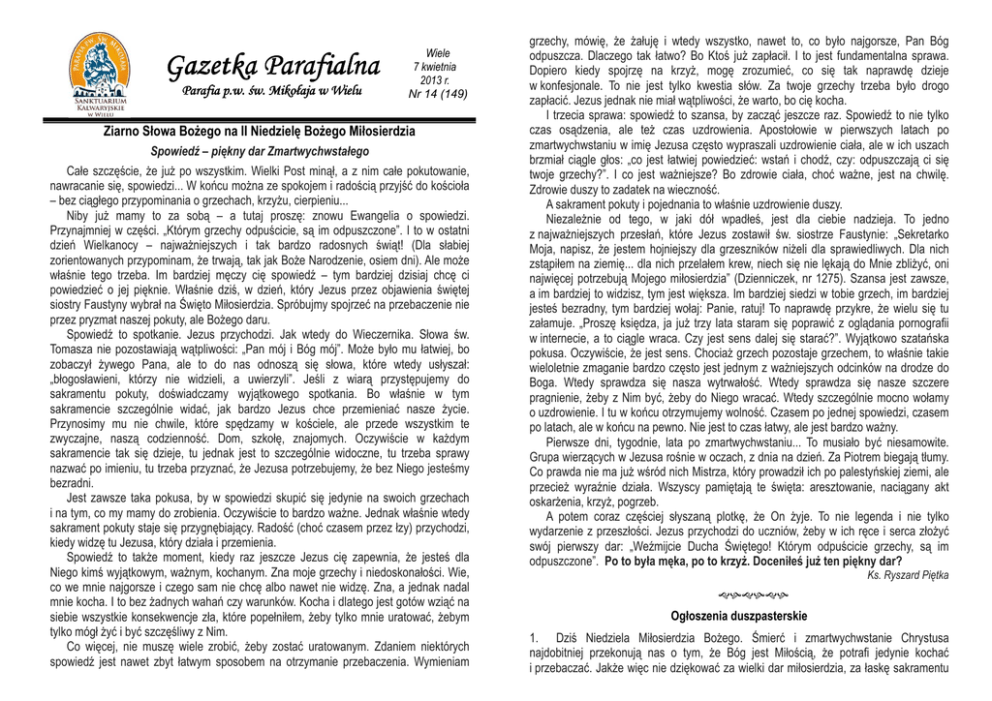 Gazetka Parafialna Parafia p.w. p.w. św. Mikołaja w Wielu Wiele 7 kwietnia 2013 r. Nr 14 (149) Ziarno Słowa Bożego na II Niedzielę Bożego Miłosierdzia Spowiedź – piękny dar Zmartwychwstałego Całe szczęście, że już po wszystkim. Wielki Post minął, a z nim całe pokutowanie, nawracanie się, spowiedzi... W końcu można ze spokojem i radością przyjść do kościoła – bez ciągłego przypominania o grzechach, krzyżu, cierpieniu... Niby już mamy to za sobą – a tutaj proszę: znowu Ewangelia o spowiedzi. Przynajmniej w części. „Którym grzechy odpuścicie, są im odpuszczone”. I to w ostatni dzień Wielkanocy – najważniejszych i tak bardzo radosnych świąt! (Dla słabiej zorientowanych przypominam, że trwają, tak jak Boże Narodzenie, osiem dni). Ale może właśnie tego trzeba. Im bardziej męczy cię spowiedź – tym bardziej dzisiaj chcę ci powiedzieć o jej pięknie. Właśnie dziś, w dzień, który Jezus przez objawienia świętej siostry Faustyny wybrał na Święto Miłosierdzia. Spróbujmy spojrzeć na przebaczenie nie przez pryzmat naszej pokuty, ale Bożego daru. Spowiedź to spotkanie. Jezus przychodzi. Jak wtedy do Wieczernika. Słowa św. Tomasza nie pozostawiają wątpliwości: „Pan mój i Bóg mój”. Może było mu łatwiej, bo zobaczył żywego Pana, ale to do nas odnoszą się słowa, które wtedy usłyszał: „błogosławieni, którzy nie widzieli, a uwierzyli”. Jeśli z wiarą przystępujemy do sakramentu pokuty, doświadczamy wyjątkowego spotkania. Bo właśnie w tym sakramencie szczególnie widać, jak bardzo Jezus chce przemieniać nasze życie. Przynosimy mu nie chwile, które spędzamy w kościele, ale przede wszystkim te zwyczajne, naszą codzienność. Dom, szkołę, znajomych. Oczywiście w każdym sakramencie tak się dzieje, tu jednak jest to szczególnie widoczne, tu trzeba sprawy nazwać po imieniu, tu trzeba przyznać, że Jezusa potrzebujemy, że bez Niego jesteśmy bezradni. Jest zawsze taka pokusa, by w spowiedzi skupić się jedynie na swoich grzechach i na tym, co my mamy do zrobienia. Oczywiście to bardzo ważne. Jednak właśnie wtedy sakrament pokuty staje się przygnębiający. Radość (choć czasem przez łzy) przychodzi, kiedy widzę tu Jezusa, który działa i przemienia. Spowiedź to także moment, kiedy raz jeszcze Jezus cię zapewnia, że jesteś dla Niego kimś wyjątkowym, ważnym, kochanym. Zna moje grzechy i niedoskonałości. Wie, co we mnie najgorsze i czego sam nie chcę albo nawet nie widzę. Zna, a jednak nadal mnie kocha. I to bez żadnych wahań czy warunków. Kocha i dlatego jest gotów wziąć na siebie wszystkie konsekwencje zła, które popełniłem, żeby tylko mnie uratować, żebym tylko mógł żyć i być szczęśliwy z Nim. Co więcej, nie muszę wiele zrobić, żeby zostać uratowanym. Zdaniem niektórych spowiedź jest nawet zbyt łatwym sposobem na otrzymanie przebaczenia. Wymieniam grzechy, mówię, że żałuję i wtedy wszystko, nawet to, co było najgorsze, Pan Bóg odpuszcza. Dlaczego tak łatwo? Bo Ktoś już zapłacił. I to jest fundamentalna sprawa. Dopiero kiedy spojrzę na krzyż, mogę zrozumieć, co się tak naprawdę dzieje w konfesjonale. To nie jest tylko kwestia słów. Za twoje grzechy trzeba było drogo zapłacić. Jezus jednak nie miał wątpliwości, że warto, bo cię kocha. I trzecia sprawa: spowiedź to szansa, by zacząć jeszcze raz. Spowiedź to nie tylko czas osądzenia, ale też czas uzdrowienia. Apostołowie w pierwszych latach po zmartwychwstaniu w imię Jezusa często wypraszali uzdrowienie ciała, ale w ich uszach brzmiał ciągle głos: „co jest łatwiej powiedzieć: wstań i chodź, czy: odpuszczają ci się twoje grzechy?”. I co jest ważniejsze? Bo zdrowie ciała, choć ważne, jest na chwilę. Zdrowie duszy to zadatek na wieczność. A sakrament pokuty i pojednania to właśnie uzdrowienie duszy. Niezależnie od tego, w jaki dół wpadłeś, jest dla ciebie nadzieja. To jedno z najważniejszych przesłań, które Jezus zostawił św. siostrze Faustynie: „Sekretarko Moja, napisz, że jestem hojniejszy dla grzeszników niżeli dla sprawiedliwych. Dla nich zstąpiłem na ziemię... dla nich przelałem krew, niech się nie lękają do Mnie zbliżyć, oni najwięcej potrzebują Mojego miłosierdzia” (Dzienniczek, nr 1275). Szansa jest zawsze, a im bardziej to widzisz, tym jest większa. Im bardziej siedzi w tobie grzech, im bardziej jesteś bezradny, tym bardziej wołaj: Panie, ratuj! To naprawdę przykre, że wielu się tu załamuje. „Proszę księdza, ja już trzy lata staram się poprawić z oglądania pornografii w internecie, a to ciągle wraca. Czy jest sens dalej się starać?”. Wyjątkowo szatańska pokusa. Oczywiście, że jest sens. Chociaż grzech pozostaje grzechem, to właśnie takie wieloletnie zmaganie bardzo często jest jednym z ważniejszych odcinków na drodze do Boga. Wtedy sprawdza się nasza wytrwałość. Wtedy sprawdza się nasze szczere pragnienie, żeby z Nim być, żeby do Niego wracać. Wtedy szczególnie mocno wołamy o uzdrowienie. I tu w końcu otrzymujemy wolność. Czasem po jednej spowiedzi, czasem po latach, ale w końcu na pewno. Nie jest to czas łatwy, ale jest bardzo ważny. Pierwsze dni, tygodnie, lata po zmartwychwstaniu... To musiało być niesamowite. Grupa wierzących w Jezusa rośnie w oczach, z dnia na dzień. Za Piotrem biegają tłumy. Co prawda nie ma już wśród nich Mistrza, który prowadził ich po palestyńskiej ziemi, ale przecież wyraźnie działa. Wszyscy pamiętają te święta: aresztowanie, naciągany akt oskarżenia, krzyż, pogrzeb. A potem coraz częściej słyszaną plotkę, że On żyje. To nie legenda i nie tylko wydarzenie z przeszłości. Jezus przychodzi do uczniów, żeby w ich ręce i serca złożyć swój pierwszy dar: „Weźmijcie Ducha Świętego! Którym odpuścicie grzechy, są im odpuszczone”. Po to była męka, po to krzyż. Doceniłeś już ten