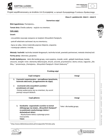 Klasa 3 –październik– blok 4 – dzień 5 Scenariusz zajęć Blok tygodniowy: Pamiętamy… Temat dnia: Chwila zadumy - wyjście na cmentarz. Cele zajęć: Uczeń: - zna polskie zwyczaje związane ze świętem Wszystkich Świętych; - potrafi właściwie zachować się na cmentarzu; - łączy ze sobą różne materiały poprzez klejenie, wiązanie; - rozwiązuje zadania z treścią. Metody i techniki: technika świateł drogowych, technika kciuki, powiedz partnerowi, metoda śnieżnej kuli. Formy pracy: zbiorowa, grupowa. Środki dydaktyczne: tekst dla każdej grupy, szare papiery, mazaki, cenki , gałązki świerkowe, kwiaty sztuczne, wstążki i inne elementy dekoracyjne, drucik, sznurek, przyniesione z domu znicze, nagranie ,,Dla Elizy..” prezentacja ,,Pamiętamy ..Wszystkich Świętych i Dzień Zaduszny”1 Przebieg zajęć Część wstępna Uwagi 2. Liczmanek wita wszystkich uczniów i przedstawia cel zajęć: -Dzisiaj wybierzemy się na cmentarz, by uczcić pamięć naszych bliskich. Część główna 1. Swobodne wypowiedzi uczniów na temat zbliżającego się święta ,,Wszystkich Świętych” na podstawie wysłuchanego tekstu i doświadczeń dzieci. - Wysłuchanie tekstu czytanego przez nauczyciela. Tekst: 1 http://www.bibliotekawszkole.pl/inne/gazetki/74/index.php Uwagi Tekst dla każdej grupy. Scenariusz zajęć klasa III – wrzesień - blok 5 – dzień 2 - Strona1 1. Czynności organizacyjno – porządkowe (powitanie, kontrola obecności, przygotowanie do zajęć). Każdego roku, w dniu Wszystkich Świętych odwiedzamy wszyscy cmentarze. Jesteśmy wtedy odświętnie ubrani. Na groby przynosimy kwiaty i znicze. Kwiaty są symbolem naszej miłości ku tym, którzy odeszli, znicze – symbolem modlitwy. Zawsze towarzyszy nam w tym dniu chwila zadumy. Wspominamy tych, którzy odeszli, ale na zawsze pozostają w naszej pamięci. - Redagowanie pytań do tekstu – praca w grupach - Technika kciuki. Nauczyciel prosi uczniów o wskazanie za pomocą kciuków stopnia zrozumienia polecenia. - kciuk do góry - ,,zrozumiałem” - kciuk poziomo - ,,częściowo zrozumiałem” - kciuk w dół - ,,nie zrozumiałem” – proszę o pomoc. Szare papiery, mazaki, cenki. Przygotowanie do wyjścia na cmentarz. 3. ,,Wiązanka na groby najbliższych”- łączenie różnych materiałów ze sobą poprzez wiązanie – praca w grupach przy dźwiękach nagrania. Każda grypa składająca się z trzech, czterech osób wykonuje jedną wiązankę z wcześniej przygotowanych materiałów takich jak: gałązki świerkowe, kwiaty sztuczne, wstążki i inne elementy dekoracyjne. Uczniowie łączą je ze sobą za pomocą sznurka lub cienkiego drutu. Po wykonaniu pracy następuje ocena koleżeńska zgodnie z wcześniej ustalonymi kryteriami. 4. Wyjście na cmentarz, zapalenie zniczy i złożenie wiązanek na grobie Nieznanego Żołnierza. Uczniowie wspólnie z wychowawcą wyruszają na cmentarz, pamiętając o wcześniej ustalonych zasadach zachowania się. - Zapalenie zniczy, złożenie wiązanek oraz Gałązki świerkowe, kwiaty sztuczne, wstążki i inne elementy dekoracyjne, drucik, sznurek Nagranie ,,Dla Elizy..” Scenariusz zajęć klasa III – wrzesień - blok 5 – dzień 2 - Strona2 2. Jak należy zachować się na cmentarzu? – praca grupowa. Każda grupa redaguje zasady zachowania się na cmentarzu oraz w czasie drogi. Uczniowie swoje propozycje zapisują na szarych papierach. Liderzy grup głośno je odczytują, następnie zostaje stworzona wspólna praca pt. ,,Jak należy zachować się na cmentarzu?” Po analizie ortograficznej, gotowe zasady uczniowie zapisują w zeszytach. uczczenie pamięci zmarłych chwilą ciszy. Powrót do klasy. 5. Czas na ważne pytanie Liczmanka – Metoda śnieżnej kuli. - Dlaczego należy pamiętać o ludziach, których już wśród nas nie ma? - Uczniowie dzielą się refleksjami na w/w temat w parach, następnie w czwórkach, ósemkach i na forum klasy. Kasia ma 30 zł. Chce kupić mamie bukiet. Pomóż jej wybrać kwiaty tak, by wydała wszystkie pieniądze. Podaj kilka propozycji. Zadanie 2 Basia kupiła kolorową wstążkę i jedną kompozycję kwiatową. Za zakupy zapłaciła 24 zł. Ile kosztowała wstążka, jeżeli kompozycja kosztowała 18 zł? Zadanie 3 Jeżeli jeden znicz kosztuje 2 zł 50 groszy, to ile zapłacisz? a) za 2 znicze b) za 4 znicze c) za 6 zniczy? Zadanie 4 Bartek miał 20 zł. Ile reszty dostał w sklepie, jeśli kupił dwa znicze po 5 zł i zapalarkę do zniczy za . Scenariusz zajęć klasa III – wrzesień - blok 5 – dzień 2 - Strona3 6. Zadanko Liczmanka Kasia ma 100 zł. Które z wymienionych rzeczy może kupić? Podaj wszystkie możliwości, wiedząc, że: Wstążka kosztuje – 12 zł, gąbka do kwiatów sztucznych – 19 zł, kwiaty czerwone – 14zł, kwiaty białe – 18 zł, asparagus – 15 zł, kwiaty żółte 25 zł, zielone gałązki – 10 zł. 7. Ćwiczenia w obliczaniu wartości zakupów i cen – rozwiązywanie zadań. Zadanie 1 Rysunek 5 kwiatów i pod nimi ceny. Róża – 7 zł Tulipan – 3 zł Irys – 5 zł Żonkil – 2 zł Bratek – 1 zł 7 zł? Zadanie 5 Marek ma 20 zł w monetach pięciozłotowych i 40 zł w monetach dwuzłotowych. Ile monet ma Marek? Zadanie 6 Karolina robiła zakupy w sklepie papierniczym i kupiła: Długopis za 1 zł 20 gr Zeszyt za 80 gr Gumkę za 30 gr Papeterie za 4 zł, 30 gr Czy 15 zł wystarczyło Karolinie na zakupy w sklepie papierniczym? Czy otrzyma resztę? Ponumeruj zakupy w kolejności od najtańszego do najdroższego. Uczniowie wykonują zadania w dwuosobowych grupach, następnie sprawdzają poprawność wykonanej pracy za pomocą: Techniki świateł drogowych. Część końcowa 1. Podsumowanie zajęć – powiedz partnerowi: Nauczyciel prosi uczniów o podsumowanie tematu w parach. Uczniowie odpowiadają sobie nawzajem na pytania: - Jakiej jednej rzeczy się dzisiaj nauczyłem? - Co było dla mnie łatwe? - Co było dla mnie trudne? - Czego chciałbym się jes