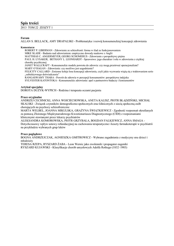 Spis treści 2013 TOM 22 ZESZYT 1 Forum ALLAN S. BELLACK, AMY DRAPALSKI - Problematyka i rozwój konsumenckiej koncepcji zdrowienia Komentarze ROBERT P. LIBERMAN - Zdrowienie ze schizofrenii: forma w ślad za funkcjonowaniem MIKE SLADE - Badania nad zdrowieniem: empiryczne dowody naukowe z Anglii MATTHIAS C. ANGERMEYER, GEORG SCHOMERUS - Zdrowienie z perspektywy piętna PAUL H. LYSAKER, BETHANY L. LEONHARDT - Sprawstwo: jego charakter i rola w zdrowieniu z ciężkiej choroby psychicznej JANET WALLCRAFT - Konsumenckie modele powrotu do zdrowia: czy mogą przetrwać operacjonalizm? MARY O’HAGAN - Zdrowienie: czy możliwe jest uzgodnienie? FELICITY CALLARD - Zmienne koleje losu koncepcji zdrowienia, czyli jakie wyzwania wiążą się z traktowaniem serio „subiektywnego doświadczenia” RANGASWAMY THARA - Powrót do zdrowia w percepcji konsumentów: perspektywa indyjska SYLVESTER KATONTOKA - Konsumenckie zdrowienie: apel o partnerstwo badaczy i konsumentów Artykuł specjalny DOROTA DUŻYK-WYPICH - Rodzina i terapeuta oczami pacjenta Prace oryginalne ANDRZEJ CECHNICKI, ANNA WOJCIECHOWSKA, ANETA KALISZ, PIOTR BŁĄDZIŃSKI, MICHAŁ SKALSKI - Związek czynników demograficzno-społecznych oraz klinicznych z siecią społeczną osób chorujących na psychozy schizofreniczne MARTA WELBEL, JOANNA MIKULSKA, GRAŻYNA ŚWIĄTKIEWICZ - Zgodność rozpoznań określanych za pomocą Złożonego Międzynarodowego Kwestionariusza Diagnostycznego (CIDI) z rozpoznaniami klinicznymi stawianymi przez lekarzy psychiatrów ALEKSANDRA KOMOROWSKA, PIOTR GRZYBAŁA, BOGDAN FALKIEWICZ, ANNA SMAGA Dotychczasowy wpływ ustawy refundacyjnej na zachowania terapeutyczne i koszty farmakoterapii w psychiatrii na przykładzie wybranych grup leków Prace poglądowe BOGNA ANDRZEJCZAK, AGNIESZKA GMITROWICZ - Wybrane zagadnienia z medycyny snu dzieci i młodzieży TERESA RZEPA, RYSZARD ŻABA - Leon Wernic jako zwolennik i propagator eugeniki RYSZARD KUJAWSKI - Klasyfikacje chorób umysłowych Adolfa Rothego (1832–1903) Contents 2013 VOLUME 22 ISSUE 1 Forum ALLAN S. BELLACK, AMY DRAPALSKI - Issues and developments on the consumer recovery construct Commentaries ROBERT P. LIBERMAN - Recovery from schizophrenia: form follows functioning MIKE SLADE - Recovery research: the empirical evidence from England MATTHIAS C. ANGERMEYER, GEORG SCHOMERUS - A stigma perspective on recovery PAUL H. LYSAKER, BETHANY L. LEONHARDT - Agency: its nature and role in recovery from severe mental illness JANET WALLCRAFT - Consumer models of recovery: can they survive operationalism? MARY O’HAGAN - Recovery: is consensus possible? FELICITY CALLARD - The vicissitudes of the recovery construct; or, the challenge of taking “subjective experience” seriously RANGASWAMY THARA - Consumer perceptions of recovery: an Indian perspective SYLVESTER KATONTOKA - Consumer recovery: a call for partnership between researchers and consumers Special article DOROTA DUŻYK -WYPICH - The family and therapist through the patient’s eyes Original papers ANDRZEJ CECHNICKI, ANNA WOJCIECHOWSKA, ANETA KALISZ, PIOTR BŁĄDZIŃSKI, MICHAŁ SKALSKI - Relationship of socio-demographic and clinical predictors with social networks in people suffering from schizophrenic psychoses MARTA WELBEL, JOANNA MIKULSKA, GRAŻYNA ŚWIĄTKIEWICZ - Concordance between diagnoses based on the Composite International Diagnostic Interview (CIDI) and clinical diagnoses made by psychiatrists ALEKSANDRA KOMOROWSKA, PIOTR GRZYBAŁA, BOGDAN FALKIEWICZ, ANNA SMAGA - The effect of the Reimbursement Act on therapeutic management and pharmacotherapy costs in psychiatry to date as exemplified by selected drug groups Reviews BOGNA ANDRZEJCZAK, AGNIESZKA GMITROWICZ - Sleep disorders among children and adolescents – selected issues TERESA RZEPA, RYSZARD ŻABA - Leon Wernic as a supporter and promoter of eugenics RYSZARD KUJAWSKI - Classifications of mental disorders by Adolf Rothe (1832-1903)