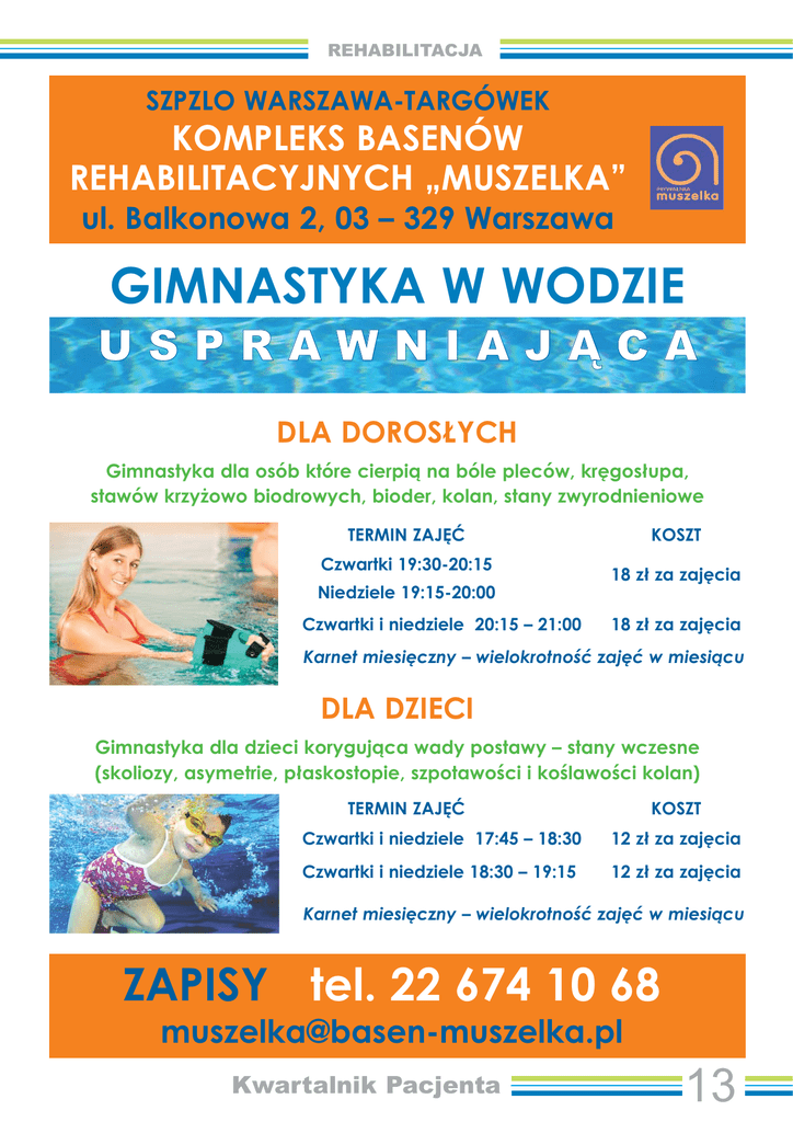 REHABILITACJA SZPZLO WARSZAWA-TARGÓWEK KOMPLEKS BASENÓW REHABILITACYJNYCH „MUSZELKA” ul. Balkonowa 2, 03 – 329 Warszawa GIMNASTYKA W WODZIE USPRAWNIAJĄCA DLA DOROSŁYCH Gimnastyka dla osób które cierpią na bóle pleców, kręgosłupa, stawów krzyżowo biodrowych, bioder, kolan, stany zwyrodnieniowe TERMIN ZAJĘĆ Czwartki 19:30-20:15 KOSZT 18 zł za zajęcia Niedziele 19:15-20:00 Czwartki i niedziele 20:15 – 21:00 18 zł za zajęcia Karnet miesięczny – wielokrotność zajęć w miesiącu DLA DZIECI Gimnastyka dla dzieci korygująca wady postawy – stany wczesne (skoliozy, asymetrie, płaskostopie, szpotawości i koślawości kolan) TERMIN ZAJĘĆ KOSZT Czwartki i niedziele 17:45 – 18:30 12 zł za zajęcia Czwartki i niedziele 18:30 – 19:15 12 zł za zajęcia Karnet miesięczny – wielokrotność zajęć w miesiącu ZAPISY tel. 22 674 10 68 [email protected] Kwartalnik Pacjenta 13