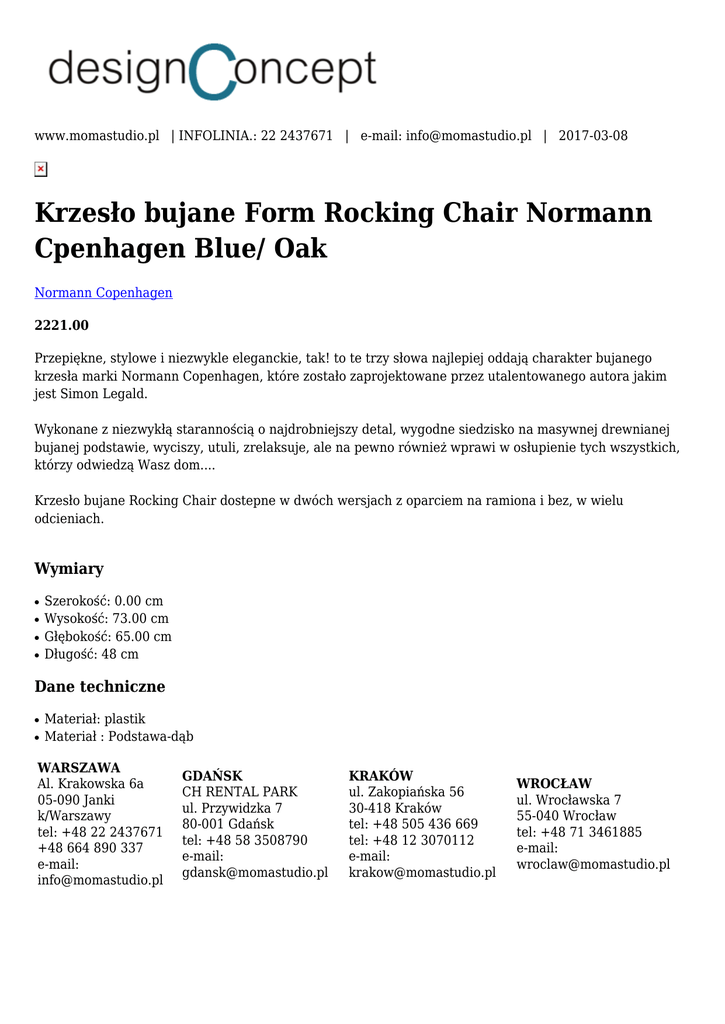 www.momastudio.pl | INFOLINIA.: 22 2437671 | e-mail: [email protected] | 2017-03-08 Krzesło bujane Form Rocking Chair Normann Cpenhagen Blue/ Oak Normann Copenhagen 2221.00 Przepiękne, stylowe i niezwykle eleganckie, tak! to te trzy słowa najlepiej oddają charakter bujanego krzesła marki Normann Copenhagen, które zostało zaprojektowane przez utalentowanego autora jakim jest Simon Legald. Wykonane z niezwykłą starannością o najdrobniejszy detal, wygodne siedzisko na masywnej drewnianej bujanej podstawie, wyciszy, utuli, zrelaksuje, ale na pewno również wprawi w osłupienie tych wszystkich, którzy odwiedzą Wasz dom.... Krzesło bujane Rocking Chair dostepne w dwóch wersjach z oparciem na ramiona i bez, w wielu odcieniach. Wymiary ● ● ● ● Szerokość: 0.00 cm Wysokość: 73.00 cm Głębokość: 65.00 cm Długość: 48 cm Dane techniczne ● ● Materiał: plastik Materiał : Podstawa-dąb WARSZAWA Al. Krakowska 6a 05-090 Janki k/Warszawy tel: +48 22 2437671 +48 664 890 337 e-mail: [email protected] GDAŃSK CH RENTAL PARK ul. Przywidzka 7 80-001 Gdańsk tel: +48 58 3508790 e-mail: [email protected] KRAKÓW ul. Zakopiańska 56 30-418 Kraków tel: +48 505 436 669 tel: +48 12 3070112 e-mail: [email protected] WROCŁAW ul. Wrocławska 7 55-040 Wrocław tel: +48 71 3461885 e-mail: [email protected]