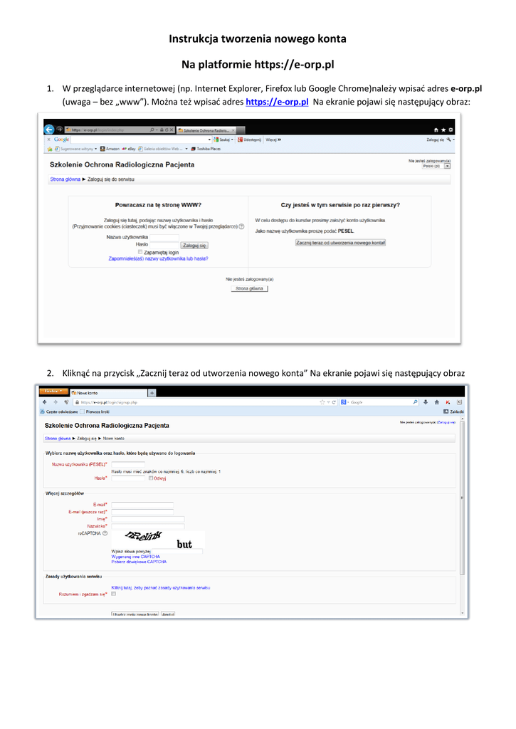 Instrukcja tworzenia nowego konta Na platformie https://e-orp.pl 1. W przeglądarce internetowej (np. Internet Explorer, Firefox lub Google Chrome)należy wpisać adres e-orp.pl (uwaga – bez „www”). Można też wpisać adres https://e-orp.pl Na ekranie pojawi się następujący obraz: 2. Kliknąć na przycisk „Zacznij teraz od utworzenia nowego konta” Na ekranie pojawi się następujący obraz 3. Należy wypełnić wszystkie pola oznaczone kolorem czerwonym. Hasło należy sobie wymyśleć samodzielnie i zapisać na kartce lub w kalendarzu. W przyszłości będzie ono konieczne do logowania się na platformę szkoleniową. Należy także zapoznać się z zasadami użytkowania serwisu klikając w dole ekranu napis „Kliknij tutaj, żeby poznać zasady użytkowania serwisu”. Należy zaakceptować regulamin klikając w kwadrat przy napisie „Rozumiem i zgadzam się” w dole ekranu. Pewną trudność może sprawić odczytanie tzw. CAPTCHA. Jest to zabezpieczenie przed działaniem szkodliwych programów komputerowych krążących w sieci, tworzących „martwe konta”. Żaden dotychczasowy program komputerowy nie jest w stanie odczytać tak zdeformowanych liter. W ten sposób administrator serwisu ma pewność, że konto jest tworzone przez „rzeczywistego” człowieka, a nie przez szkodliwy program komputerowy. Należy odczytać zdeformowane litery i wpisać je w odpowiednie pole. W razie gdy nie jesteśmy w stanie odczytać zdeformowanych liter należy kliknąć „Wygeneruj inne CaPTCHA”. Można też próbować pobrać dźwiękowe CAPTCHA. 4. Po wypełnieniu wszystkich pól i zaakceptowaniu regulaminu należy kliknąć na przycisk „Utwórz moje nowe konto”. Pojawi się następujący obraz 5. Następnie należy odebrać swoją pocztę e-mail. Na skrzynce powinna być wiadomość od „Admin User” zatytułowana „Potwierdzenie dla konta Szkolenie Ochrona Radiologiczna Pacjenta”. Należy otworzyć tę wiadomość. W wiadomości tej podany będzie dość skomplikowany adres internetowy. Można spróbować kliknąć na niego. Jeżeli to się nie powiedzie należy zaznaczyć ten adres, skopiować i wkleić jako adres do przeglądarki internetowej. Po pomyślnym wykonaniu powyższych czynności powinien pokazać się poniższy ekran 6. Automatycznie jest się wówczas zalogowanym i można przejść do zapoznawania się z platformą, klikając na „Stronę główną”. Konto zostało pomyślnie założone. Z platformy można się wylogować klikając niebieski napis”(Wyloguj)” w prawej górnej części ekranu. 7. Jeśli chcemy ponownie korzystać z platformy szkoleniowej należy wejść na stronę https://e-orp.pl Tym razem należy wypełnić pole „Nazwa użytkownika” podając PESEL oraz wpisać wymyślone wcześniej przez siebie w procesie rejestracji i zapisane w wiadomym sobie miejscu hasło.