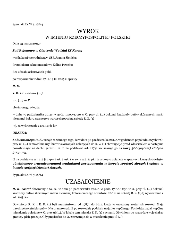 Sygn. akt IX W 5118/14 WYROK W IMIENIU RZECZYPOSPOLITEJ POLSKIEJ Dnia 23 marca 2015 r. Sąd Rejonowy w Olsztynie Wydział IX Karny w składzie:Przewodniczący: SSR Joanna Sienicka Protokolant: sekretarz sądowy Kalina Pawełko Bez udziału oskarżyciela publ. po rozpoznaniu w dniu 17 II, 19 III 2015 r. sprawy R. K. s. R. i J. z domu (...) ur. (...) w P. obwinionego o to, że: w dniu 30 października 2014r. w godz. 17:00-17:30 w O. przy ul. (...) dokonał kradzieży butów skórzanych marki nieznanej koloru czarnego o wartości 200 zł na szkodę R. Z. (1) - tj. za wykroczenie z art. 119§1 kw ORZEKA: I obwinionego R. K. uznaje za winnego tego, że w dniu 30 października 2014r. w godzinach popołudniowych w O. przy ul. (...) samowolnie użył butów skórzanych należących do R. Z. (1) chowając je przed właścicielem a następnie pozostawiając na dachu garażu i za to na podstawie art. 127§1 kw skazuje go na karę 500(pięćset) złotych grzywny; II na podstawie art. 118 § 1 kpw i art. 3 ust. 1 w zw. z art. 21 pkt. 2 ustawy o opłatach w sprawach karnych obciąża obwinionego zryczałtowanymi wydatkami postępowania w kwocie 100(sto) złotych i opłatą w kwocie 50(pięćdziesiąt) złotych. Sygn. akt IX W 5118/14 UZASADNIENIE R. K. został obwiniony o to, że: w dniu 30 października 2014r. w godz. 17:00-17:30 w O. przy ul. (...) dokonał kradzieży butów skórzanych marki nieznanej koloru czarnego o wartości 200 zł na szkodę R. Z. (1) tj wykroczenie z art. 119§1kw Obwiniony R. K. i E. K. (1) byli małżeństwem od 1987r do 2011, kiedy to orzeczony został ich rozwód. Mają trzech pełnoletnich synów. Nie przeprowadzili po rozwodzie podziału majątku wspólnego. Posiadają nadal wspólne mieszkanie położone w O. przy ul (...). W lokalu tym mieszka E. K. (1) z synami. Obwiniony po rozwodzie wyjechał za granicę, gdzie pracuje. Gdy przyjeżdża do O. zatrzymuje się w mieszkaniu przy ul (...). W dniu 30 października 2014r. w godzinach popołudniowych E. K. (1) zaprosiła do swojego mieszkania pokrzywdzonego R. Z. (1). Przyjaźni się nim. Pokrzywdzony w mieszkaniu, na korytarzu, zostawił kurtkę i buty. Postawił je obok obuwia innych domowników. Następnie wszedł do pokoju E. K. (1). Rozmawiali. W tym czasie w mieszkaniu przebywał syn E. M. K.. Po chwili do mieszkania przyszedł obwiniony. R. K. był niezadowolony z obecność pokrzywdzonego . Po wyjściu E. K. (1) z pokoju do łazienki wszedł do pomieszczenia w który przebywał R. Z. (1). Przedrzeźniał go, prowokował do kłótni, przewrócił go na podłogę. Pokrzywdzony bronił sie przed uderzeniem. E. K. z synem M. rozdzielili obwinionego i pokrzywdzonego. Obwiniony nadal zachowywał się agresywnie. Krzyczał, obrażał R. Z. (1). E. K. wezwała policje. Na miejsce zdarzenia około godziny 19.45 przybyła patrol w składzie (...). Pokrzywdzony opisał im zajście, następnie zaczął ubierać się w kurtkę zamierzając opuścić mieszkanie. Spieszył sie na pociąg. Na korytarzu nie było jego butów w miejscu, w którym je zostawił. Razem z E. K. szukali ich. Bezskutecznie. Pokrzywdzony wyszedł z mieszkania w starych butach jednego z synów E. K.. Obwiniony w obecności E. K. (1) śmiał się. R. Z. (1) w dniu 31 X 2014r złożył zawiadomienie o dokonaniu na jego szkodę kradzieży butów skórzanych koloru czarnego, zapinanych z boku na zamek, o wartości około 200zł. Po zdarzeniu z 30 X 2014r obwiniony wyjechał ponownie za granicę. Do O. przyjechał po około miesiącu . W dniu 28 listopada 2014r został przesłuchany przez policję jako osoba podejrzana o popełnienie wykroczenia. Zarzucono mu dokonanie kradzieży butów R. Z. (1). Obwiniony poinformował wówczas policjantów, iż widział jakieś buty leżące na dachu garażu . W dniu 1 grudnia 2014r E. K. (1) została poproszona przez funkcjonariuszy policji by z pokrzywdzony sprawdzili, czy na dachu garażu leżą buty. Następnego dnia zauważyła leżące na garażu buty, zrobiła zdjęcie. Razem z R. Z. (1) udali się w rejon garaży i przy użyciu drabiny dostali się dach, zdjęli buty z dachu garażu . Pokrzywdzony rozpoznał je jako utracone w dniu 30 X 2014r. (d. zawiadomienie k 3, zeznania R. Z. k 36-36v5v, E. K. k 43-43v, 18v , W. S. k 42-42v, P. M. (1) k 35v, M. K. (1) k 42v, M. K. (2) k 42v-43, wyjaśnienia obwinionego k 35-35v,24-25, raport k 7-12, notatka k 13,14,15,16, zdjęcie k 21, 22) Obwiniony nie przyznał siędo popełnienia zarzucanego mu czynu. Wyjaśnił, iż nie zabrał butów pokrzywdzonego. Nie życzy sobie by w mieszkaniu nocowali inni mężczyźni bo mieszkają w nim jego dzieci-synowie w wieku od 21 do 27 lat. Przyznał, że powiedział pokrzywdzonemu, że nie życzy sobie schadzek w mieszkaniu. Pokrzywdzony zachowywał się wówczas stosownie, może więc niesłusznie tak stwierdził, być może emocje nim kierowały. Buty leżące na dachu zauważył następnego dnia . Sąd nie dał wiary wyjaśnieniom obwinionego, uznając je za przejaw przyjętej przez niego linii obrony zmierzającej do uniknięcia odpowiedzialności za zarzucane mu wykroczenie. Twierdzenia obwinionego pozostają w sprzeczności z zeznaniami pokrzywdzonego, E. K. (1), z zasadami doświadczenia życiowego i logicznego rozumowania. R. Z. (1) zeznał, że przyjaźni się z E. K. (1), często dowiedział ją w jej mieszkaniu ale nigdy w nim nie nocował. Niejednokrotnie widywał się przy tych okazjach z synami E. K., ich relacje układały się poprawnie, nie dochodziło do jakikolwiek scysji, czy awantur, nie spotykał się z niechęcią z ich strony. W dniu zdarzenia przebywał w pokoju E. K., rozmawiali. Gdy jego znajoma wyszła z pomieszczenia, wszedł do niego obwiniony, przezywał go, doszło miedzy nimi do przepychanki. Brak butów stwierdził gdy chciał opuścić mieszkanie około godziny 20. Podczas szukania butów, które zostawił na korytarzu, obwiniony był pytany czy ich nie widział. Sugerował, że pokrzywdzony przyszedł w 