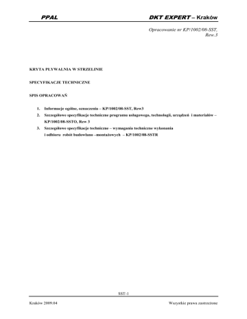 PPAL DKT EXPERT – Kraków Opracowanie nr KP/1002/08-SST, Rew.3 KRYTA PŁYWALNIA W STRZELINIE SPECYFIKACJE TECHNICZNE SPIS OPRACOWAŃ 1. Informacje ogólne, oznaczenia – KP/1002/08-SST, Rew3 2. Szczegółowe specyfikacje techniczne programu usługowego, technologii, urządzeń i materiałów – KP/1002/08-SSTO, Rew 3 3. Szczegółowe specyfikacje techniczne – wymagania techniczne wykonania i odbioru robót budowlano –montaŜowych – KP/1002/08-SSTR SST-1 Kraków 2009.04 Wszystkie prawa zastrzeŜone PPAL DKT EXPERT – Kraków Opracowanie nr KP/1002/08-SST, Rew.3 KRYTA PŁYWALNIA W STRZELINIE SZCZEGÓŁOWE SPECYFIKACJE TECHNICZNE SST • Informacje ogólne • oznaczenia robót według wspólnego słownika zamówień CPV SST-2 Kraków 2009.04 Wszystkie prawa zastrzeŜone PPAL DKT EXPERT – Kraków Opracowanie nr KP/1002/08-SST, Rew.3 SZCZEGÓŁOWE SPECYFIKACJE TECHNICZNE INFORMACJE OGÓLNE: • INWESTOR: Burmistrz Miasta i Gminy Strzelin ul. Ząbkowicka 1157-100 Strzelin • UśYTKOWNIK OBIEKTU: • OBIEKT INWESTYCYJNY: • ADRES INWESTYCJI: Działki ewidencyjne nr 2/1, 2/3, 2/4, 1/1 Między ul. Grunwaldzką a ul. Okulickiego Obr. Miasto Strzelin jedn. ewid. 021704_4 57-100 Strzelin • PRZEDMIOT I ZAKRES INWESTYCJI: Budowa krytej pływalni w Strzelinie przy ul. Okulickiego wraz z technologiami i instalacjami wewnętrznymi, parkingiem i podłączeniem do drogi, chodnikami, przyłączami: wodociągowym, kanalizacyjnym (sanitarnym, deszczowym), elektroenergetycznym, gazowym, elementami małej architektury SST-3 Kraków 2009.04 Wszystkie prawa zastrzeŜone PPAL DKT EXPERT – Kraków Opracowanie nr KP/1002/08-SST, Rew.3 INFORMACJE OGÓLNE 1.1 Przedmiot specyfikacji technicznej (SST) Przedmiotem SST są wymagania ogólne dotyczące wykonania i odbioru zadania inwestycyjnego krytej pływalni wielofunkcyjnej. Niniejsze opracowanie charakteryzuje zadanie o określonym programie funkcjonalnouŜytkowym, o określonym standardzie jakościowym i określonych wymaganiach technicznych wykonania i odbioru robót budowlano-montaŜowych występujących w krytej pływalni w granicach budynku kubaturowego i w granicach działki. Wszystkie szczegółowe wymagania formalne, które mają być spełnione przez potencjalnych wykonawców: wykonawcę zadania Inwestor określi w Specyfikacji Istotnych Warunków Zamówienia (SIWZ) Specyfikacje Techniczne zostały przedstawione w trzech częściach; Część 1 – ogólna- Nr KP/1002/08-SST, Rew.3 - Informacje ogólne oraz oznaczenia części obiektu i robót według „Wspólnego Słownika Zamówień- CPV” Część 2 –Nr KP/1002/08-SSTO, Rew.3 -Szczegółowe specyfikacje techniczne- przedstawia szczegóły programu usługowego zadania, technologie, urządzenia i materiały, które mogą być uŜyte do realizacji zadania. Część 3 – Nr KP/1002/08-SSTR-Szczegółowe specyfikacje techniczne-określające wymagania techniczne wykonania i odbioru robót budowlano- montaŜowych, według których roboty mają być wykonane i będą odbierane. SST-4 Kraków 2009.04 Wszystkie prawa zastrzeŜone PPAL DKT EXPERT – Kraków Opracowanie nr KP/1002/08-SST, Rew.3 1.2 Oznaczenia robót według wspólnego słownika zamówień CPV Wszystkie części krytej pływalni i wszystkie elementy zagospodarowania terenu naleŜące do zakresu inwestycji zostały sklasyfikowane według kodów Wspólnego Słownika Zamówień(CPV). Dla dokonania rozliczeń zastosowano szczegółowy podział na rodzaje i elementy odbiorowe robót w poszczególnych branŜach. Oznaczenia robót zostały pokazane w tabeli zbiorczego wykazu branŜ i zespołów (elementów) odbiorowych obiektu krytej pływalni. Wykaz ten oznacza minimalne wymagania dotyczące zakresu agregacji na elementy odbiorowe według których mają być wycenione koszty realizacji dostaw i robót oraz wszelkiego rodzaju odbiory. Jest dopuszczalne ustalenie dalszego podziału na elementy odbiorowe, nie jest jednak dopuszczalne scalanie elementów odbiorowych w większe niŜ ujęto w tabeli. Oznaczenia CPV winny być uŜywane w kosztorysach ofertowych wykonawców robót i w rozliczeniach robót dokonywanych przez wykonawcę i przez inwestora. 1.3 Definicje pojęć zastosowanych w SST 1) Inwestor – Instytucja sporządzająca zamówienie inwestycji 2) UŜytkownik- Instytucja uŜytkująca zrealizowana inwestycję 3) Dokumentacja przetargowa - komplet dokumentów, który opisuje zadanie inwestycyjne, które ma być zrealizowane i opisuje wymagania jakie musza spełniać potencjalni wykonawcy i ich oferty na realizację inwestycji. 4) Studium wykonalności - analiza inwestycji określająca parametry ekonomiczne zadania, konieczna do pozyskania unijnych środków finansowych. 5) Specyfikacja istotnych warunków zamówienia (SIWZ) - szczegółowe wymagania Inwestora dotyczące przyjętego modelu i procedury ogłaszanego przetargu. 6) Program funkcjonalno - uŜytkowy - zbiór informacji opisujących przewidywaną inwestycję o zawartości informacji określonych w Zarządzeniu Ministra Infrastruktury z dnia 02.09.2004(Dz. U. Nr 202, poz.2072) opracowany dla celów informacyjnych i przetargowych. 7) Szczegółowe specyfikacje techniczne (SST)- zbiory wymagań niezbędne do jednoznacznego określenia programu funkcjonalno - uŜytkowego, technologii, urządzeń, materiałów i ich standardu oraz jakości wykonania robót budowlanomontaŜowych i ich oceny. Minimalny zakres SST określa Zarządzeniu Ministra Infrastruktury z dnia 02.09.2004(Dz. U. Nr 202, poz.2072) 8) Inwestycja –zadanie- budynek razem z zagospodarowaniem terenu i infrastrukturą w granicach działki. 9) Obiekt – budynek wraz z instalacjami sanitarnymi i elektrycznymi wewnętrznymi oraz technologiami nie będącymi instalacjami sanitarnymi. 10) Zagospodarowanie terenu i infrastruktura – wszystkie elementy inwestycji leŜące poza granicami budynku, lecz w granicach działki inwestycji. 11) Przygotowanie terenu budowy –wszystkie obiekty tymczasowe i roboty konieczne