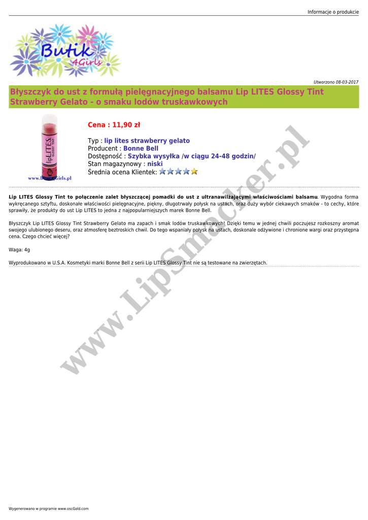 Informacje o produkcie Utworzono 08-03-2017 Błyszczyk do ust z formułą pielęgnacyjnego balsamu Lip LITES Glossy Tint Strawberry Gelato - o smaku lodów truskawkowych Cena : 11,90 zł ac ke r. pl Typ : lip lites strawberry gelato Producent : Bonne Bell Dostępność : Szybka wysyłka /w ciągu 24-48 godzin/ Stan magazynowy : niski Średnia ocena Klientek: Lip LITES Glossy Tint to połączenie zalet błyszczącej pomadki do ust z ultranawilżającymi właściwościami balsamu. Wygodna forma wykręcanego sztyftu, doskonałe właściwości pielęgnacyjne, piękny, długotrwały połysk na ustach, oraz duży wybór ciekawych smaków - to cechy, które sprawiły, że produkty do ust Lip LITES to jedna z najpopularniejszych marek Bonne Bell. Sm Błyszczyk Lip LITES Glossy Tint Strawberry Gelato ma zapach i smak lodów truskawkowych! Dzięki temu w jednej chwili poczujesz rozkoszny aromat swojego ulubionego deseru, oraz atmosferę beztroskich chwil. Do tego wspaniały połysk na ustach, doskonale odżywione i chronione wargi oraz przystępna cena. Czego chcieć więcej? Waga: 4g w w w .L ip Wyprodukowano w U.S.A. Kosmetyki marki Bonne Bell z serii Lip LITES Glossy Tint nie są testowane na zwierzętach. Wygenerowano w programie www.oscGold.com
