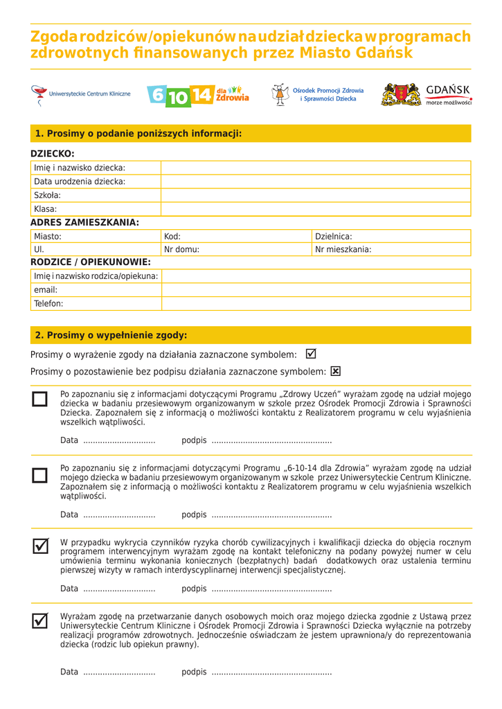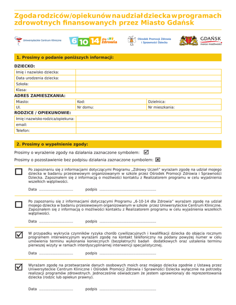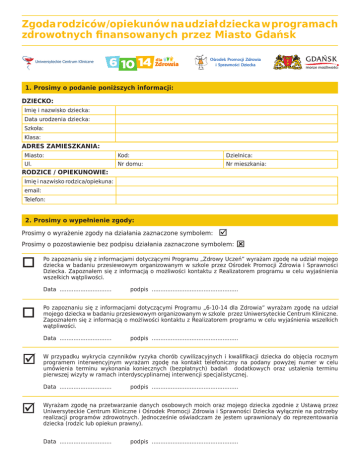 Zgoda rodziców/opiekunów na udział dziecka w programach zdrowotnych finansowanych przez Miasto Gdańsk 1. Prosimy o podanie poniższych informacji: DZIECKO: Imię i nazwisko dziecka: Data urodzenia dziecka: Szkoła: Klasa: ADRES ZAMIESZKANIA: Miasto: Kod: Dzielnica: Ul. Nr domu: Nr mieszkania: RODZICE / OPIEKUNOWIE: Imię i nazwisko rodzica/opiekuna: email: Telefon: 2. Prosimy o wypełnienie zgody: Prosimy o wyrażenie zgody na działania zaznaczone symbolem: Prosimy o pozostawienie bez podpisu działania zaznaczone symbolem: o Po zapoznaniu się z informacjami dotyczącymi Programu „Zdrowy Uczeń” wyrażam zgodę na udział mojego dziecka w badaniu przesiewowym organizowanym w szkole przez Ośrodek Promocji Zdrowia i Sprawności Dziecka. Zapoznałem się z informacją o możliwości kontaktu z Realizatorem programu w celu wyjaśnienia wszelkich wątpliwości. Data .............................. o podpis .................................................. W przypadku wykrycia czynników ryzyka chorób cywilizacyjnych i kwalifikacji dziecka do objęcia rocznym programem interwencyjnym wyrażam zgodę na kontakt telefoniczny na podany powyżej numer w celu umówienia terminu wykonania koniecznych (bezpłatnych) badań dodatkowych oraz ustalenia terminu pierwszej wizyty w ramach interdyscyplinarnej interwencji specjalistycznej. Data .............................. podpis .................................................. Po zapoznaniu się z informacjami dotyczącymi Programu „6-10-14 dla Zdrowia” wyrażam zgodę na udział mojego dziecka w badaniu przesiewowym organizowanym w szkole przez Uniwersyteckie Centrum Kliniczne. Zapoznałem się z informacją o możliwości kontaktu z Realizatorem programu w celu wyjaśnienia wszelkich wątpliwości. Data .............................. ý podpis .................................................. Wyrażam zgodę na przetwarzanie danych osobowych moich oraz mojego dziecka zgodnie z Ustawą przez Uniwersyteckie Centrum Kliniczne i Ośrodek Promocji Zdrowia i Sprawności Dziecka wyłącznie na potrzeby realizacji programów zdrowotnych. Jednocześnie oświadczam że jestem uprawniona/y do reprezentowania dziecka (rodzic lub opiekun prawny). Data .............................. podpis .................................................. 3. Prosimy o wypełnienie ankiety: właściwą odpowiedź zaznacz 1. 2. 3. 4. 5. 6. 7. 8. 9. 10. 11. 12. 13. 14. 15. 16. 17. 18. Jak ocenia Pan/Pani ogólny stan zdrowia dziecka? o Bardzo dobry o Dobry o Dość dobry o Zły o Trudno mi ocenić Czy dziecko choruje na choroby przewlekłe? oNIE oTAK Zaznacz jakie (może być kilka odpowiedzi) oChoroby ukł. oddechowego o Choroby ukł. krążenia o Choroby neurologiczne o Choroby ukł. pokarmowego o Choroby endokrynologiczne o Inne………..................................................... Czy dziecko pozostaje pod opieką lekarza specjalisty? oNIE oTAK Zaznacz jakiego (może być kilka odpowiedzi) o Alergologa o Pulmonologa o Endokrynologa o Kardiologa o Nefrologa o Gastrologa o Neurologa o Inny specjalista …………………................................... Z jakiego powodu …............................................………. Jak ocenia Pani/Pan masę ciała dziecka? oZnaczna niedowaga oNieznaczna niedowaga oWaga prawidłowa oNieznaczna nadwaga oZnaczna nadwaga Czy w Pani/Pana opinii dziecko prawidłowo się odżywia? oNIE oTAK oNIE WIEM Czy w Pani/Pana opinii dziecko ma wystarczająco dużo ruchu w ciągu dnia? oNIE oTAK oNIE WIEM Jak często dziecko je słodycze, słodkie przekąski? oKilka razy dziennie o Nie więcej niż raz dziennie rzadziej oNie jada słodyczy oNie wiem oKilka razy w tygodniu oRaz w tygodniu lub Jak często dziecko je śniadanie w ciągu tygodnia? oMin. 5 razy w tygodniu oMiędzy 3-5 razy w tygodniu oDziecko nie jada śniadań oNie wiem oMiędzy 1-3 razy w tygodniu Czy dziecko zazwyczaj dostaje do szkoły (min. 3dni w tygodniu) oGotowe drugie śniadanie oPieniądze na drugie śniadanie oDziecko nie jada w szkole drugiego śniadania oNie wiem Ile godzin dziennie dziecko spędza przed telewizorem i/lub komputerem? (średnio w ciągu tygodnia) oWięcej niż 3 godz. oMiędzy 1 a 3 godziny oMniej niż 1 godz. Jak często dziecko w ciągu tygodnia je żywność typu fast-food (np. hot dogi, hamburgery, frytki, kebab, pizza)? oMin. 5 razy w tygodniu oMiędzy 3-5 razy w tygodniu oMiędzy 1-3 razy w tygodniu oDziecko nie jada fast-foodów oNie wiem Ile godzin tygodniowo dziecko spędza na aktywnej zabawie, uprawianiu sportu (nie wliczając zajęć w-f)? oMin. 5 godzin tygodniowo oMiędzy 3 a 5 godzin oMiędzy 1 a 3 godziny oMniej niż 1 godz. tygodniowo Czy Państwa dziecko ma trudności z zaśnięciem? oNie, nigdy o Bardzo rzadko oTak, 1 x w miesiącu o3-4 razy w tygodniu owięcej niż 5 x w tygodniu oTak, 1-2 x w tygodniu Czy u członków najbliższej rodziny dziecka występuje nadwaga lub otyłość? oNIE oTAK Jeśli TAK proszę podać u kogo – oMatka o Ojciec o Rodzeństwo Czy u członków najbliższej rodziny dziecka wystąpiły choroby serca (zawał serca, choroby naczyń sercowych)? oNIE oTAK Jeśli TAK proszę podać u kogo – oMatka o Ojciec o Rodzeństwo Czy u członków najbliższej rodziny dziecka wystąpiły udary mózgu? oNIE oTAK Jeśli TAK proszę podać u kogo – oMatka o Ojciec o Rodzeństwo Czy u członków najbliższej rodziny dziecka występuje cukrzyca? oNIE oTAK Jeśli TAK proszę podać u kogo – oMatka o Ojciec o Rodzeństwo Czy u członków najbliższej rodziny dziecka wystąpiły zaburzenia lipidowe (tzw. podwyższony cholesterol)? oNIE oTAK Jeśli TAK proszę podać u kogo – oMatka o Ojciec o Rodzeństwo ý