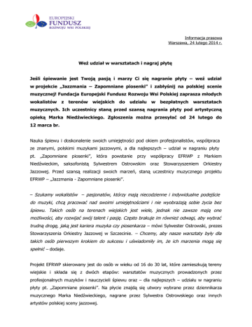 Informacja prasowa Warszawa, 24 lutego 2014 r. Weź udział w warsztatach i nagraj płytę Jeśli śpiewanie jest Twoją pasją i marzy Ci się nagranie płyty – weź udział w projekcie „Jazzmania – Zapomniane piosenki” i zabłyśnij na polskiej scenie muzycznej! Fundacja Europejski Fundusz Rozwoju Wsi Polskiej zaprasza młodych wokalistów z terenów wiejskich do udziału w bezpłatnych warsztatach muzycznych. Ich uczestnicy staną przed szansą nagrania płyty pod artystyczną opieką Marka Niedźwieckiego. Zgłoszenia można przesyłać od 24 lutego do 12 marca br. Nauka śpiewu i doskonalenie swoich umiejętności pod okiem profesjonalistów, współpraca ze znanymi, polskimi muzykami jazzowymi, a dla najlepszych – udział w nagraniu płyty pt. „Zapomniane piosenki”, która powstanie przy współpracy EFRWP z Markiem Niedźwieckim, saksofonistą Sylwestrem Ostrowskim oraz Stowarzyszeniem Orkiestry Jazzowej. Przed szansą realizacji swoich marzeń, staną uczestnicy muzycznego projektu EFRWP – „Jazzmania - Zapomniane piosenki”. – Szukamy wokalistów – pasjonatów, którzy mają niecodzienne i indywidualne podejście do muzyki, chcą pracować nad swoimi umiejętnościami i nie wyobrażają sobie życia bez śpiewu. Takich osób na terenach wiejskich jest wiele, jednak nie zawsze mają one możliwości, aby rozwijać swój talent i pasję. Często brakuje im również odwagi, aby wybrać trudną drogę, jaką jest kariera muzyka czy piosenkarza – mówi Sylwester Ostrowski, prezes Stowarzyszenia Orkiestry Jazzowej w Szczecinie. – Chcemy, aby nasze warsztaty były dla takich osób pierwszym krokiem do sukcesu i uświadomiły im, że ich marzenia mogą się spełnić – dodaje. Projekt EFRWP skierowany jest do osób w wieku od 16 do 30 lat, które zamieszkują tereny wiejskie i składa się z dwóch etapów: warsztatów muzycznych prowadzonych przez profesjonalnych muzyków i nauczycieli śpiewu oraz – dla najlepszych – udziału w nagraniu płyty pt. „Zapomniane piosenki”. Na płycie znajdą się utwory wybrane przez dziennikarza muzycznego Marka Niedźwieckiego, nagrane przez Sylwestra Ostrowskiego oraz innych artystów polskiej sceny jazzowej. Zgłoszenia do programu – wypełniony formularz zgłoszeniowy, dostępny na stronie www.efrwp.pl wraz z dwoma nagraniami w formacie MP3 – chętni mogą przesyłać drogą elektroniczną na adres [email protected] w terminie od 24 lutego do 12 marca br. Spośród nadesłanych zgłoszeń, komisja konkursowa wybierze 20 osób, które zostaną zaproszone do udziału w warsztatach. Więcej informacji o projekcie znajduje się na stronie: www.efrwp.pl O Jazzmanii: Projekt „Jazzmania” skierowany jest do osób z terenów wiejskich, uzdolnionych muzycznie i wokalnie, które są zainteresowane rozwijaniem swoich umiejętności oraz poszerzeniem swoich horyzontów z zakresu muzyki jazzowej i rozrywkowej. Program ma na celu edukację i popularyzację twórczości muzycznej, kształtowanie wrażliwości artystycznej i kulturalnej oraz stworzenie możliwości doskonalenia warsztatu instrumentalnego i wokalnego. W I edycji projektu pod nazwą „Jazzmania w Stodole” wzięło udział 18 osób, w wieku od 16 do 24 lat z czterech województw: podlaskiego, pomorskiego, warmińsko-mazurskiego oraz zachodniopomorskiego. Podczas warsztatów, które odbyły się w dniach 27-30 sierpnia 2013 r. w Kamionce/k. Nidzicy, uczestnicy zostali podzieleni na sześć grup tematycznych stosownie od swoich muzycznych zainteresowań: perkusja, gitara basowa/kontrabas, instrumenty klawiszowe, instrumenty dęte, gitara oraz wokal. Zajęcia poprowadzili znani przedstawiciele polskiego i światowego jazzu: Sylwester Ostrowski, Fraancesco Bruno, Joanna Knitter, Reggie Moore, Essiet Okon Essiet oraz Newman Taylor Baker. Więcej informacji o projekcie znajduje się na stronie: www.efrwp.pl O EFRWP: Fundacja Europejski Fundusz Rozwoju Wsi Polskiej jest organizacją pozarządową, działającą na rzecz rozwoju polskiej wsi. Od blisko 25 lat pomaga zmieniać jej wizerunek oraz aktywnie wspiera rozwój społeczno-gospodarczy lokalnych społeczności na terenach wiejskich. Działania EFRWP skupiają się przede wszystkim na wspieraniu inwestycji z zakresu infrastruktury technicznej i rozwoju lokalnych przedsiębiorstw oraz działaniach społecznych skierowanych do osób zamieszkujących obszary wiejskie. Od samego początku istnienia EFRWP aktywnie działa na rzecz edukacji oraz wyrównywania szans dzieci i młodzieży, zamieszkujących wsie i małe miasta. Więcej informacji na stronie: www.efrwp.pl Kontakt dla dziennikarzy: Justyna Iżycka, ITBC Communication Tel.: 22 250 49 20, 698 444 432 Email: justyna_izycka @itbc.pl Kontakt do EFRWP: Karolina Lupa, EFRWP Tel.: 22 639 87 63 Email: [email protected]