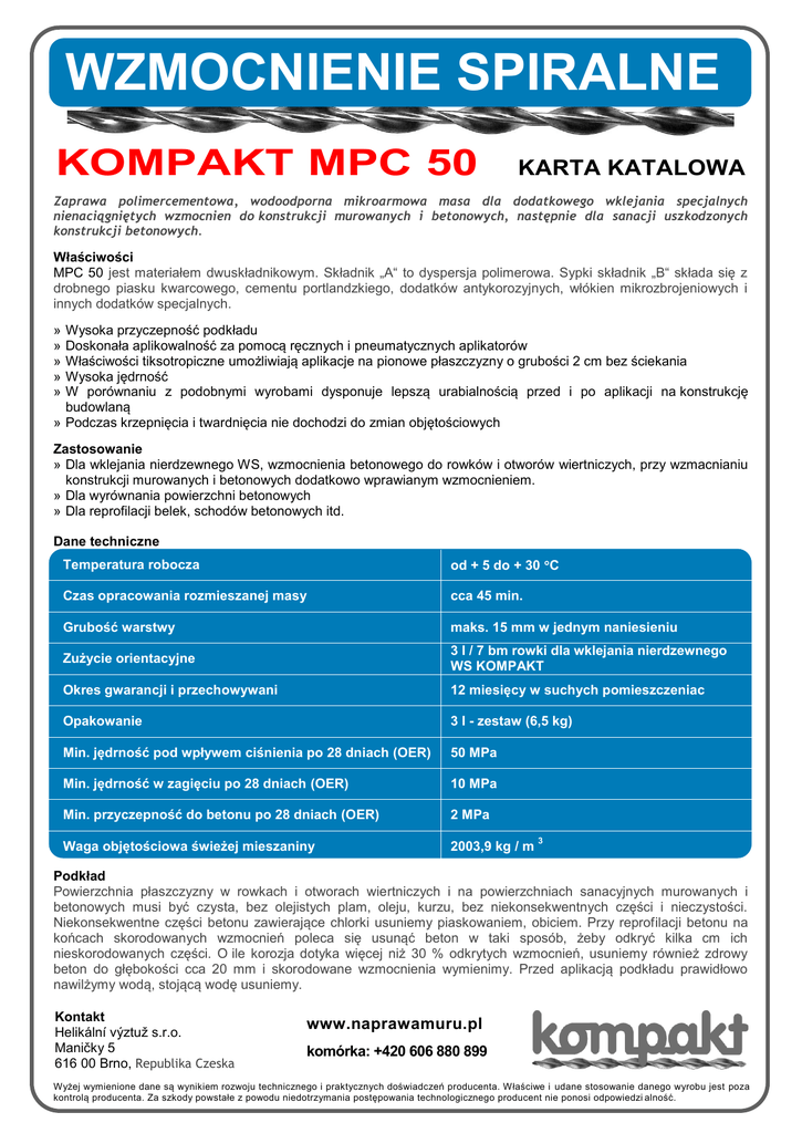 WZMOCNIENIE SPIRALNE KOMPAKT MPC 50 KARTA KATALOWA Zaprawa polimercementowa, wodoodporna mikroarmowa masa dla dodatkowego wklejania specjalnych nienaciągniętych wzmocnien do konstrukcji murowanych i betonowych, następnie dla sanacji uszkodzonych konstrukcji betonowych. Właściwości MPC 50 jest materiałem dwuskładnikowym. Składnik „A“ to dyspersja polimerowa. Sypki składnik „B“ składa się z drobnego piasku kwarcowego, cementu portlandzkiego, dodatków antykorozyjnych, włókien mikrozbrojeniowych i innych dodatków specjalnych. » » » » » Wysoka przyczepność podkładu Doskonała aplikowalność za pomocą ręcznych i pneumatycznych aplikatorów Właściwości tiksotropiczne umożliwiają aplikacje na pionowe płaszczyzny o grubości 2 cm bez ściekania Wysoka jędrność W porównaniu z podobnymi wyrobami dysponuje lepszą urabialnością przed i po aplikacji na konstrukcję budowlaną » Podczas krzepnięcia i twardnięcia nie dochodzi do zmian objętościowych Zastosowanie » Dla wklejania nierdzewnego WS, wzmocnienia betonowego do rowków i otworów wiertniczych, przy wzmacnianiu konstrukcji murowanych i betonowych dodatkowo wprawianym wzmocnieniem. » Dla wyrównania powierzchni betonowych » Dla reprofilacji belek, schodów betonowych itd. Dane techniczne Temperatura robocza od + 5 do + 30 C Czas opracowania rozmieszanej masy cca 45 min. Grubość warstwy maks. 15 mm w jednym naniesieniu Zużycie orientacyjne 3 l / 7 bm rowki dla wklejania nierdzewnego WS KOMPAKT Okres gwarancji i przechowywani 12 miesięcy w suchych pomieszczeniac Opakowanie 3 l - zestaw (6,5 kg) Min. jędrność pod wpływem ciśnienia po 28 dniach (OER) 50 MPa Min. jędrność w zagięciu po 28 dniach (OER) 10 MPa Min. przyczepność do betonu po 28 dniach (OER) 2 MPa Waga objętościowa świeżej mieszaniny 2003,9 kg / m 3 Podkład Powierzchnia płaszczyzny w rowkach i otworach wiertniczych i na powierzchniach sanacyjnych murowanych i betonowych musi być czysta, bez olejistych plam, oleju, kurzu, bez niekonsekwentnych części i nieczystości. Niekonsekwentne części betonu zawierające chlorki usuniemy piaskowaniem, obiciem. Przy reprofilacji betonu na końcach skorodowanych wzmocnień poleca się usunąć beton w taki sposób, żeby odkryć kilka cm ich nieskorodowanych części. O ile korozja dotyka więcej niż 30 % odkrytych wzmocnień, usuniemy również zdrowy beton do głębokości cca 20 mm i skorodowane wzmocnienia wymienimy. Przed aplikacją podkładu prawidłowo nawilżymy wodą, stojącą wodę usuniemy. Kontakt Helikální výztuž s.r.o. Maničky 5 616 00 Brno, Republika Czeska www.naprawamuru.pl komórka: +420 606 880 899 Wyżej wymienione dane są wynikiem rozwoju technicznego i praktycznych doświadczeń producenta. Właściwe i udane stosowanie danego wyrobu jest poza kontrolą producenta. Za szkody powstałe z powodu niedotrzymania postępowania technologicznego producent nie ponosi odpowiedzi alność. Mieszanie zaprawy Do 10 l pustego kubła wsypiemy całe opakowanie suchego składniku B, wlejemy całe opakowanie dyspersji A. Mieszamy przedłużką do mieszania na wiertarkę z minimalnymi obrotami aż do otrzymania homogenicznie twardej plastycznej konsystencji bez grudek. Konsystencję zaprawy można przed aplikacją poprawić dodaniem maks. 0,1 l wody. Jest zabronione dodawać do przygot. masy dalszy materiał lub wodę. Aplikacja zaprawy Przed aplikacją zaprawy MPC 50 prawidłowo przygotujemy podkład. Przy dodatkowym wzmocnieniu do rowku aplikujemy za pomocą pistoletu aplikacyjnego równomierną warstwę masy na tylną ścianę o grubości 20 mm. Przed włożeniem prętu mocującego za pomocą szpachli do fugowania doskonale wciśniemy masę do tylnej ściany i zapewnimy równomierność warstwy. Dalszą warstwę kryjącą aplikujemy przed zastygnięciem pierwszej warstwy. W przypadku że chodzi o warstwę ostatnią, wyrównamy ją za pomocą szpachli do fugowania zgodnie z następnymi poprawami. Przy aplikacji do otworu wiertniczego za pomocą przedłużki rurowej na pistolecie musi się przedłużka wolno ruszać w otworze wiertniczym już przed aplikacją na sucho. Potem przy wstrzykiwaniu do wypłukanego otworu wiertniczego jest zestaw aplikacyjny spontanicznie powoli wyciskany z otworu wiertniczego ciśnieniem wstrzykiwanej masy. Dla poprawienia mniejszych uszkodzeń betonu rozmieszanym zaprawę do średnio plastycznej konsystencji, żeby można ją aplikować za pomocą kielni. Podczas sanacji większych uszkodzeń do głębokości 5 cm aplikujemy MPC 50 w grubszych warstwach. Pierwszą warstwę MPC 50 twardej plastycznej konsystencji aplikujemy zaklepywaniem. Każdą dalszą warstwę aplikujemy jeszcze przed zastygnięciem pierwszej warstwy. Przechowywanie Nieotworzone opakowanie MPC 50 przechowywujemy aż 12 miesięcy w suchych i ogrzewanych pomieszczeniach. Należy zużyć najpóźniej do daty wskazanej na opakowaniu. Bezpieczeństwo i ochrona zdrowia MPC 50 nie jest składnikiem szkodliwym wg Ustawy chemicznej. Zawiera jednak cement zmieszany z wodą, więc drażni oczy, skórę i błonę śluzową. Kontakt Helikální výztuž s.r.o. Maničky 5 616 00 Brno, Republika Czeska www.naprawamuru.pl komórka: +420 606 880 899 Wyżej wymienione dane są wynikiem rozwoju technicznego i praktycznych doświadczeń producenta. Właściwe i udane stosowanie danego wyrobu jest poza kontrolą producenta. Za szkody powstałe z powodu niedotrzymania postępowania technologicznego p roducent nie ponosi odpowiedzialność.