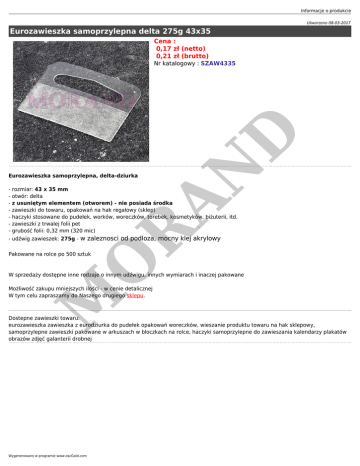 Informacje o produkcie Utworzono 08-03-2017 Eurozawieszka samoprzylepna delta 275g 43x35 Cena : 0,17 zł (netto) 0,21 zł (brutto) Eurozawieszka samoprzylepna, delta-dziurka AN D Nr katalogowy : SZAW4335 - udźwig zawieszek: 275g - w R - rozmiar: 43 x 35 mm - otwór: delta - z usuniętym elementem (otworem) - nie posiada środka - zawieszki do towaru, opakowań na hak regałowy (sklep) - haczyki stosowane do pudełek, worków, woreczków, torebek, kosmetyków, biżuterii, itd. - zawieszki z trwalej folii pet - grubość folii: 0,32 mm (320 mic) zaleznosci od podloza, mocny klej akrylowy O Pakowane na rolce po 500 sztuk W sprzedaży dostępne inne rodzaje o innym udźwigu, innych wymiarach i inaczej pakowane M Możliwość zakupu mniejszych ilości - w cenie detalicznej W tym celu zapraszamy do Naszego drugiego sklepu. Dostepne zawieszki towaru: eurozawieszka zawieszka z eurodziurka do pudełek opakowań woreczków, wieszanie produktu towaru na hak sklepowy, samoprzylepne zawieszki pakowane w arkuszach w bloczkach na rolce, haczyki samoprzylepne do zawieszania kalendarzy plakatów obrazów zdjęć galanterii drobnej Wygenerowano w programie www.oscGold.com