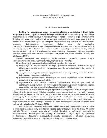 DYSFUNKCJONALNOŚĆ RODZIN A ZABURZENIA W ZACHOWANIU DZIECI Rodzina – znaczenie pojęcia Rodzina to podstawowa grupa pierwotna złożona z małżeństwa i dzieci (także adoptowanych) oraz ogółu krewnych każdego z małżonków. Istotą rodziny są dwa rodzaje więzi: małżeńska i rodzicielska, a w niektórych typach rodzin — również więź powinowactwa. Rodzina jest pierwszym i najbardziej naturalnym środowiskiem wychowawczym, z którym dziecko styka się w swym życiu. Tu nawiązuje pierwsze kontakty z innymi ludźmi i zdobywa pierwsze doświadczenia społeczne, które stają się podwaliną i zaczątkiem rozwoju społecznego małego człowieka, rzutując nieraz w decydujący sposób na całe jego życie. W rodzinie tworzone są warunki do zaspakajania potrzeb miłości, afiliacji, bezpieczeństwa, afirmacji i wielowymiarowego kontaktu, życiowego sukcesu, potrzeby rozwoju i twórczości, odnalezienia sensu życia. Dotyczy to wszystkich członków rodziny. (W. Majkowski, 1999). Rodzina występuje we wszystkich społeczeństwach i epokach, spełnia w życiu społeczeństwa kilka podstawowych funkcji, najważniejsze z nich to: 1) prokreacja, tj. zapewnienie ciągłości biologicznej społeczeństwa; 2) socjalizacja, tj. wprowadzenie młodego pokolenia w normy i mechanizm życia zbiorowego, opieka nad nim i przygotowanie do samodzielnego odgrywania ról społecznych; 3) utrzymywanie ciągłości kulturowej społeczeństwa przez przekazywanie dziedzictwa kulturowego następnym pokoleniom; 4) prowadzenie gospodarstwa domowego i w wielu wypadkach także działalność produkcyjna (zwłaszcza w rolnictwie); 5) organizowanie życia swoich członków, sprawowanie kontroli społ. nad ich zachowaniem, zapewnienie im równowagi emocjonalnej, pomocy wzajemnej i opieki w wypadku choroby, starości itp. (Encyklopedia PWN, 2004). We współczesnej literaturze rodzina jest ujmowana jako system, całość, która jest czymś więcej niż tylko sumą części. Mówiąc o rodzinie jako systemie społecznym, myślimy przede wszystkim o procesach w nim zachodzących: komunikowaniu się, działaniu i współdziałaniu poszczególnych elementów, a nie o jego cechach strukturalnych. Rodzina w ujęciu systemowym, to grupa współzależnych od siebie jednostek, których łączy poczucie historii, więzi emocjonalne oraz strategie działania w celu zaspokojenia potrzeb zarówno całej rodziny jak i jej członków.(G. Lowe, 2000) Współzależność między prawidłowym pełnieniem jednej nawet funkcji przez rodzinę, a wydolnością całej rodziny jest faktem często potwierdzonym przez badania. W każdej rodzinie "jakość i poziom wypełnianych funkcji decyduje o końcowych skutkach jej funkcjonowania, wyrażających się choćby w poziomie i "stylu" życia jej członków, w konfiguracji stosunków międzypokoleniowych, aspiracjach i planach życiowych, uznawanych systemach wartości i ogólnej, filozofii życia".(S. Kawula, 1988) Rodzina patologiczna a rodzina dysfunkcjonalna Irena Budrewicz stwierdza, że używany często w polskim piśmiennictwie socjologicznym i pedagogicznym termin "patologia rodziny" nie ma jednoznacznej definicji, a jego rozumienie ma różne odcienie. Wielu autorów używa obok "patologii" określeń: "dewiacja", "zjawiska patogenne", "symptomy patologii życia rodzinnego".( Budrewicz, 1992) Maria Łopatkowa określa rodzinę patologiczną jako taką, w której oboje lub jedno z rodziców jest alkoholikiem, niepoprawnym przestępcą lub trudni się nierządem. Inne przypadki rodzin autorka zalicza do kategorii rodzin zagrożonych, wychodząc z założenia, że patologia to już nie zagrożenie chorobą, lecz sama choroba.(M. Łopatkowa, 1976). Dziś powszechnie zalicza się do rodzin patologicznych te, w których oboje rodzice lub jedno z nich alkoholizuje się, używa narkotyków, dopuszcza się nierządu - najczęściej we własnym domu w obecności dzieci, wykorzystuje je seksualnie.(J. Śledzianowski, 1991) Natomiast o rodzinie dysfunkcjonalnej można mówić już wtedy, gdy nie występuje jeszcze w niej głęboka patologia, jednak jej prawidłowe funkcjonowanie zostało w miarę trwale zaburzone. Dysfunkcjonalna rodzina to taka, która nie spełnia już swoich naturalnych funkcji. Członkowie takich rodzin funkcjonują na niższym poziomie niż mogliby. Dotyczy to zwłaszcza dzieci Rodzina dysfunkcjonalna jest stworzona przez dysfunkcjonalne małżeństwo, takie małżeństwa zaś tworzą dysfunkcjonalne osoby, które odnajdują się wzajemnie i żenią ze sobą. Jednym z tragicznych faktów jest to, że osoby dysfunkcjonalne prawie zawsze znajdują inną osobę, która działa albo na tym samym, albo na większym poziomie dysfunkcji. (J. Bradshaw, 1998) Każda rodzina przeżywa kłopoty i problemy w komunikowaniu się wzajemnym. Bywa tak, że jeden z jej członków dla zapewnienia równowagi odgrywa czyjąś rolę. Tam jednak, gdzie relacje zostają usztywnione, a role pozostają stałe, nic nie funkcjonuje prawidłowo. Rodziny dysfunkcjonalne zazwyczaj są "zakorzenione we wstydzie" (dzieci często wstydzą się swojej rodziny). Do typowych objawów charakteryzujących te rodziny należą: • Brak w nich intymności. • Ich członkowie mają utrwalone, zamrożone, sztywne role. • Można zaobserwować zaplątane granice pomiędzy członkami rodziny. Czują się tak, jak czują się inne osoby w rodzinie. • Ich członkowie nie mogą zaspokoić swoich indywidualnych potrzeb. Są one odkładane, aby umożliwić zaspokojenie potrzeby systemu. Dlatego w takiej rodzinie prawie zawsze istnieje jakiś niewielki poziom złości i depresji. • System komunikacji w tych rodzinach polega na otwartym konflikcie, albo na zgodzie na to, żeby nie było niezgody. Rzadko dochodzi tam do prawdziwego kontaktu. • Indywidualne różnice są poświęcane dla potrzeb systemu. Jednostka istnieje dla rodziny. Taka rodzinę trudno jest opuścić. • Zasady są sztywne i nie zmieniają
