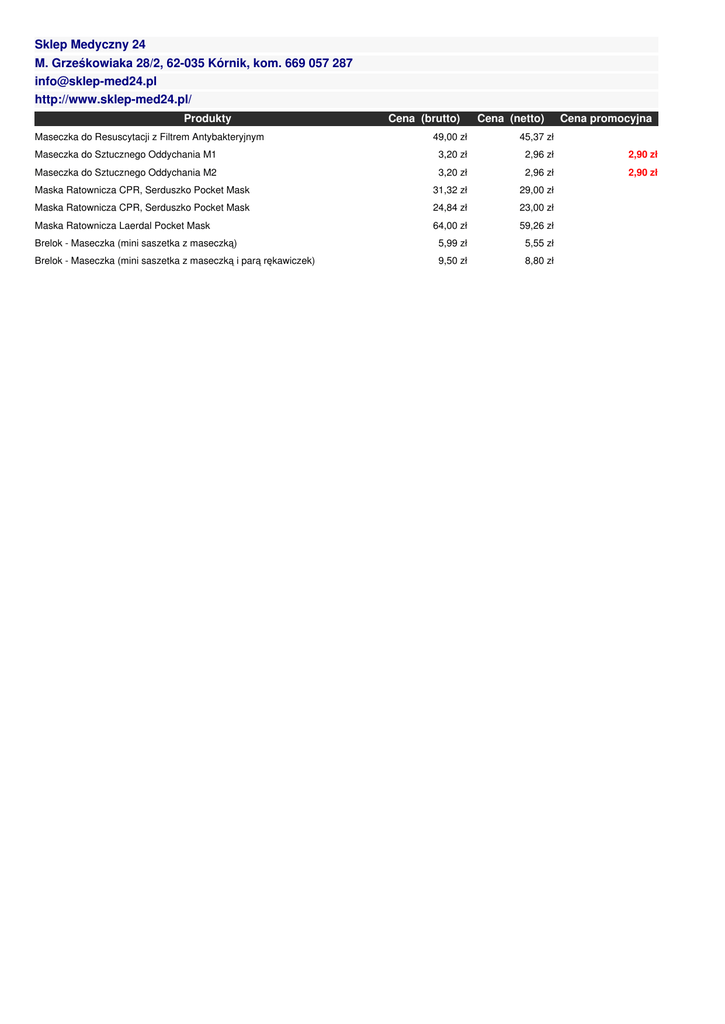 Sklep Medyczny 24 M. Grześkowiaka 28/2, 62-035 Kórnik, kom. 669 057 287 [email protected] http://www.sklep-med24.pl/ Produkty Maseczka do Resuscytacji z Filtrem Antybakteryjnym Maseczka do Sztucznego Oddychania M1 Maseczka do Sztucznego Oddychania M2 Cena (brutto) Cena (netto) Cena promocyjna 49,00 zł 45,37 zł 3,20 zł 2,96 zł 2,90 zł 2,90 zł 3,20 zł 2,96 zł Maska Ratownicza CPR, Serduszko Pocket Mask 31,32 zł 29,00 zł Maska Ratownicza CPR, Serduszko Pocket Mask 24,84 zł 23,00 zł Maska Ratownicza Laerdal Pocket Mask 64,00 zł 59,26 zł Brelok - Maseczka (mini saszetka z maseczką) 5,99 zł 5,55 zł Brelok - Maseczka (mini saszetka z maseczką i parą rękawiczek) 9,50 zł 8,80 zł