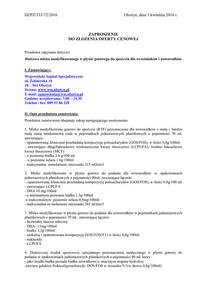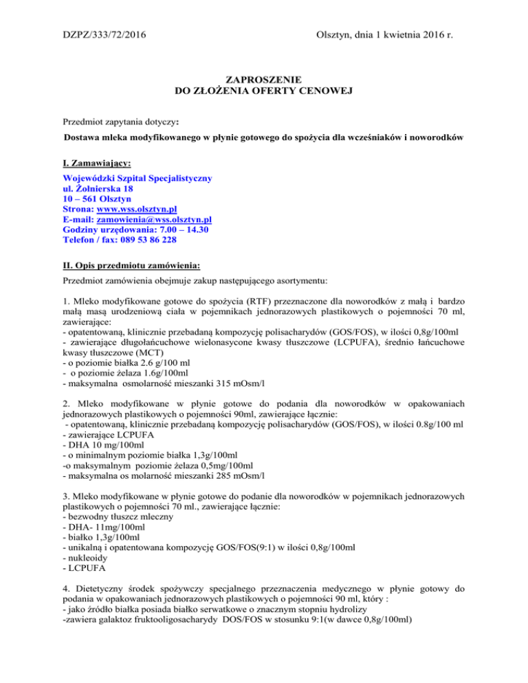 DZPZ/333/72/2016 Olsztyn, dnia 1 kwietnia 2016 r. ZAPROSZENIE DO ZŁOŻENIA OFERTY CENOWEJ Przedmiot zapytania dotyczy: Dostawa mleka modyfikowanego w płynie gotowego do spożycia dla wcześniaków i noworodków I. Zamawiający: Wojewódzki Szpital Specjalistyczny ul. Żołnierska 18 10 – 561 Olsztyn Strona: www.wss.olsztyn.pl E-mail: [email protected] Godziny urzędowania: 7.00 – 14.30 Telefon / fax: 089 53 86 228 II. Opis przedmiotu zamówienia: Przedmiot zamówienia obejmuje zakup następującego asortymentu: 1. Mleko modyfikowane gotowe do spożycia (RTF) przeznaczone dla noworodków z małą i bardzo małą masą urodzeniową ciała w pojemnikach jednorazowych plastikowych o pojemności 70 ml, zawierające: - opatentowaną, klinicznie przebadaną kompozycję polisacharydów (GOS/FOS), w ilości 0,8g/100ml - zawierające długołańcuchowe wielonasycone kwasy tłuszczowe (LCPUFA), średnio łańcuchowe kwasy tłuszczowe (MCT) - o poziomie białka 2.6 g/100 ml - o poziomie żelaza 1.6g/100ml - maksymalna osmolarność mieszanki 315 mOsm/l 2. Mleko modyfikowane w płynie gotowe do podania dla noworodków w opakowaniach jednorazowych plastikowych o pojemności 90ml, zawierające łącznie: - opatentowaną, klinicznie przebadaną kompozycję polisacharydów (GOS/FOS), w ilości 0.8g/100 ml - zawierające LCPUFA - DHA 10 mg/100ml - o minimalnym poziomie białka 1,3g/100ml -o maksymalnym poziomie żelaza 0,5mg/100ml - maksymalna os molarność mieszanki 285 mOsm/l 3. Mleko modyfikowane w płynie gotowe do podanie dla noworodków w pojemnikach jednorazowych plastikowych o pojemności 70 ml., zawierające łącznie: - bezwodny tłuszcz mleczny - DHA- 11mg/100ml - białko 1,3g/100ml - unikalną i opatentowana kompozycję GOS/FOS(9:1) w ilości 0,8g/100ml - nukleoidy - LCPUFA 4. Dietetyczny środek spożywczy specjalnego przeznaczenia medycznego w płynie gotowy do podania w opakowaniach jednorazowych plastikowych o pojemności 90 ml, który : - jako źródło białka posiada białko serwatkowe o znacznym stopniu hydrolizy -zawiera galaktoz fruktooligosacharydy DOS/FOS w stosunku 9:1(w dawce 0,8g/100ml) - zawiera LCPUFA - zawiera nukleotydy - zwiera żelazo w ilości 0,53mg/100ml -posiada osmolarność 265 mOsm/l 5. Mleko modyfikowane przeciw ulewaniem – dietetyczny środek spożywczy specjalnego przeznaczenia dla noworodków w przypadku ulewań, a nie jest karmiony piersią, w proszku, w puszkach, zawierający: - dodatek długołańcuchowych wielonasyconych kwasów tłuszczowych LCPUFA, neklotydy - zagęstnik 6. Mleko modyfikowane – dietetyczny środek spożywczy specjalnego przeznaczenia dla noworodków przypadku alergii pokarmowych (alergia na białko mleka krowiego) oraz do stosowania w zespołach złego wchłaniania, w proszku, w puszkach - nie zawiera w swym składzie galaktozy, laktozy, sacharozy - nie zawiera żadnych białek pełnocząsteczkowych, ani też peptydów, tylko i wyłącznie wolne aminokwasy, których równoważnik białkowy wynosi 13,9 g/100 g proszku (2,8 g/100 kcal). Wykonawcy składający oferty winni przedstawić i przygotowywania preparatów RTF do spożycia. procedury przechowywania III. Kryterium oceny ofert Cena - 100% IV. Termin wykonania zamówienia: - sukcesywnie przez 12 miesięcy od dnia podpisania umowy V. Informacje o oświadczeniach i dokumentach, jakie mają dostarczyć wykonawcy: 1. Aktualny odpis z właściwego rejestru albo aktualne zaświadczenie o wpisie do ewidencji działalności gospodarczej, jeżeli odrębne przepisy wymagają wpisu do rejestru lub zgłoszenia do ewidencji działalności gospodarczej, wystawionego nie wcześniej niż 6 miesięcy przed upływem terminu składania ofert. 2. Oświadczenie, iż Wykonawca posiada niezbędne dokumenty dopuszczające oferowany asortyment do obrotu i używania na terenie RP zgodnie z ustawą o bezpieczeństwie żywności i żywienia z dnia 25 sierpnia 2006 r. (Dz. U. z 2006r. Nr 171 poz.1225 z poź. zm.), które przedłoży Zamawiającemu na każde wezwanie 3. Oświadczenie, iż oferowany przedmiot zmówienia spełnia wymogi określone w Rozporządzeniu Ministra Zdrowia z dnia 16 września 2010 r. (Dz. U. z 2010r. Nr 180 poz.1214 z póź. zm.) w sprawie środków spożywczych specjalnego przeznaczenia żywieniowego. 4. Wykonawcy składający oferty winni przedstawić procedury przechowywania i przygotowywania preparatów RTF do spożycia. 5. Sporządzony przez wykonawcę według wzoru stanowiącego załącznik nr 1 do zaproszenia, formularz ofertowy. 6. Sporządzony przez wykonawcę według wzoru stanowiącego załącznik nr 2 do zaproszenia, formularz cenowy. VI. Załączniki: 1. Załącznik nr 1 – formularz ofertowy 2. Załącznik nr 2 – formularz cenowy 3. Załącznik nr 3 – projekt umowy VII. Informacje dodatkowe: Zamawiający w ramach prowadzonego postępowania zastrzega możliwość przeprowadzenia negocjacji w zakresie ceny. Zamawiający zastrzega możliwość unieważnienia prowadzonego postępowania bez podania przyczyny. VIII. Osoby uprawnione do porozumiewania się z wykonawcami: Osobą upoważnioną ze strony Zamawiającego do kontaktowania się z wykonawcami jest: Stanisława Masłowska – Kierownik Działu Zamówień Publicznych i Zaopatrzenia, tel. 0 89 53 86 228. Ofertę cenową należy złożyć do dnia 8 kwietnia 2016 r. na adres: Wojewódzki Szpital Specjalistyczny Dział Zamówień Publicznych i Zaopatrzenia ul. Żołnierska 16 B, pok. 2 / 9 10 – 561 Olsztyn lub skan oryginału dokumentów wysłać na adres e-mail: [email protected]. DYREKTOR WSS W OLSZTYNIE Irena Kierzkowska (Podpis osoby uprawnionej)