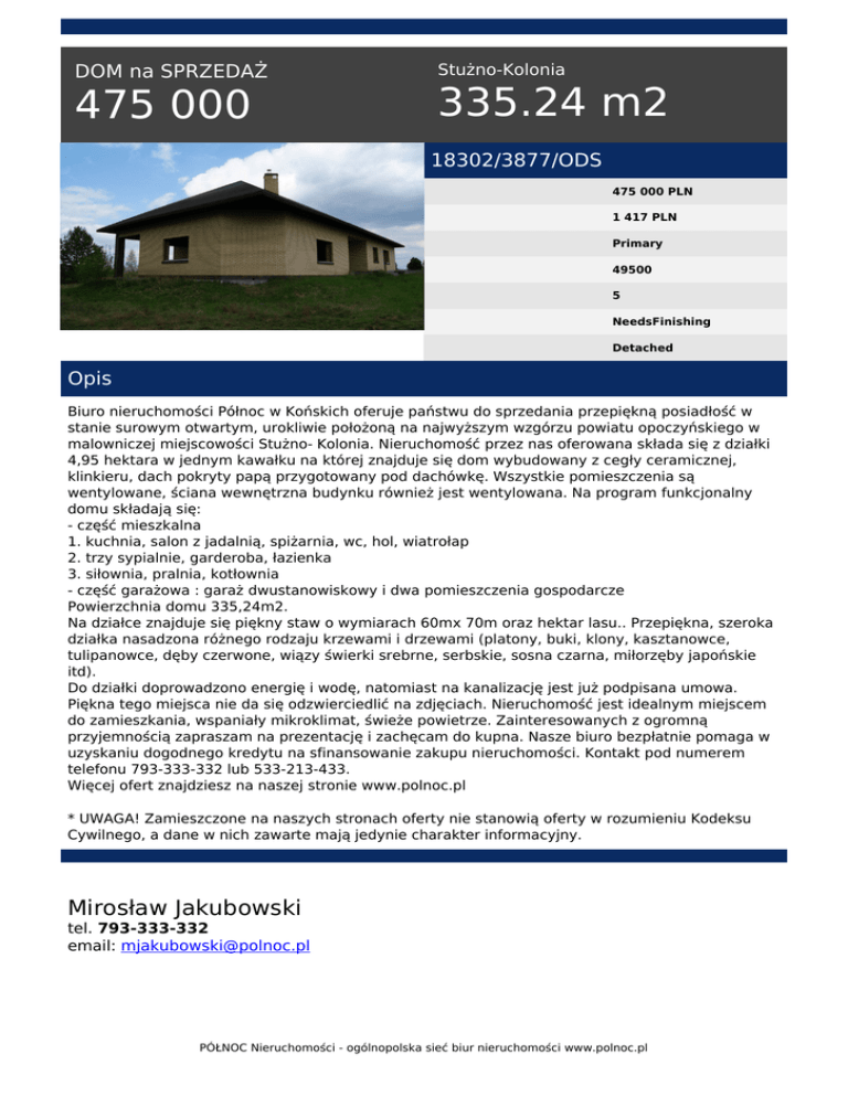 DOM na SPRZEDAŻ 475 000 Stużno-Kolonia 335.24 m2 18302/3877/ODS 475 000 PLN 1 417 PLN Primary 49500 5 NeedsFinishing Detached Opis Biuro nieruchomości Północ w Końskich oferuje państwu do sprzedania przepiękną posiadłość w stanie surowym otwartym, urokliwie położoną na najwyższym wzgórzu powiatu opoczyńskiego w malowniczej miejscowości Stużno- Kolonia. Nieruchomość przez nas oferowana składa się z działki 4,95 hektara w jednym kawałku na której znajduje się dom wybudowany z cegły ceramicznej, klinkieru, dach pokryty papą przygotowany pod dachówkę. Wszystkie pomieszczenia są wentylowane, ściana wewnętrzna budynku również jest wentylowana. Na program funkcjonalny domu składają się: - część mieszkalna 1. kuchnia, salon z jadalnią, spiżarnia, wc, hol, wiatrołap 2. trzy sypialnie, garderoba, łazienka 3. siłownia, pralnia, kotłownia - część garażowa : garaż dwustanowiskowy i dwa pomieszczenia gospodarcze Powierzchnia domu 335,24m2. Na działce znajduje się piękny staw o wymiarach 60mx 70m oraz hektar lasu.. Przepiękna, szeroka działka nasadzona różnego rodzaju krzewami i drzewami (platony, buki, klony, kasztanowce, tulipanowce, dęby czerwone, wiązy świerki srebrne, serbskie, sosna czarna, miłorzęby japońskie itd). Do działki doprowadzono energię i wodę, natomiast na kanalizację jest już podpisana umowa. Piękna tego miejsca nie da się odzwierciedlić na zdjęciach. Nieruchomość jest idealnym miejscem do zamieszkania, wspaniały mikroklimat, świeże powietrze. Zainteresowanych z ogromną przyjemnością zapraszam na prezentację i zachęcam do kupna. Nasze biuro bezpłatnie pomaga w uzyskaniu dogodnego kredytu na sfinansowanie zakupu nieruchomości. Kontakt pod numerem telefonu 793-333-332 lub 533-213-433. Więcej ofert znajdziesz na naszej stronie www.polnoc.pl * UWAGA! Zamieszczone na naszych stronach oferty nie stanowią oferty w rozumieniu Kodeksu Cywilnego, a dane w nich zawarte mają jedynie charakter informacyjny. Mirosław Jakubowski tel. 793-333-332 email: [email protected] PÓŁNOC Nieruchomości - ogólnopolska sieć biur nieruchomości www.polnoc.pl Powered by TCPDF (www.tcpdf.org)