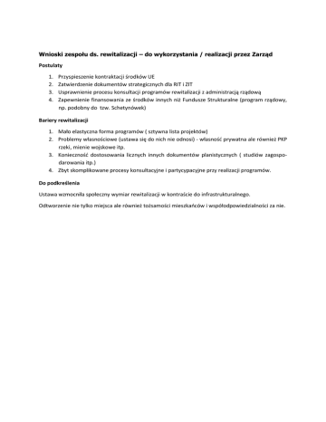Wnioski zespołu ds. rewitalizacji – do wykorzystania / realizacji przez Zarząd Postulaty 1. 2. 3. 4. Przyspieszenie kontraktacji środków UE Zatwierdzenie dokumentów strategicznych dla RIT i ZIT Usprawnienie procesu konsultacji programów rewitalizacji z administracją rządową Zapewnienie finansowania ze środków innych niż Fundusze Strukturalne (program rządowy, np. podobny do tzw. Schetynówek) Bariery rewitalizacji 1. Mało elastyczna forma programów ( sztywna lista projektów) 2. Problemy własnościowe (ustawa się do nich nie odnosi) - własność prywatna ale również PKP rzeki, mienie wojskowe itp. 3. Konieczność dostosowania licznych innych dokumentów planistycznych ( studiów zagospodarowania itp.) 4. Zbyt skomplikowane procesy konsultacyjne i partycypacyjne przy realizacji programów. Do podkreślenia Ustawa wzmocniła społeczny wymiar rewitalizacji w kontraście do infrastrukturalnego. Odtworzenie nie tylko miejsca ale również tożsamości mieszkańców i współodpowiedzialności za nie.