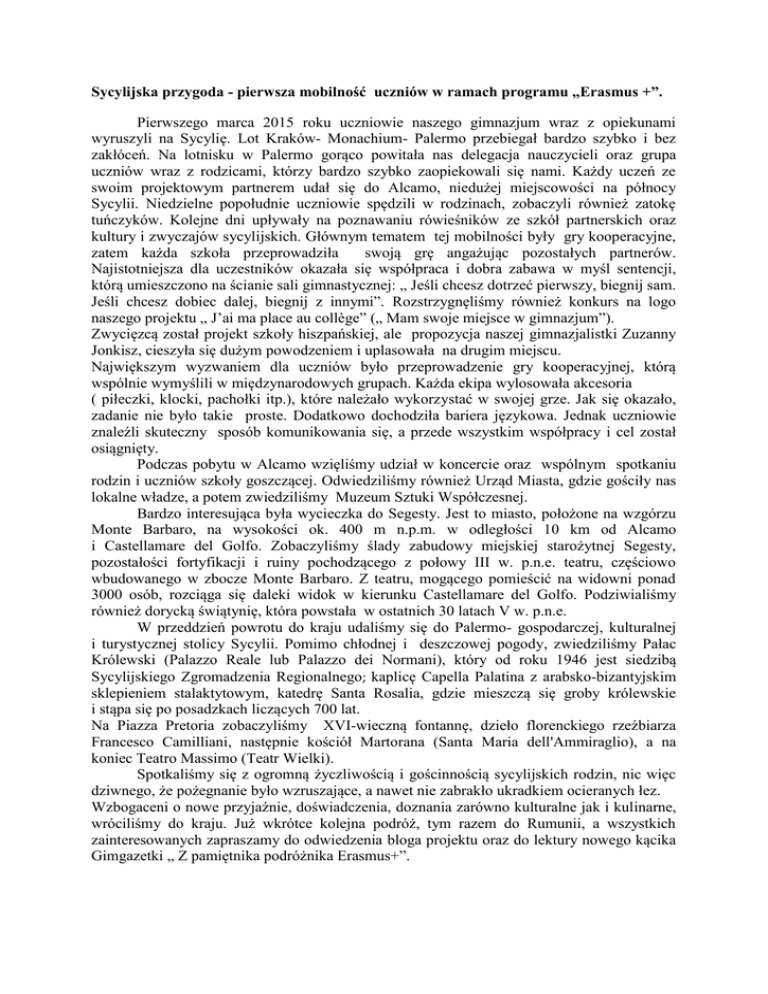 Sycylijska przygoda - pierwsza mobilność uczniów w ramach programu „Erasmus +”. Pierwszego marca 2015 roku uczniowie naszego gimnazjum wraz z opiekunami wyruszyli na Sycylię. Lot Kraków- Monachium- Palermo przebiegał bardzo szybko i bez zakłóceń. Na lotnisku w Palermo gorąco powitała nas delegacja nauczycieli oraz grupa uczniów wraz z rodzicami, którzy bardzo szybko zaopiekowali się nami. Każdy uczeń ze swoim projektowym partnerem udał się do Alcamo, niedużej miejscowości na północy Sycylii. Niedzielne popołudnie uczniowie spędzili w rodzinach, zobaczyli również zatokę tuńczyków. Kolejne dni upływały na poznawaniu rówieśników ze szkół partnerskich oraz kultury i zwyczajów sycylijskich. Głównym tematem tej mobilności były gry kooperacyjne, zatem każda szkoła przeprowadziła swoją grę angażując pozostałych partnerów. Najistotniejsza dla uczestników okazała się współpraca i dobra zabawa w myśl sentencji, którą umieszczono na ścianie sali gimnastycznej: „ Jeśli chcesz dotrzeć pierwszy, biegnij sam. Jeśli chcesz dobiec dalej, biegnij z innymi”. Rozstrzygnęliśmy również konkurs na logo naszego projektu „ J’ai ma place au collège” („ Mam swoje miejsce w gimnazjum”). Zwycięzcą został projekt szkoły hiszpańskiej, ale propozycja naszej gimnazjalistki Zuzanny Jonkisz, cieszyła się dużym powodzeniem i uplasowała na drugim miejscu. Największym wyzwaniem dla uczniów było przeprowadzenie gry kooperacyjnej, którą wspólnie wymyślili w międzynarodowych grupach. Każda ekipa wylosowała akcesoria ( piłeczki, klocki, pachołki itp.), które należało wykorzystać w swojej grze. Jak się okazało, zadanie nie było takie proste. Dodatkowo dochodziła bariera językowa. Jednak uczniowie znaleźli skuteczny sposób komunikowania się, a przede wszystkim współpracy i cel został osiągnięty. Podczas pobytu w Alcamo wzięliśmy udział w koncercie oraz wspólnym spotkaniu rodzin i uczniów szkoły goszczącej. Odwiedziliśmy również Urząd Miasta, gdzie gościły nas lokalne władze, a potem zwiedziliśmy Muzeum Sztuki Współczesnej. Bardzo interesująca była wycieczka do Segesty. Jest to miasto, położone na wzgórzu Monte Barbaro, na wysokości ok. 400 m n.p.m. w odległości 10 km od Alcamo i Castellamare del Golfo. Zobaczyliśmy ślady zabudowy miejskiej starożytnej Segesty, pozostałości fortyfikacji i ruiny pochodzącego z połowy III w. p.n.e. teatru, częściowo wbudowanego w zbocze Monte Barbaro. Z teatru, mogącego pomieścić na widowni ponad 3000 osób, rozciąga się daleki widok w kierunku Castellamare del Golfo. Podziwialiśmy również dorycką świątynię, która powstała w ostatnich 30 latach V w. p.n.e. W przeddzień powrotu do kraju udaliśmy się do Palermo- gospodarczej, kulturalnej i turystycznej stolicy Sycylii. Pomimo chłodnej i deszczowej pogody, zwiedziliśmy Pałac Królewski (Palazzo Reale lub Palazzo dei Normani), który od roku 1946 jest siedzibą Sycylijskiego Zgromadzenia Regionalnego; kaplicę Capella Palatina z arabsko-bizantyjskim sklepieniem stalaktytowym, katedrę Santa Rosalia, gdzie mieszczą się groby królewskie i stąpa się po posadzkach liczących 700 lat. Na Piazza Pretoria zobaczyliśmy XVI-wieczną fontannę, dzieło florenckiego rzeźbiarza Francesco Camilliani, następnie kościół Martorana (Santa Maria dell'Ammiraglio), a na koniec Teatro Massimo (Teatr Wielki). Spotkaliśmy się z ogromną życzliwością i gościnnością sycylijskich rodzin, nic więc dziwnego, że pożegnanie było wzruszające, a nawet nie zabrakło ukradkiem ocieranych łez. Wzbogaceni o nowe przyjaźnie, doświadczenia, doznania zarówno kulturalne jak i kulinarne, wróciliśmy do kraju. Już wkrótce kolejna podróż, tym razem do Rumunii, a wszystkich zainteresowanych zapraszamy do odwiedzenia bloga projektu oraz do lektury nowego kącika Gimgazetki „ Z pamiętnika podróżnika Erasmus+”.