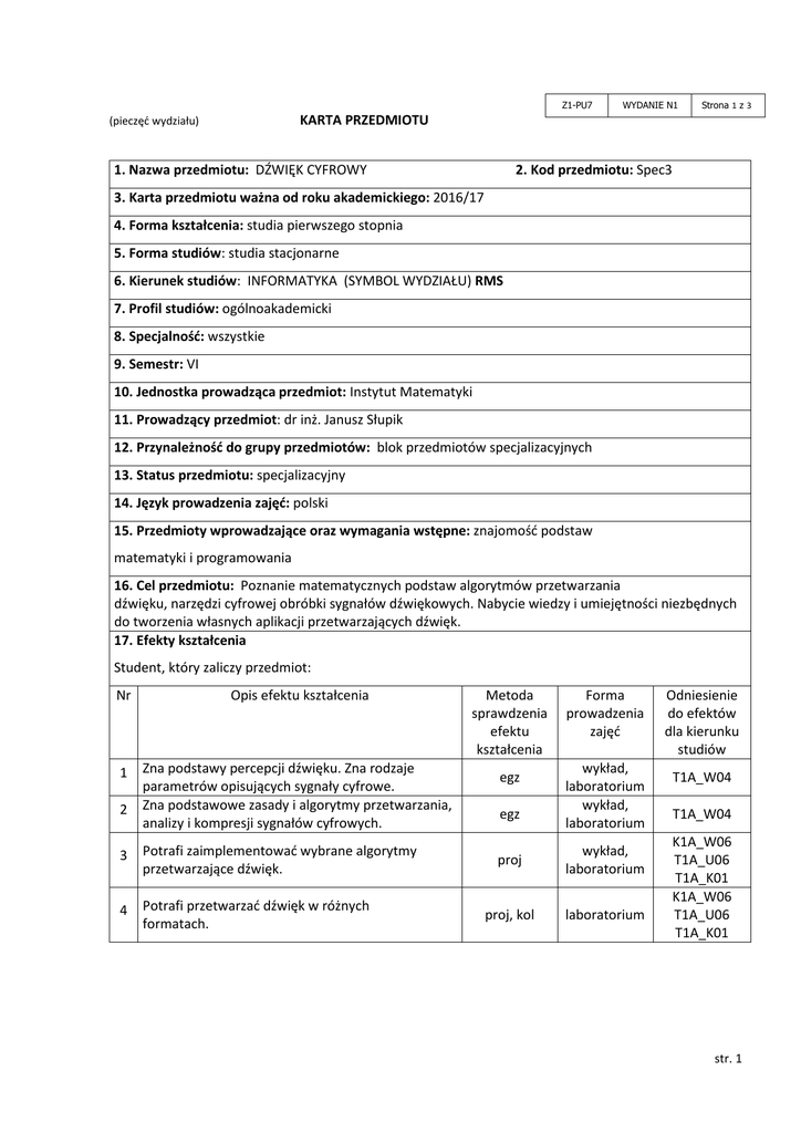 Z1-PU7 WYDANIE N1 Strona 1 z 3 KARTA PRZEDMIOTU (pieczęć wydziału) 1. Nazwa przedmiotu: DŹWIĘK CYFROWY 2. Kod przedmiotu: Spec3 3. Karta przedmiotu ważna od roku akademickiego: 2016/17 4. Forma kształcenia: studia pierwszego stopnia 5. Forma studiów: studia stacjonarne 6. Kierunek studiów: INFORMATYKA (SYMBOL WYDZIAŁU) RMS 7. Profil studiów: ogólnoakademicki 8. Specjalność: wszystkie 9. Semestr: VI 10. Jednostka prowadząca przedmiot: Instytut Matematyki 11. Prowadzący przedmiot: dr inż. Janusz Słupik 12. Przynależność do grupy przedmiotów: blok przedmiotów specjalizacyjnych 13. Status przedmiotu: specjalizacyjny 14. Język prowadzenia zajęć: polski 15. Przedmioty wprowadzające oraz wymagania wstępne: znajomość podstaw matematyki i programowania 16. Cel przedmiotu: Poznanie matematycznych podstaw algorytmów przetwarzania dźwięku, narzędzi cyfrowej obróbki sygnałów dźwiękowych. Nabycie wiedzy i umiejętności niezbędnych do tworzenia własnych aplikacji przetwarzających dźwięk. 17. Efekty kształcenia Student, który zaliczy przedmiot: Nr Opis efektu kształcenia 1 Zna podstawy percepcji dźwięku. Zna rodzaje parametrów opisujących sygnały cyfrowe. Zna podstawowe zasady i algorytmy przetwarzania, analizy i kompresji sygnałów cyfrowych. 2 3 Potrafi zaimplementować wybrane algorytmy przetwarzające dźwięk. 4 Potrafi przetwarzać dźwięk w różnych formatach. Metoda sprawdzenia efektu kształcenia egz egz Forma prowadzenia zajęć wykład, laboratorium wykład, laboratorium proj wykład, laboratorium proj, kol laboratorium Odniesienie do efektów dla kierunku studiów T1A_W04 T1A_W04 K1A_W06 T1A_U06 T1A_K01 K1A_W06 T1A_U06 T1A_K01 str. 1 18. Formy zajęć dydaktycznych i ich wymiar (liczba godzin) Wykład Ćwiczenia 15 Laboratorium Projekt Seminarium 45 19. Treści kształcenia: Wykład: Podstawy percepcji dźwięku poprzez zmysły człowieka. Parametry opisu fali dźwiękowej. Matematyczne podstawy algorytmów przetwarzania sygnałów - filtracji, tłumienia, redukcji szumów. Transformacja Fouriera. Analiza częstotliwościowa sygnałów dyskretnych. Formaty zapisu dźwięku. Algorytmy kompresji sygnału dźwiękowego. Laboratorium: Implementacje algorytmów poznanych na wykładzie. Rejestracja i obróbka materiału dźwiękowego. Kolokwia. Realizacja zadania projektowego. 20. Egzamin: tak 21. Literatura podstawowa: 1. T. Zieliński, Cyfrowe przetwarzanie sygnałów, WKŁ, Warszawa 2007 2. Alicja Wieczorkowska, Multimedia. Podstawy teoretyczne i zastosowania praktyczne. Wydawnictwo PJWSTK, Warszawa 2008. 3. A. Czyżewski, Dźwięk cyfrowy, Akademicka Oficyna Wydawnicza, Warszawa 1998. 22. Literatura uzupełniająca: 1. K. Blair-Benson, Audio Engineering Handbook, McGraw Hill 1990. 23. Nakład pracy studenta potrzebny do osiągnięcia efektów kształcenia Lp. Forma zajęć Liczba godzin kontaktowych / pracy studenta 15/10 1 Wykład 2 Ćwiczenia 3 Laboratorium 4 Projekt 5 Seminarium / 6 Inne: / Suma godzin / 45/20 /30 60/60 24. Suma wszystkich godzin 120 25. Liczba punktów ECTS 4 26. Liczba punktów ECTS uzyskanych na zajęciach z bezpośrednim 4 udziałem nauczyciela akademickiego str. 2 27. Liczba punktów ECTS uzyskanych na zajęciach o charakterze 2 praktycznym (laboratoria, projekty) 28. Uwagi: Zasady oceniania: Ocena ogólna z zajęć: 10 pkt, Zadanie projektowe: 30 pkt, Kolokwia: 2 x 10 pkt, Egzamin: 40 pkt. Do zaliczenia przedmiotu niezbędne jest osiągnięcie łącznie 41 pkt., w tym co najmniej 30% punktów z każdej grupy zadań sprawdzających założone efekty kształcenia. Końcowa ocena wg skali punktowej: 41-55: dost, 56-70: dost plus, 71-80: dobry, 81-90: dobry plus, 91100: bdb. Zatwierdzono: ……………………………. ………………………………………………… (data i podpis prowadzącego) (data i podpis dyrektora instytutu/kierownika katedry/ Dyrektora Kolegium Języków Obcych/kierownika lub dyrektora jednostki międzywydziałowej) str. 3