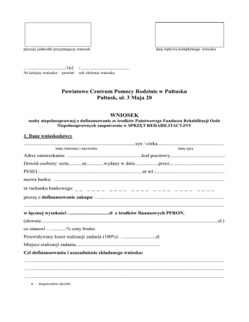 pieczęć jednostki przyjmującej wniosek data wpływu kompletnego wniosku …............................./161 /....................................... Nr kolejny wniosku/ rok złożenia wniosku powiat/ Powiatowe Centrum Pomocy Rodzinie w Pułtusku Pułtusk, ul. 3 Maja 20 WNIOSEK osoby niepełnosprawnej o dofinansowanie ze środków Państwowego Funduszu Rehabilitacji Osób Niepełnosprawnych zaopatrzenia w SPRZĘT REHABILITACYJNY 1. Dane wnioskodawcy .........................................................................................syn / córka..................................................... imię (imiona) i nazwisko imię ojca Adres zamieszkania: …........................................................kod pocztowy............................................ Dowód osobisty: seria...........nr..............wydany w dniu...................przez............................................ PESEL:..................................................................................nr tel.:....................................................... nazwa banku: …..................................................................................................................................... nr rachunku bankowego: _ _ ____ ____ ____ ____ ____ ____ proszę o dofinansowanie zakupu: …................................................................................................... …............................................................................................................................................................ w łącznej wysokości ….............................zł z środków finansowych PFRON. (słownie.............................................................................................................................................zł.) co stanowi …............% ceny brutto. Przewidywany koszt realizacji zadania (100%): …........................zł. Miejsce realizacji zadania................................................................... Cel dofinansowania i uzasadnienie składanego wniosku: …............................................................................................................................................................ …............................................................................................................................................................ …............................................................................................................................................................ niepotrzebne skreślić 2. Dane przedstawiciela ustawowego (dla małoletniego wnioskodawcy), opiekuna prawnego lub pełnomocnika: .........................................................................................syn / córka..................................................... imię (imiona) i nazwisko imię ojca Adres zamieszkania: …........................................................kod pocztowy............................................ Dowód osobisty: seria...........nr...............wydany w dniu.................przez............................................. PESEL:.................................................................................nr tel.:....................................................... nazwa banku: …..................................................................................................................................... nr rachunku bankowego: _ ustanowiony _ ____ ____ ____ ____ ____ ____ opiekunem*/pełnomocnikiem* ….......................................postanowieniem Sądu Rejonowego z dnia...................................sygn.Akt..................................../ na mocy pełnomocnictwa potwierdzonego przez Notariusza..................................................... z dnia …........................... repet. Nr …....................................... Informacje o wnioskodawcy: I. Stopień niepełnosprawności lub jego odpowiednik (proszę zaznaczyć właściwą rubrykę X ): 1. znaczny inwalidzki I grupy osoby całkowicie niezdolne do pracy i niezdolne do samodzielnej egzystencji osoby stałe lub długotrwale niezdolne do pracy w gospodarstwie rolnym, którym przysługuje zasiłek pielęgnacyjny osoby w wieku do lat 16 ( w przypadku pobierania nauki w szkole do 24 lat), którym przysługuje zasiłek pielęgnacyjny 2. umiarkowany inwalidzki II grupy osoby całkowicie niezdolne do pracy inwalidzki III grupy ze względu na głuchotę 3. lekki pozostali inwalidzi III grupy osoby częściowo niezdolne do pracy osoby stale lub długotrwale niezdolne do pracy w gospodarstwie rolnym II. Rodzaj niepełnosprawności (proszę zaznaczyć właściwą rubrykę X ): 1. dysfunkcja narządu ruchu z koniecznością poruszania się na wózku inwalidzkim 2. inna dysfunkcja narządu ruchu 3. dysfunkcja wzroku 4.dysfunkcja narządów słuchu i mowy 5. upośledzenie umysłowe 6.schorzenie neurologiczne 7. niepełnosprawność z ogólnego stanu zdrowia III. Sytuacja zawodowa wnioskodawcy (proszę zaznaczyć właściwą rubrykę X ): 1. zatrudniony* / prowadzący działalność gospodarczą* 2.osoba w wieku od 13 do 24 lat, ucząca się w systemie szkolnym lub studiująca* 3. bezrobotny poszukujący pracy* / rencista poszukujący pracy* 4. rencista* / emeryt* 5. dzieci i młodzież do 18 lat IV. Osoby pozostające we wspólnym gospodarstwie domowym wraz z wnioskodawcą ( w tym również osoby niepełnosprawne) Imię i nazwisko - pokrewieństwo niepełnosprawność stopień rodzaj Dochód miesięczny netto (zł) 1 2 3 4 5 6 7 V. Deklarowany udział własny wnioskodawcy: 1. deklarowany przez wnioskodawcę % pokrycia kosztów realizacji zadania …....% : …................ VI. Wcześniejsze korzystanie ze środków finansowych Państwowego Funduszu Rehabilitacji Osób Niepełnosprawnych (proszę zaznaczyć właściwą rubrykę X ): 1. korzystałem/am z dofinansowania do zaopatrzenia w sprzęt rehabilitacyjny Przedmiot dofi