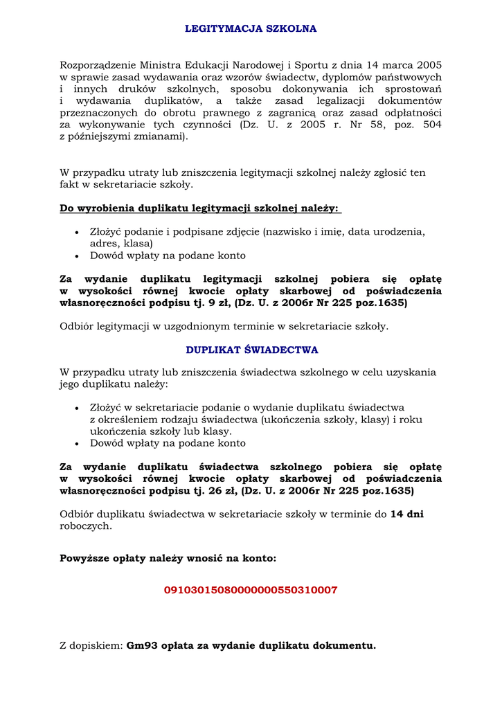 LEGITYMACJA SZKOLNA Rozporządzenie Ministra Edukacji Narodowej i Sportu z dnia 14 marca 2005 w sprawie zasad wydawania oraz wzorów świadectw, dyplomów państwowych i innych druków szkolnych, sposobu dokonywania ich sprostowań i wydawania duplikatów, a także zasad legalizacji dokumentów przeznaczonych do obrotu prawnego z zagranicą oraz zasad odpłatności za wykonywanie tych czynności (Dz. U. z 2005 r. Nr 58, poz. 504 z późniejszymi zmianami). W przypadku utraty lub zniszczenia legitymacji szkolnej należy zgłosić ten fakt w sekretariacie szkoły. Do wyrobienia duplikatu legitymacji szkolnej należy: Złożyć podanie i podpisane zdjęcie (nazwisko i imię, data urodzenia, adres, klasa) Dowód wpłaty na podane konto Za wydanie duplikatu legitymacji szkolnej pobiera się opłatę w wysokości równej kwocie opłaty skarbowej od poświadczenia własnoręczności podpisu tj. 9 zł, (Dz. U. z 2006r Nr 225 poz.1635) Odbiór legitymacji w uzgodnionym terminie w sekretariacie szkoły. DUPLIKAT ŚWIADECTWA W przypadku utraty lub zniszczenia świadectwa szkolnego w celu uzyskania jego duplikatu należy: Złożyć w sekretariacie podanie o wydanie duplikatu świadectwa z określeniem rodzaju świadectwa (ukończenia szkoły, klasy) i roku ukończenia szkoły lub klasy. Dowód wpłaty na podane konto Za wydanie duplikatu świadectwa szkolnego pobiera się opłatę w wysokości równej kwocie opłaty skarbowej od poświadczenia własnoręczności podpisu tj. 26 zł, (Dz. U. z 2006r Nr 225 poz.1635) Odbiór duplikatu świadectwa w sekretariacie szkoły w terminie do 14 dni roboczych. Powyższe opłaty należy wnosić na konto: 09103015080000000550310007 Z dopiskiem: Gm93 opłata za wydanie duplikatu dokumentu.