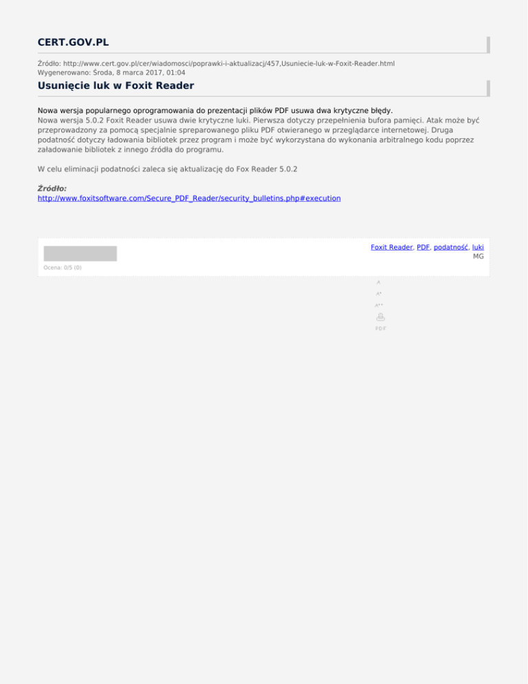 CERT.GOV.PL Źródło: http://www.cert.gov.pl/cer/wiadomosci/poprawki-i-aktualizacj/457,Usuniecie-luk-w-Foxit-Reader.html Wygenerowano: Środa, 8 marca 2017, 01:04 Usunięcie luk w Foxit Reader Nowa wersja popularnego oprogramowania do prezentacji plików PDF usuwa dwa krytyczne błędy. Nowa wersja 5.0.2 Foxit Reader usuwa dwie krytyczne luki. Pierwsza dotyczy przepełnienia bufora pamięci. Atak może być przeprowadzony za pomocą specjalnie spreparowanego pliku PDF otwieranego w przeglądarce internetowej. Druga podatność dotyczy ładowania bibliotek przez program i może być wykorzystana do wykonania arbitralnego kodu poprzez załadowanie bibliotek z innego źródła do programu. W celu eliminacji podatności zaleca się aktualizację do Fox Reader 5.0.2 Źródło: http://www.foxitsoftware.com/Secure_PDF_Reader/security_bulletins.php#execution Foxit Reader, PDF, podatność, luki MG Ocena: 0/5 (0)